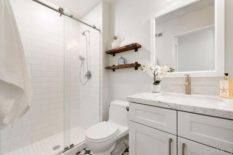 Welcome to resort style living! This remodeled and upgraded condo is perched on a hilltop looking east to Rancho Santa Fe and the mountains beyond. Located just 3.5 miles from the beach in the highly desirable Country View residential community (not age restricted) with luxurious amenities such as 2 pools with spas, an executive 9-hole golf course, pickle ball court, bocce ball court, and clubhouse that hosts regularly scheduled events. Walk-in access to Manchester Preserve hiking trails. This light and bright open floor plan features: - Vaulted ceilings and stunning panoramic views, - A fully updated functional kitchen with extra storage, quartz countertops, extra-large sink, - Meticulously crafted cabinets with soft close drawers, - Remodeled bathrooms with premium TOTO toilets & fixtures, and an extra deep soak tub, - Fresh interior paint and engineered wood flooring throughout, - Dual pane windows with upgraded window coverings, - Stackable LG washer and dryer units, - Energy-Efficient HVAC (Central Heating and Air) - A private balcony to enjoy for relaxing and entertaining, - One-car detached garage plus plenty of parking nearby. Conveniently located in Encinitas, just minutes away from grocery stores, restaurants, top rated schools, easy access to the freeway, shopping and all that the Southern California beach lifestyle affords! A must see!