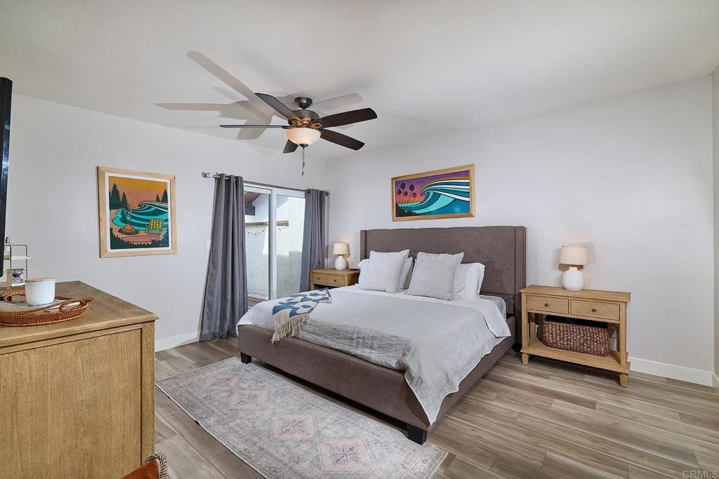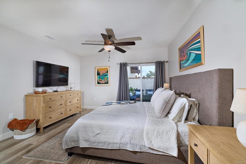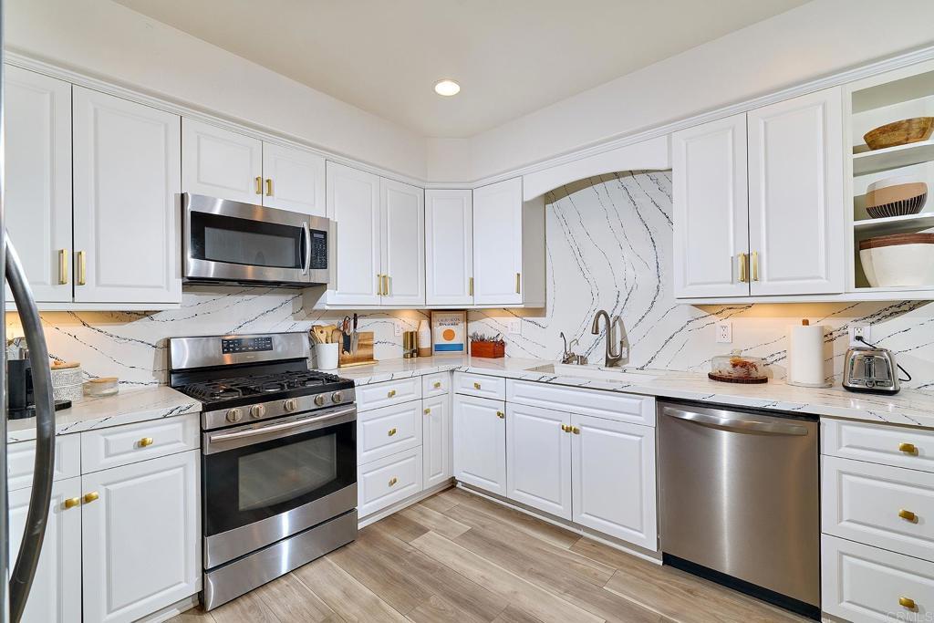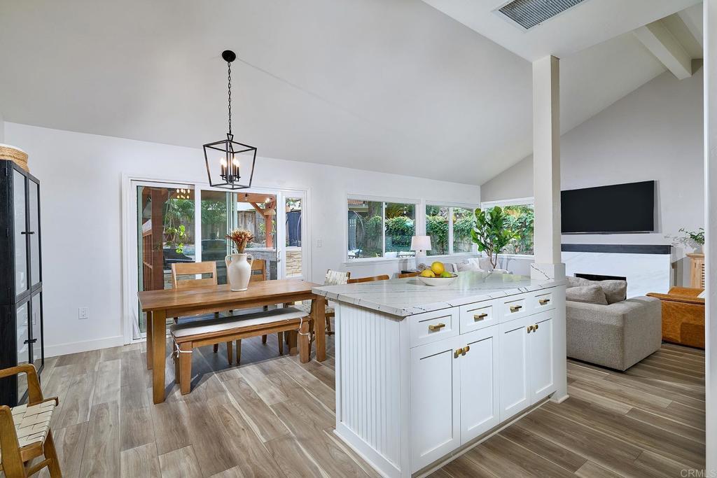 Rarely available updated single-level twin home in La Costa Meadows with NO HOA, connected by one shared wall and offering a light-filled layout with easy indoor–outdoor flow. Vaulted ceilings welcome you into the expansive living room, where luxury vinyl plank flooring spans the home, and a striking quartz fireplace surround creates a refined focal point. A wall of windows brings in natural light, enhanced by remote-controlled shades that add both comfort and convenience. The kitchen is thoughtfully designed with crisp white cabinetry, quartz countertops, a full-height quartz backsplash, stainless steel appliances, and a generous island with bar seating. An adjacent dining area opens directly to the backyard, creating an easy flow for everyday living and entertaining. Step outside to a newly built, covered outdoor kitchen that extends the living space and is designed for year-round enjoyment. This impressive space features quartz counters, bar seating, a Blackstone grill, barbecue, refrigerator, kegerator, and mounted TV, making it ideal for entertaining or unwinding. The backyard, framed by mature avocado and fruit trees, turf for easy maintenance, and layered landscaping, sets the stage for easy California living. The primary suite offers two closets along with direct access to a private patio. The updated en suite bath includes a dual-sink vanity and a spacious walk-in shower with frameless glass. Two additional bedrooms and an updated hall bath complete the well-designed floor plan. Additional highlights include rerouted plumbing, a whole-house fan, ceiling fans in all bedrooms, and a beautifully updated modern garage door that enhances the home’s curb appeal. Conveniently located near La Costa Meadows Elementary and just moments from shopping, dining, a movie theater, hiking trails, golf, the library, and a quick drive to the beach, making day-to-day living easy and convenient.