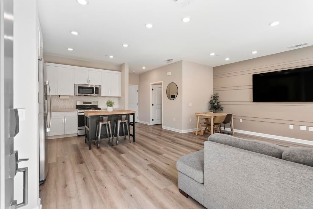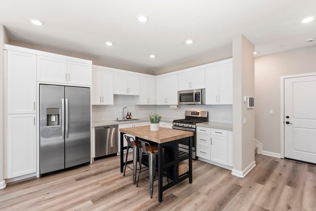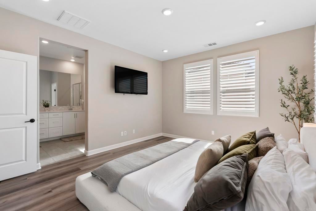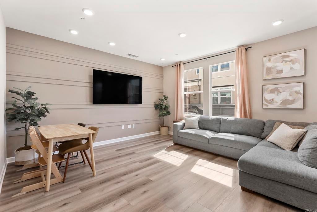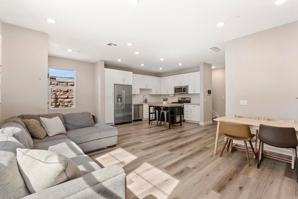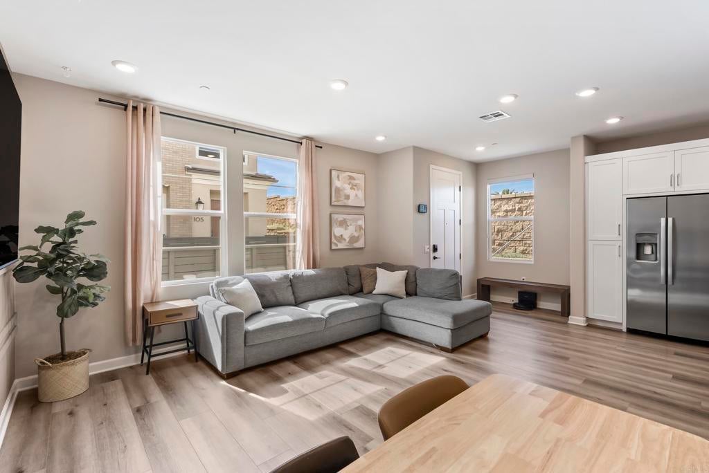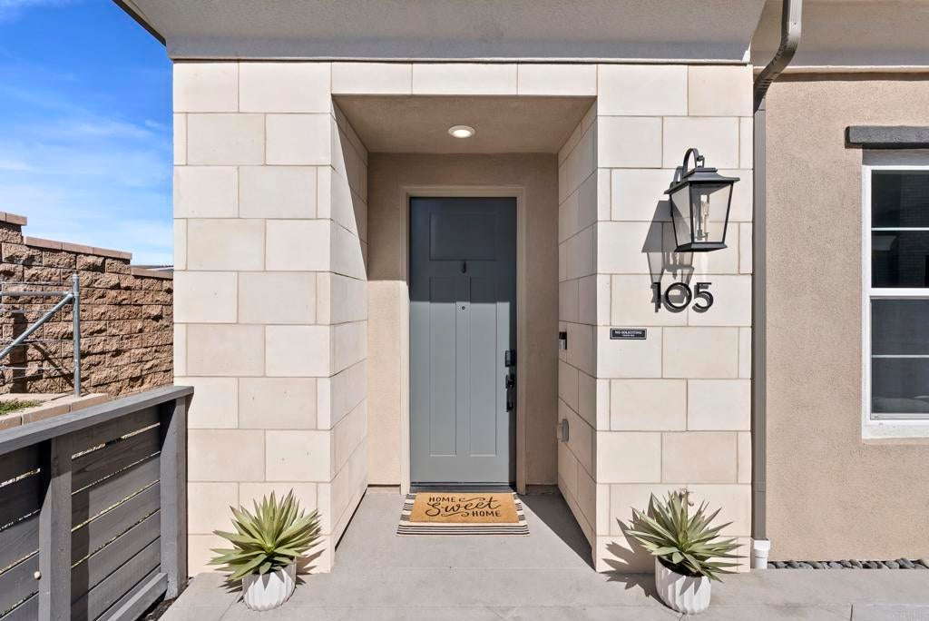 Welcome to this gorgeous 3-year-new end unit townhome in the sought after hill top community of Sunrise. Tucked along the western edge of the community, this home is light and bright with windows on 3 sides. A custom stamped concrete patio welcomes you to front the door and is the perfect spot to BBQ, play or relax outside. Inside, the 1st floor features an open-concept layout and a beautiful kitchen with white shaker cabinetry, sleek quartz countertops, upgraded tile backsplash and stainless steel appliances. Luxury vinyl plank flooring and custom accent wall add warmth to the main living area. A powder room and direct access two car garage with tankless water heater and EV Charging round out the first floor. Upstairs, upgraded carpeting and large stairwell windows lead to a versatile central loft, perfect for a home office, den, or playroom. The primary suite is a true retreat, offering abundant natural light, plantation shutters, a walk-in closet, and an en-suite bath with dual sinks. Two spacious secondary bedrooms, a generous hall bath, and a full size laundry room with upper and lower cabinetry complete the second level. The home includes a front door smart lock, ring doorbell and OWNED SOLAR PANELS for energy efficiency. Residents of Sunrise enjoy resort-style amenities, including a large heated pool and spa, BBQ area, showers and restrooms, and multiple tot lots for outdoor fun. This serene enclave of townhomes is located in a private gated neighborhood with a wonderful location. Less than three miles from CSUSM and close to Palomar Medical Center and Kaiser Hospital, this home is perfect for professionals, students, university staff, and healthcare workers seeking high-quality living in a peaceful setting. The best shopping and dining experiences are near by and there is easy access to major freeways. Come see it today!