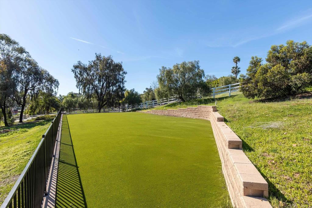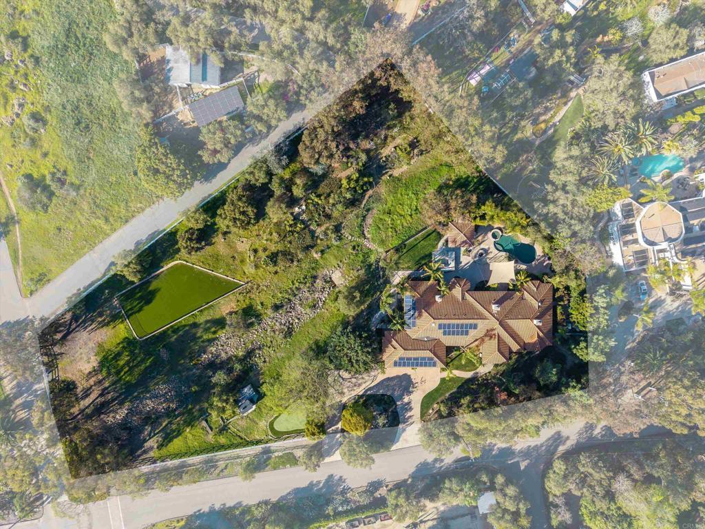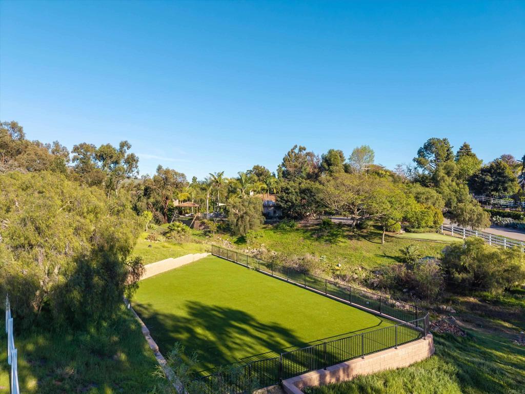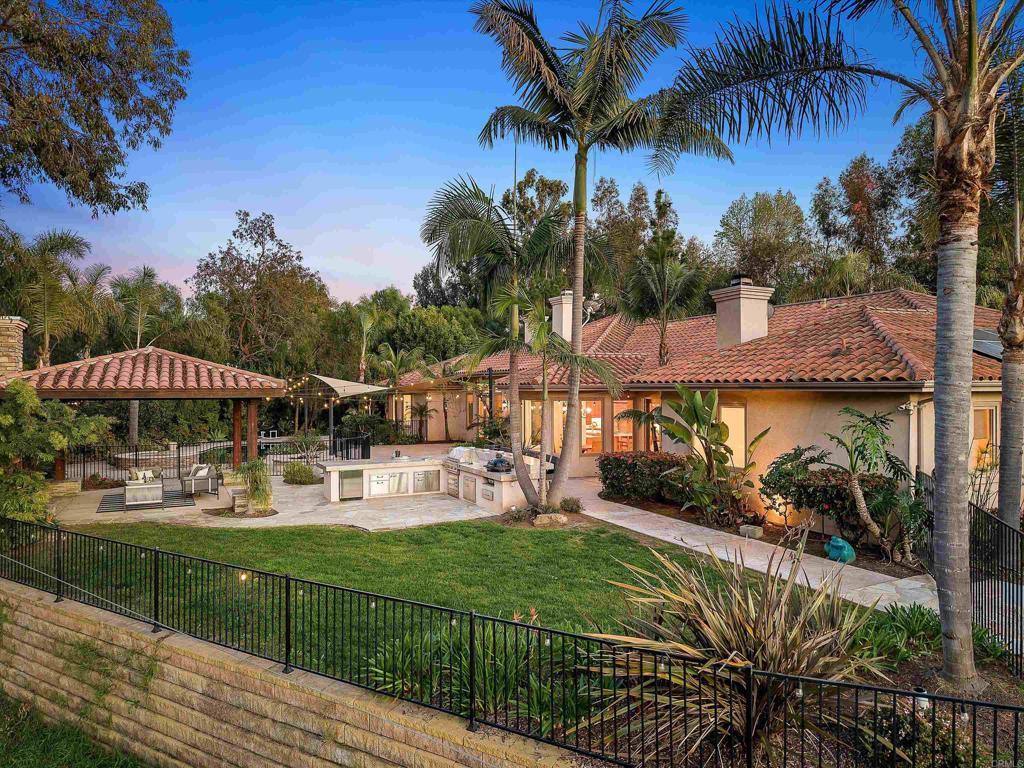 Tucked behind private gates in one of Encinitas' most coveted equestrian neighborhoods, this stunning single-level estate delivers the rare combination of refined interior living and resort-caliber outdoor entertaining — all on 2.59 sprawling acres with no monthly HOA fees. Soaring ceilings and abundant natural light welcome you from the moment you arrive. The open-concept floor plan flows seamlessly room to room, anchored by a chef's kitchen appointed with a professional Wolf range, side-by-side refrigerator/freezer, wine refrigerator, and warming drawer. Brand new carpet and wood floors run throughout, complemented by fresh paint that gives the entire home a crisp, move-in ready feel. 4 bedrooms plus a wainscoted office — ideal as a private study or work-from-home retreat — complete the thoughtfully designed interior. Step outside and discover a backyard that rivals the finest resorts. The outdoor living room sets the stage for effortless entertaining, anchored by a grand BBQ island with marble countertops, a Lynx grill, and dedicated smoker. Romantic string lights and a stylish sun shade create the perfect ambiance from afternoon to evening. The sparkling saltwater pool, lush grass lawn, and a brand new artificial turf sports field — ideal for soccer, lacrosse, and active play — offer something for everyone. Horse zoning adds the rare potential to create your own private equestrian retreat. The home's 42-panel paid solar system dramatically reduces energy costs, a whole-home water filtration system ensures clean drinking water, and the oversized four-car garage delivers exceptional storage and flexibility. Every upgrade has been executed with purpose. Served by the award-winning Encinitas Union School District and the highly sought-after Olivenhain Pioneer Elementary, with top-rated middle and high schools rounding out an exceptional educational pathway. All of this — gated privacy, 2.59 acres, luxury finishes, and equestrian zoning — just minutes from the beaches, boutiques, and dining of downtown Encinitas.