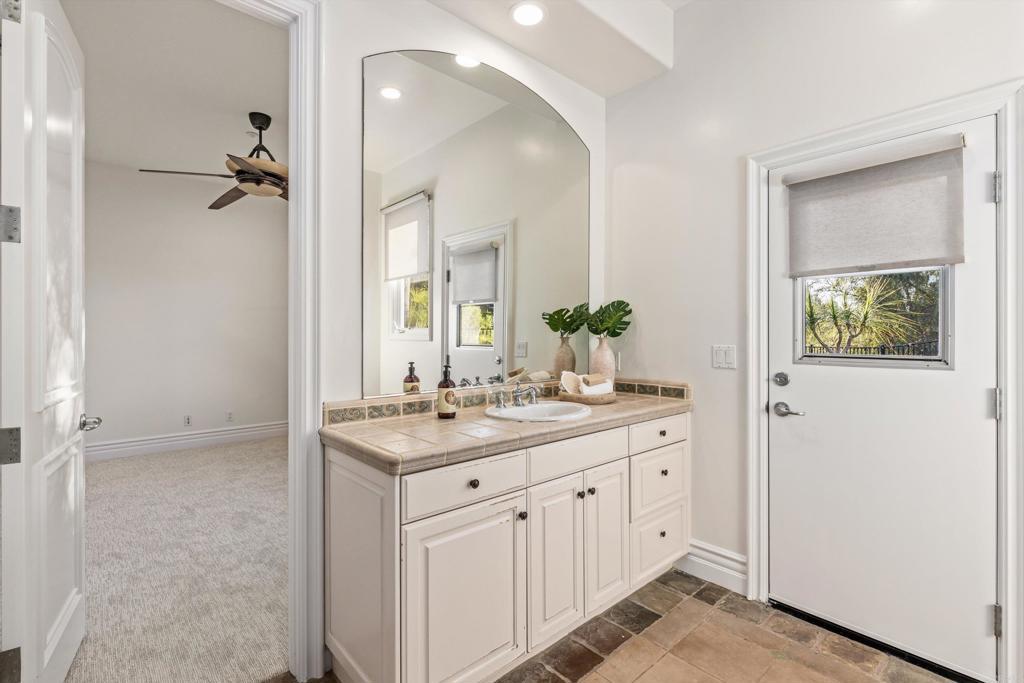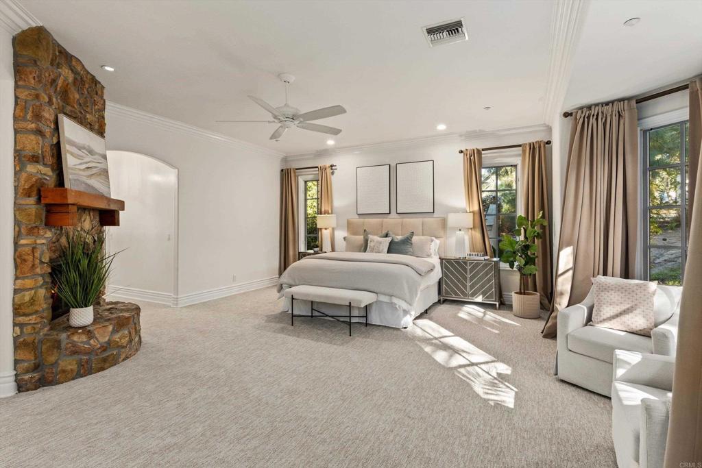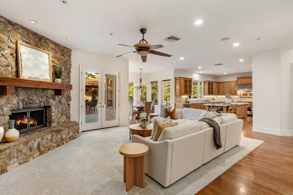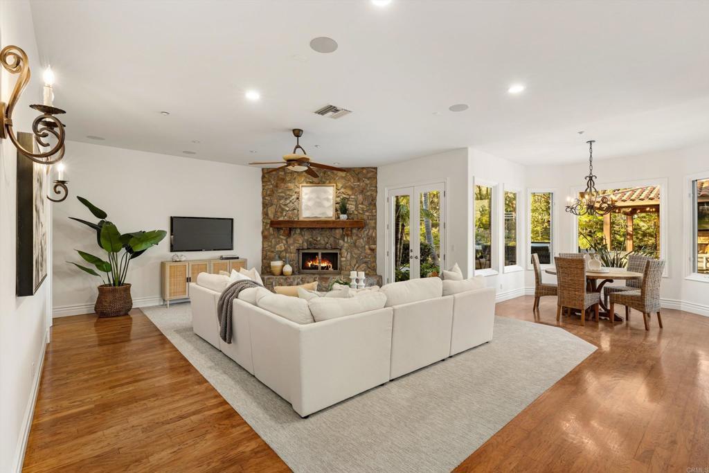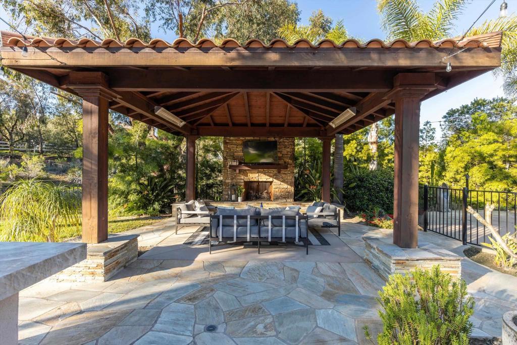 Tucked behind private gates in one of Encinitas' most coveted equestrian neighborhoods, this stunning single-level estate delivers the rare combination of refined interior living and resort-caliber outdoor entertaining — all on 2.59 sprawling acres with no monthly HOA fees. Soaring ceilings and abundant natural light welcome you from the moment you arrive. The open-concept floor plan flows seamlessly room to room, anchored by a chef's kitchen appointed with a professional Wolf range, side-by-side refrigerator/freezer, wine refrigerator, and warming drawer. Brand new carpet and wood floors run throughout, complemented by fresh paint that gives the entire home a crisp, move-in ready feel. 4 bedrooms plus a wainscoted office — ideal as a private study or work-from-home retreat — complete the thoughtfully designed interior. Step outside and discover a backyard that rivals the finest resorts. The outdoor living room sets the stage for effortless entertaining, anchored by a grand BBQ island with marble countertops, a Lynx grill, and dedicated smoker. Romantic string lights and a stylish sun shade create the perfect ambiance from afternoon to evening. The sparkling saltwater pool, lush grass lawn, and a brand new artificial turf sports field — ideal for soccer, lacrosse, and active play — offer something for everyone. Horse zoning adds the rare potential to create your own private equestrian retreat. The home's 42-panel paid solar system dramatically reduces energy costs, a whole-home water filtration system ensures clean drinking water, and the oversized four-car garage delivers exceptional storage and flexibility. Every upgrade has been executed with purpose. Served by the award-winning Encinitas Union School District and the highly sought-after Olivenhain Pioneer Elementary, with top-rated middle and high schools rounding out an exceptional educational pathway. All of this — gated privacy, 2.59 acres, luxury finishes, and equestrian zoning — just minutes from the beaches, boutiques, and dining of downtown Encinitas.