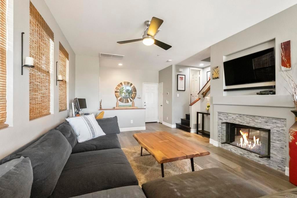 Prime Encinitas location in the desirable Saxony community! This elevated end-unit townhome offers 3 bedrooms, 3 bathrooms, and an attached 2-car garage. Ideally situated next to the YMCA and across from Coastal Roots Farm, just minutes to Moonlight Beach, downtown Encinitas, and the Coaster for convenient commuting. The open-concept floor plan features a spacious living room with a cozy fireplace, flowing seamlessly into the dining area and remodeled kitchen. Beautiful wood-look tile flooring runs throughout the main living areas, ideal for coastal living and sandy toes. The kitchen is thoughtfully updated with quartz countertops, stainless steel appliances, abundant cabinetry, and a gas range, and opens directly to the west-facing rear yard, creating effortless indoor-outdoor living and the perfect setting for sunset BBQs. All bedrooms are situated upstairs, highlighted by the primary ensuite with vaulted ceilings, dual sinks, and a sliding glass door leading to a private balcony with ocean views. Enjoy resort-style amenities including a community pool and spa — all in a prime coastal location close to beaches, shopping, dining, and transportation.