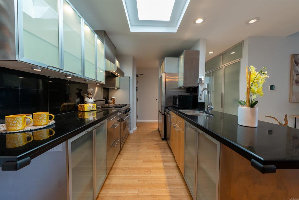 Top-floor contemporary condo in the heart of Mission Valley offering style, comfort, and valley views. The 1-bedroom, 1-bath residence spans approximately 700 square feet and features vaulted ceilings in both the living room and bedroom—an exclusive benefit of its premier top-floor location in a three-story building. Beautifully upgraded just a few years ago, the home showcases bamboo flooring throughout, a stunning custom-designed walk-in shower, and a remodeled kitchen complete with a Viking stove. Natural light fills the space through multiple skylights enhancing the open and airy feel. The living room centers around a cozy gas fireplace with smart home controls for lighting and fireplace operation, and opens to a private deck/balcony—perfect for enjoying Mission Valley views and evening city lights. Additional highlights include central heating and air conditioning, an EV charger at the assigned covered parking space. The building offers elevator access for added convenience. Residents enjoy resort-style amenities including a swimming pool, spa, tennis and pickleball courts, basketball court, fitness center, and a recreation room with two pool tables. Ideally situated in the Fashion Valley area with quick access to Interstate 5 and Interstate 8, the central location offers close proximity to shopping, dining, and everything San Diego has to offer. Experience elevated Mission Valley living in this thoughtfully upgraded, move-in ready home.