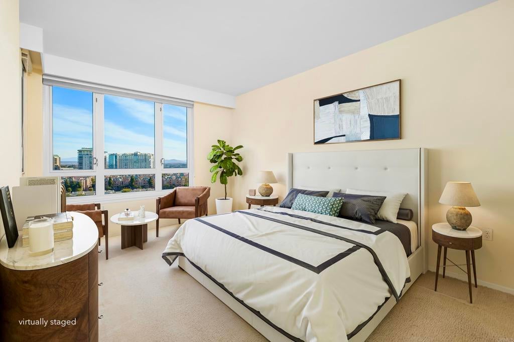 Residence #1402 is a 2BR 2BA 1,153 sq. ft. east-facing corner unit in Pacific Regent La Jolla, a 62+ independent living community. The unit has an open-concept layout, a spacious living room with a wall of windows and offers unobstructed views of the mountains and city skyline. It is equipped with central AC and heating. Pacific Regent La Jolla consists of 148 condominiums and offers resort-style amenities including 24/7 concierge and security, weekly one-hour housekeeping service, a heated indoor pool & spa, an on-site gourmet restaurant, a fitness center, a library, a beauty salon and an outdoor lounge. Residents have access to a full calendar of scheduled activities such as book clubs, Mahjong and Bridge clubs, daily movie nights, beach walks and cultural outings. The building includes 3 residential elevators, a private parking garage with EV charging stations, complimentary valet parking for residents and guests and scheduled transportation to medical centers, markets and local attractions. Monthly HOA dues cover dining credits, all utilities, high-speed internet, cable TV, landline service, water, trash and common area maintenance. Pacific Regent La Jolla is located between La Jolla and UTC near the UCSD medical campus, Westfield UTC shopping center, the Blue Trolley line and La Jolla beaches. It also offers convenient access to the 805 and 5 freeways. Grocery stores, banks and other conveniences are only a short distance away.