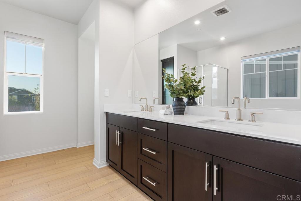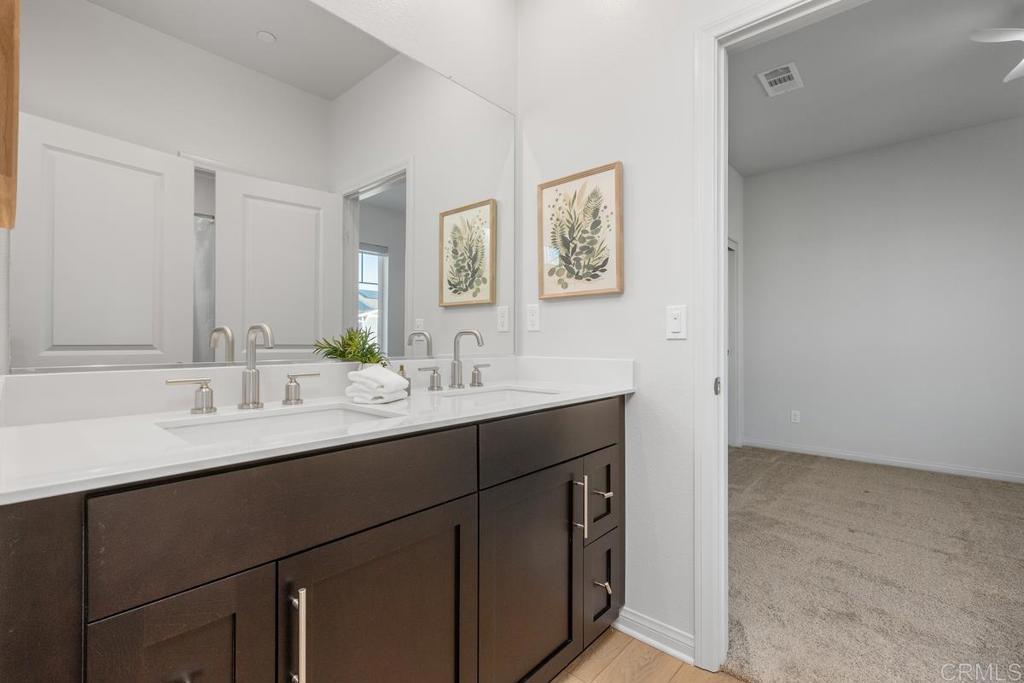 Experience an elevated lifestyle in this nearly-new, energy-efficient masterpiece. This 2-year-old turnkey smart home is a pristine residence packed with high-end upgrades, headlined by a fully PAID solar system, premium window coverings along with a tankless water heater. The open-concept main floor features luxury laminate flooring and a gourmet kitchen with a massive Quartz island, custom tile backsplash, and full stainless steel appliance package. Upstairs, find a versatile layout with luscious carpet, ceiling fans in all bedrooms, and a convenient laundry room. The Primary Suite offers dual vanities, a separate soaking tub/shower, and a walk-in closet. Fully tech-enabled with Schlage keyless entry, Eero router, and Ecobee thermostat. Private vinyl-fenced yard on one of the biggest lots in the community with finished hardscape; HOA maintains front landscaping. Located in the Rancho Buena Vista HS district with EZ access to Hwy 78, I-5, and I-15. Come see it today!