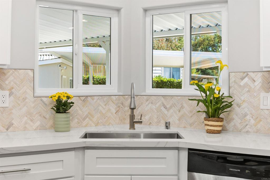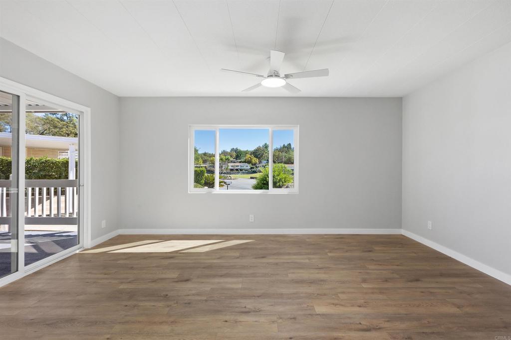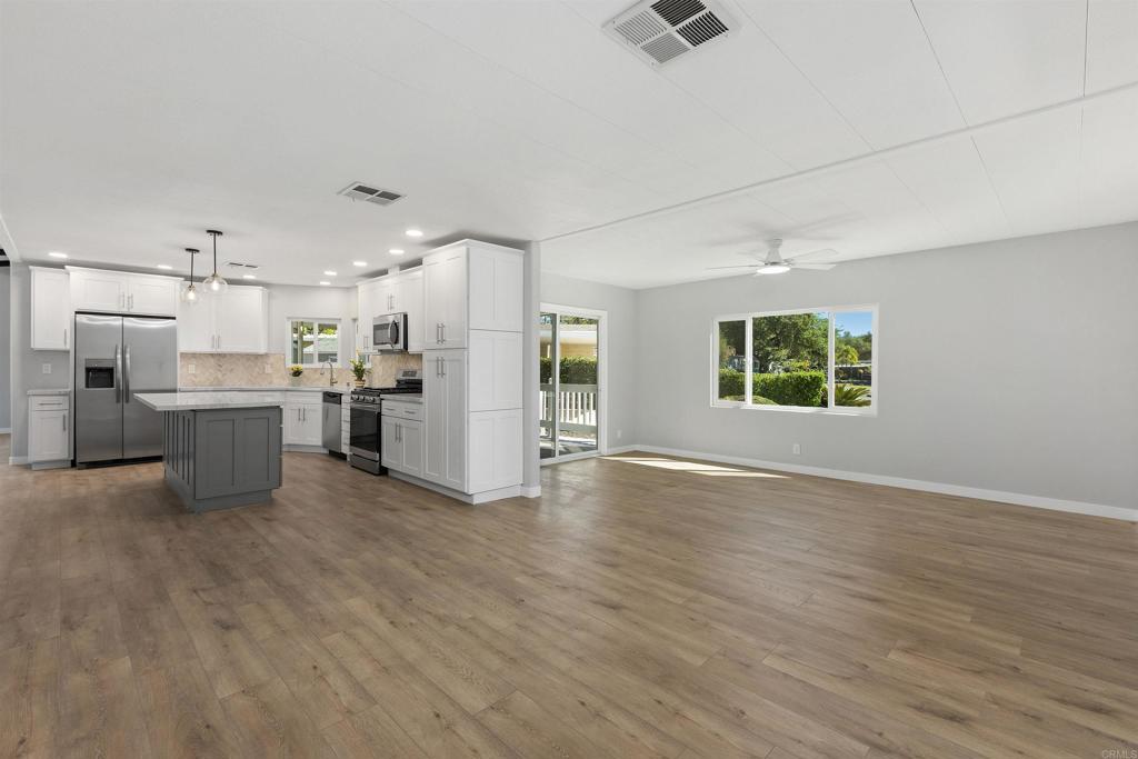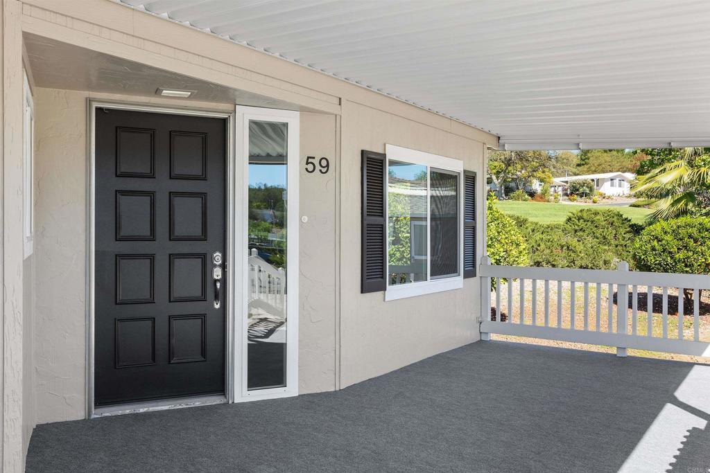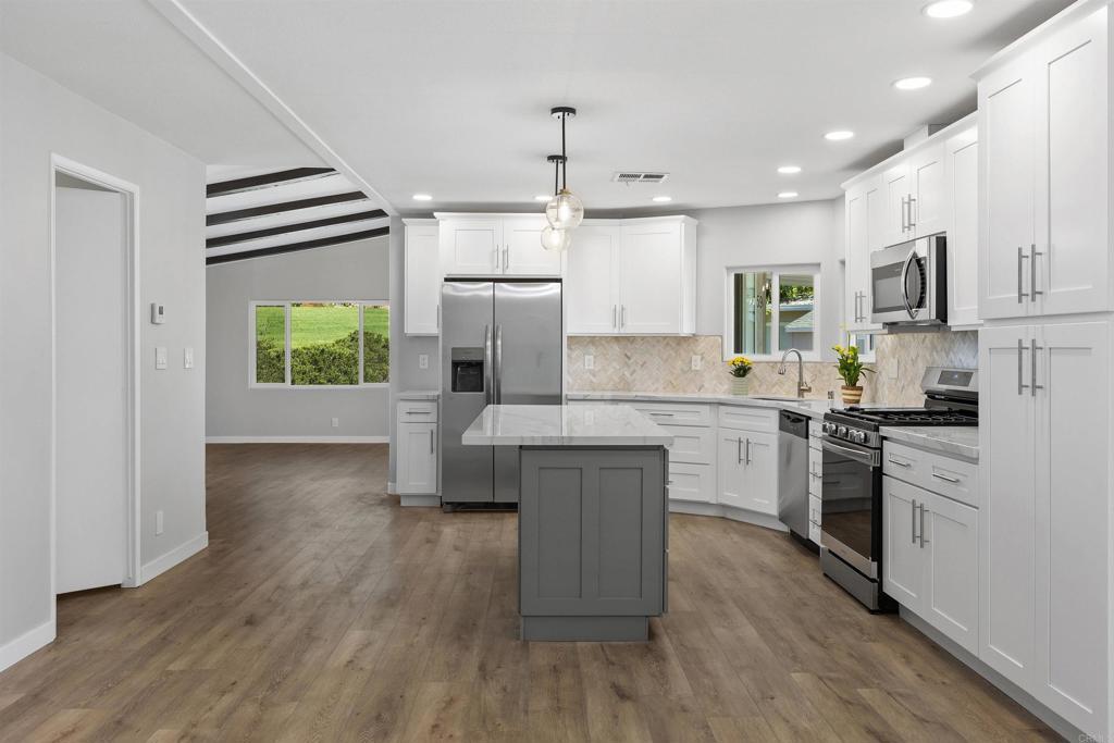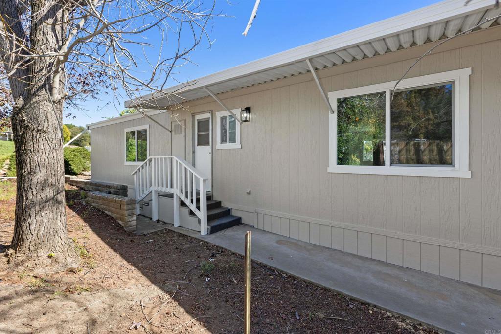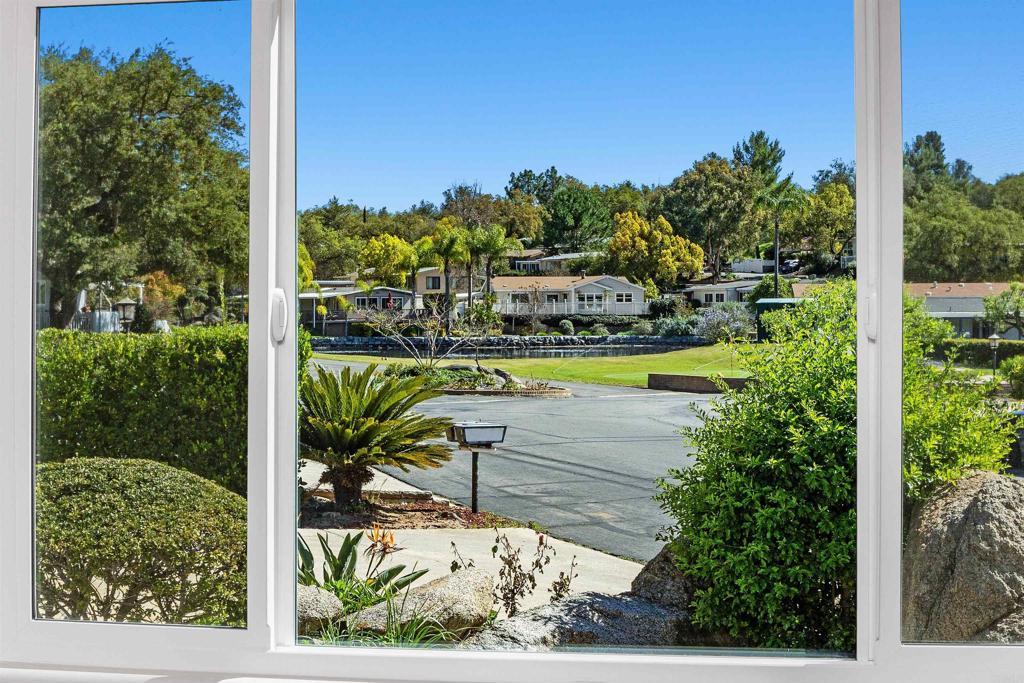 Welcome to Skyline Ranch Country Club, a desirable gated 55+ community in the peaceful rolling hills of Valley Center. This 1,680 square foot, 2 bedroom, 2 bathroom home has been completely remodeled and offers modern finishes, energy efficiency, and move-in ready comfort. Step inside to discover new luxury vinyl plank flooring throughout, freshly skimmed and painted walls, new double fire-rated energy-efficient windows and sliders, recessed lighting and a complete electrical re-wire. The fully remodeled kitchen is designed to impress with new shaker-style soft-close cabinets and drawers, quartz countertops, and a large center island with pendant lights. A complete stainless steel appliance package includes a brand-new refrigerator, microwave, dishwasher, and gas range. Additional upgrades include herringbone backsplash, a new single bowl stainless steel sink, garbage disposal, updated plumbing, and recessed lighting. Enjoy golf course views from the spacious living room and the adjacent dining area features a stylish new chandelier. The family room boasts spectacular views of the community pond and water feature along with a slider out to the front patio. The primary suite provides a relaxing retreat and features double-door entry, a walk-in closet, ceiling fan, slider out to a separate patio, and amazing views. The stunningly upgraded primary bathroom features a dramatic 9-foot custom tiled shower, a 60" designer soft-close vanity, new toilet, updated plumbing, custom recessed lighting, and a new energy-efficient privacy-glazed window. The spacious guest bedroom offers mirrored wardrobe doors and direct access to the remolded guest bathroom which features a brand-new tub and shower combination, designer vanity, new lighting, new toilet, and updated plumbing. Additional interior improvements include a dedicated laundry room with new soft-close cabinets and shelving for convenient storage as well as overhead ducting for central heat and A/C. Outside, the home has been refreshed with new skirting, leveled and braced piers and pads, and a fully repainted exterior. The covered front deck features new indoor/outdoor carpeting. The HVAC system and roof are approximately five years old, offering peace of mind for the new owner. The freshly painted carport accommodates 2 vehicles side-by-side with enough parking in the driveway for 2 more vehicles. The 2 sheds have also been painted and offer an abundance of storage. With a current space rent of $1,600 per month, residents of Skyline Ranch Country Club enjoy resort-style amenities including unlimited golf, two sparkling pools, a relaxing spa, a well-appointed clubhouse, a dog park, and a fully equipped fitness center. For those with a love of travel or outdoor recreation, onsite RV and boat storage is available for a nominal fee. Move-in ready and extensively upgraded, this home is a must-see!