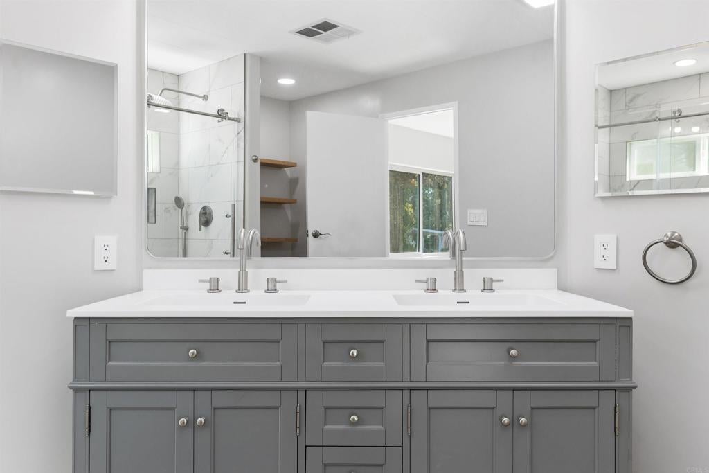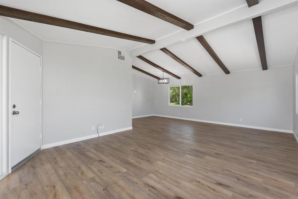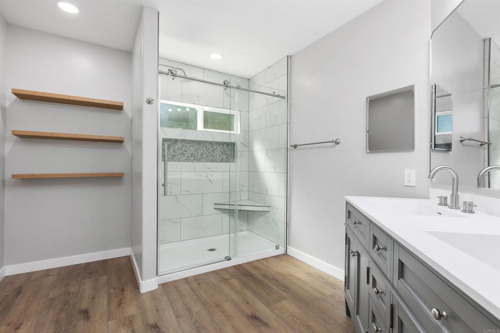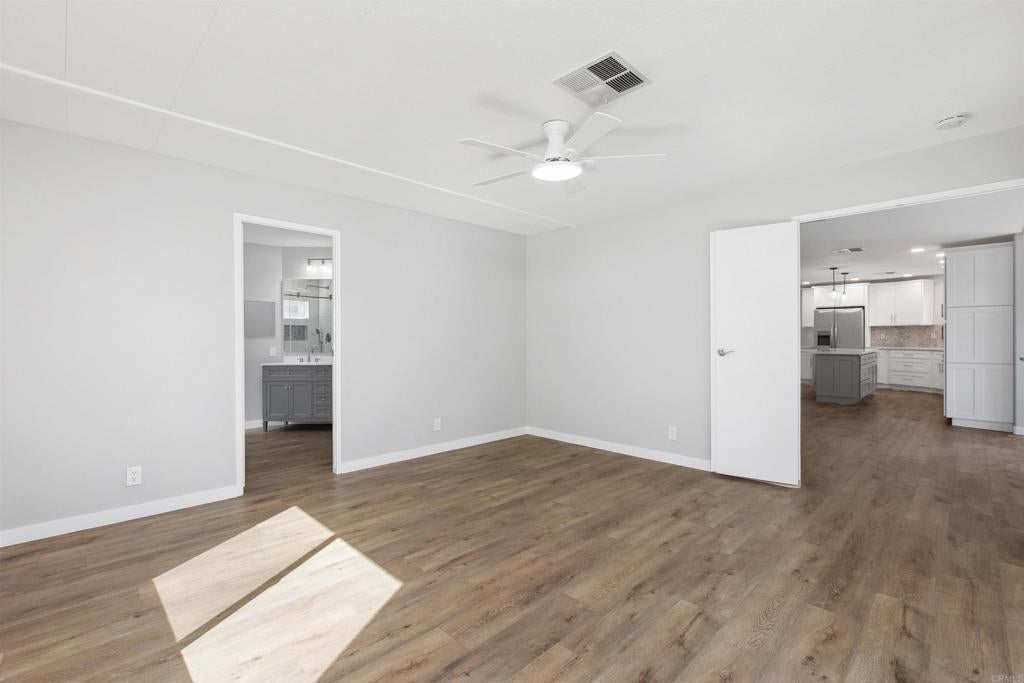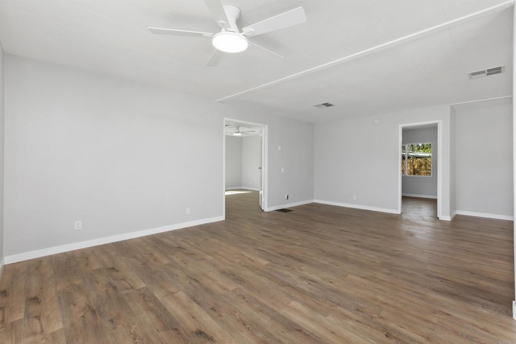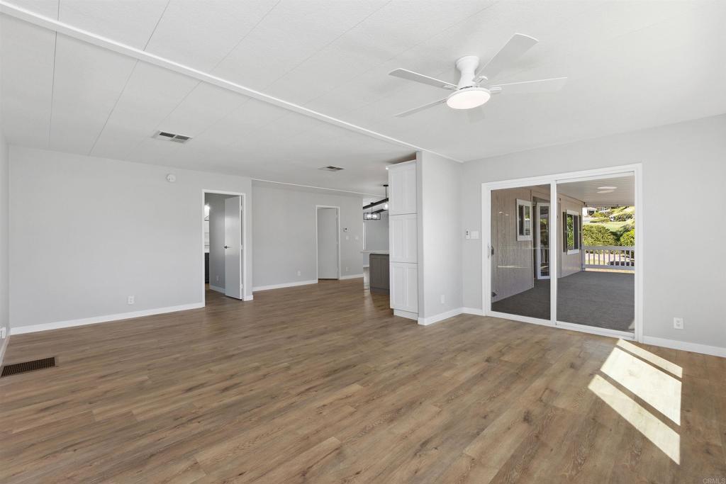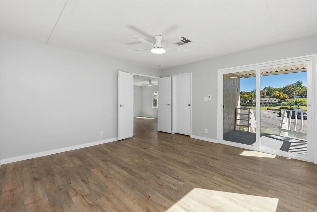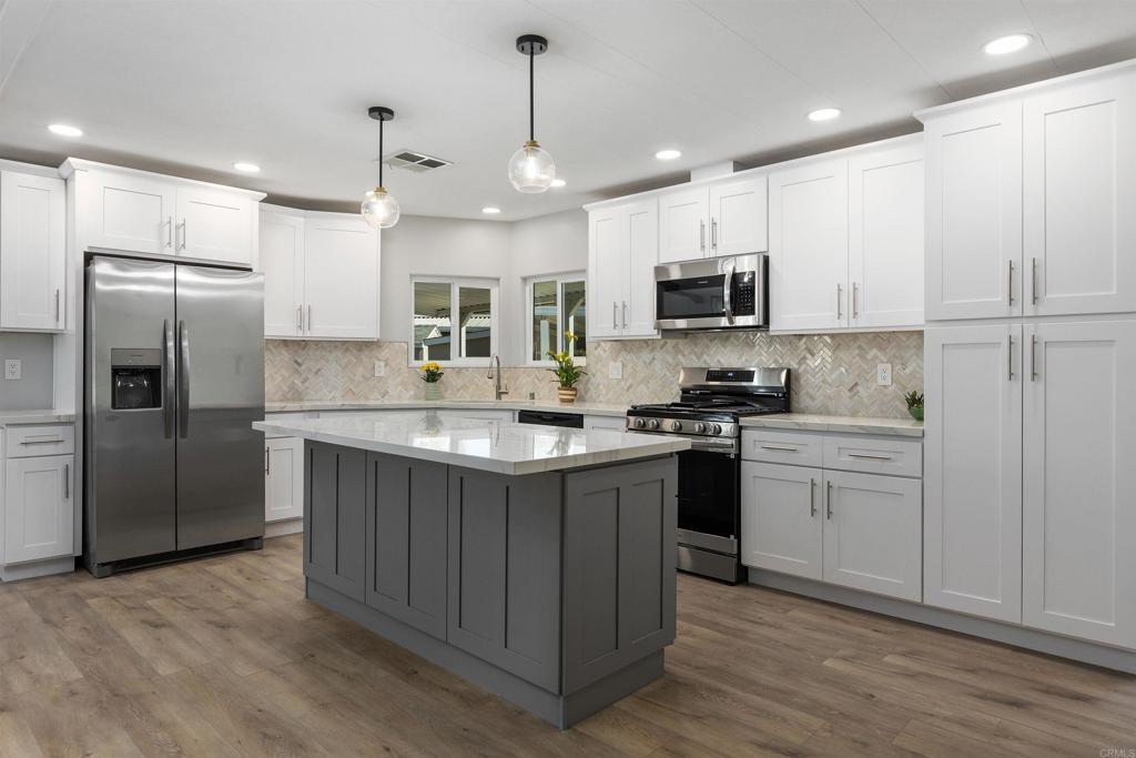 Welcome to Skyline Ranch Country Club, a desirable gated 55+ community in the peaceful rolling hills of Valley Center. This 1,680 square foot, 2 bedroom, 2 bathroom home has been completely remodeled and offers modern finishes, energy efficiency, and move-in ready comfort. Step inside to discover new luxury vinyl plank flooring throughout, freshly skimmed and painted walls, new double fire-rated energy-efficient windows and sliders, recessed lighting and a complete electrical re-wire. The fully remodeled kitchen is designed to impress with new shaker-style soft-close cabinets and drawers, quartz countertops, and a large center island with pendant lights. A complete stainless steel appliance package includes a brand-new refrigerator, microwave, dishwasher, and gas range. Additional upgrades include herringbone backsplash, a new single bowl stainless steel sink, garbage disposal, updated plumbing, and recessed lighting. Enjoy golf course views from the spacious living room and the adjacent dining area features a stylish new chandelier. The family room boasts spectacular views of the community pond and water feature along with a slider out to the front patio. The primary suite provides a relaxing retreat and features double-door entry, a walk-in closet, ceiling fan, slider out to a separate patio, and amazing views. The stunningly upgraded primary bathroom features a dramatic 9-foot custom tiled shower, a 60" designer soft-close vanity, new toilet, updated plumbing, custom recessed lighting, and a new energy-efficient privacy-glazed window. The spacious guest bedroom offers mirrored wardrobe doors and direct access to the remolded guest bathroom which features a brand-new tub and shower combination, designer vanity, new lighting, new toilet, and updated plumbing. Additional interior improvements include a dedicated laundry room with new soft-close cabinets and shelving for convenient storage as well as overhead ducting for central heat and A/C. Outside, the home has been refreshed with new skirting, leveled and braced piers and pads, and a fully repainted exterior. The covered front deck features new indoor/outdoor carpeting. The HVAC system and roof are approximately five years old, offering peace of mind for the new owner. The freshly painted carport accommodates 2 vehicles side-by-side with enough parking in the driveway for 2 more vehicles. The 2 sheds have also been painted and offer an abundance of storage. With a current space rent of $1,600 per month, residents of Skyline Ranch Country Club enjoy resort-style amenities including unlimited golf, two sparkling pools, a relaxing spa, a well-appointed clubhouse, a dog park, and a fully equipped fitness center. For those with a love of travel or outdoor recreation, onsite RV and boat storage is available for a nominal fee. Move-in ready and extensively upgraded, this home is a must-see!
