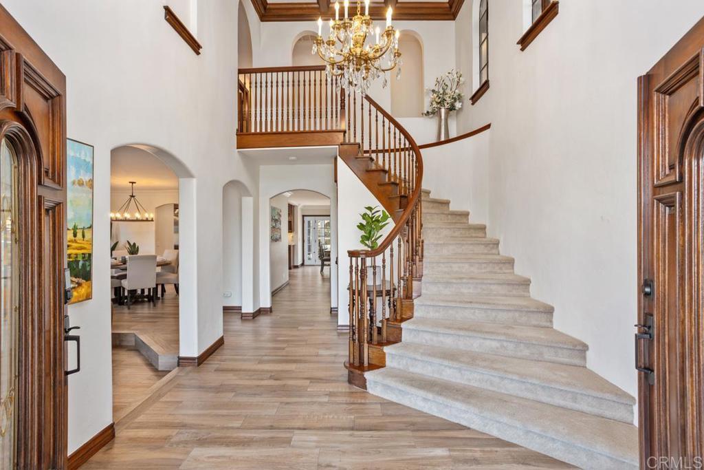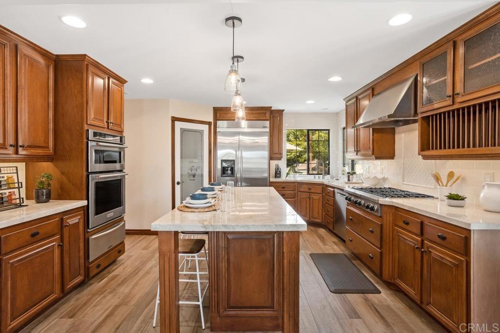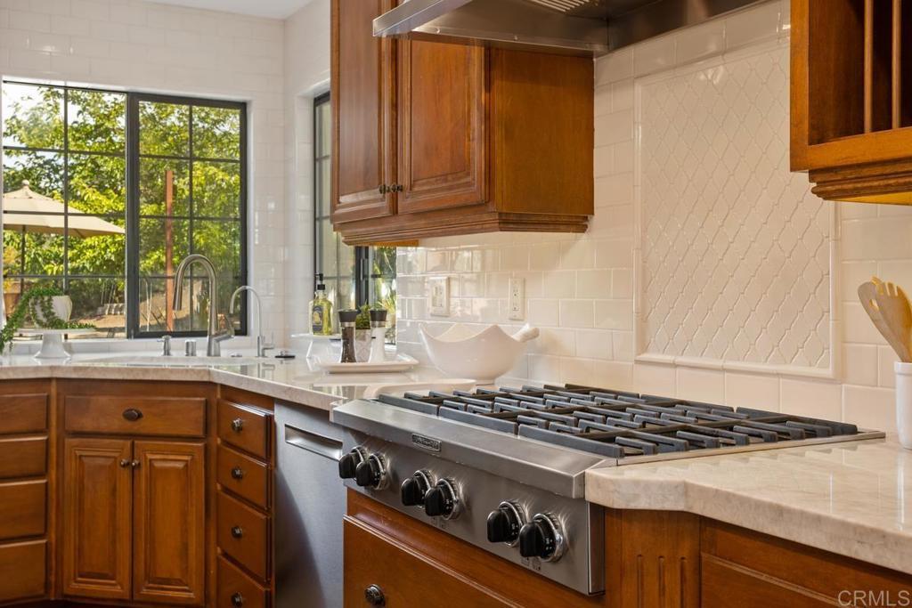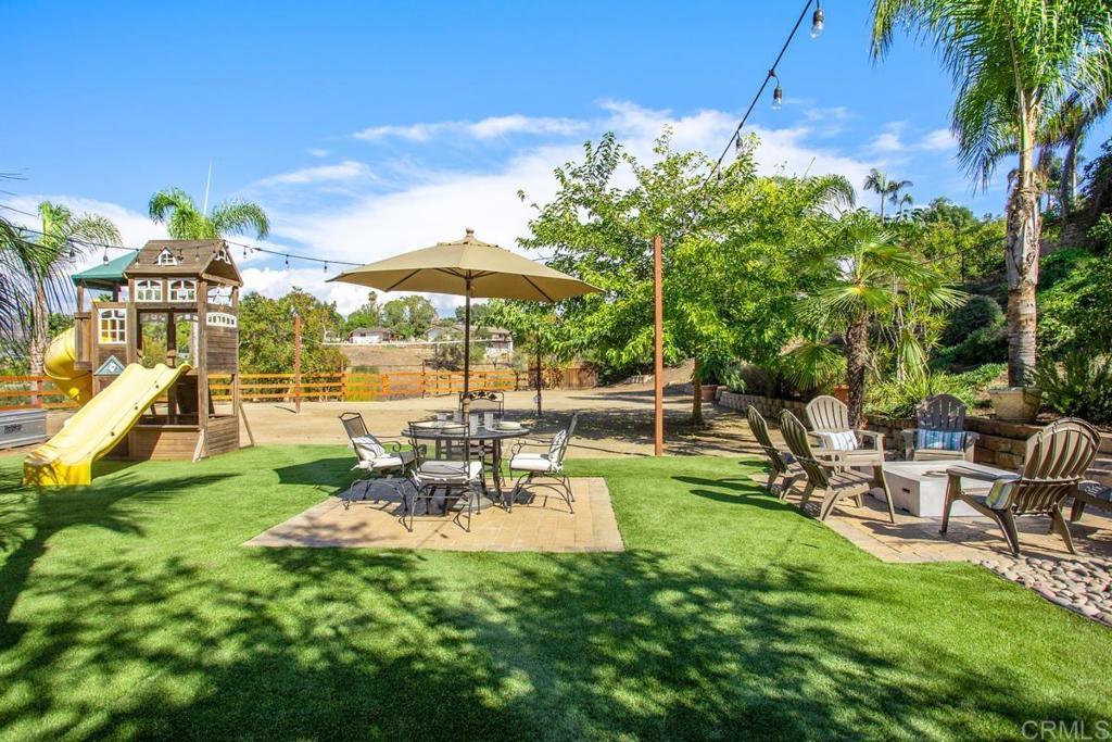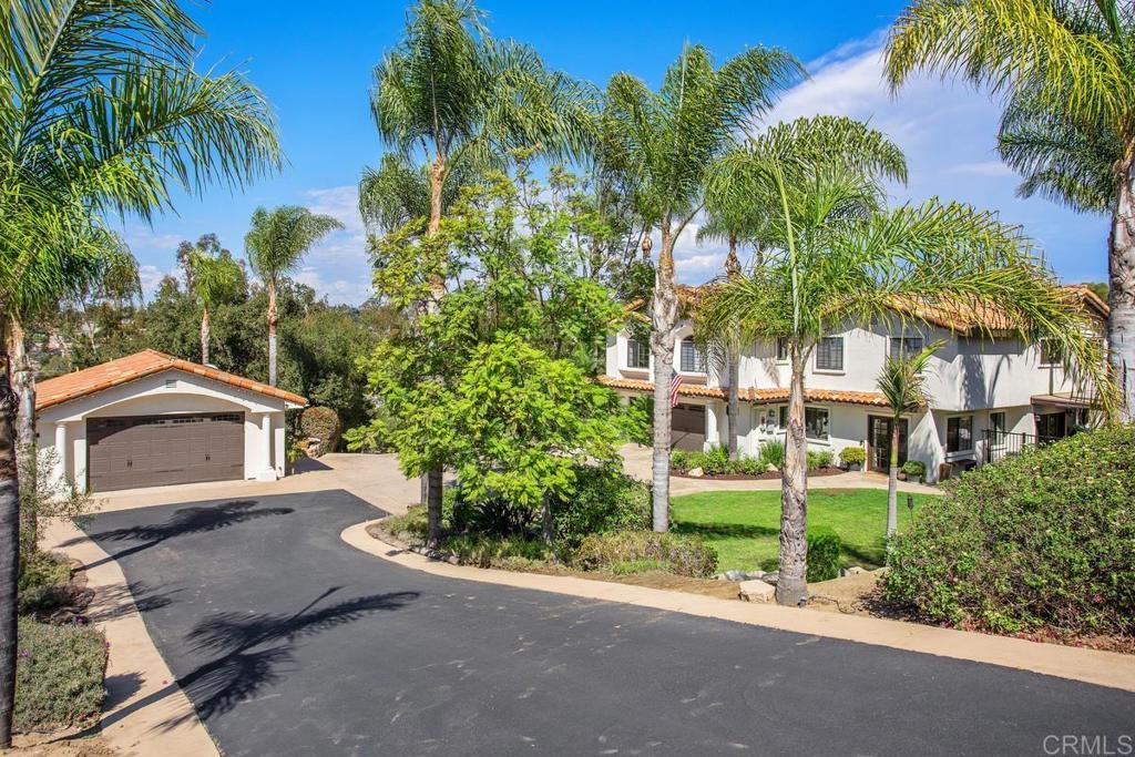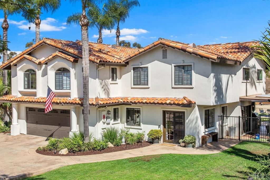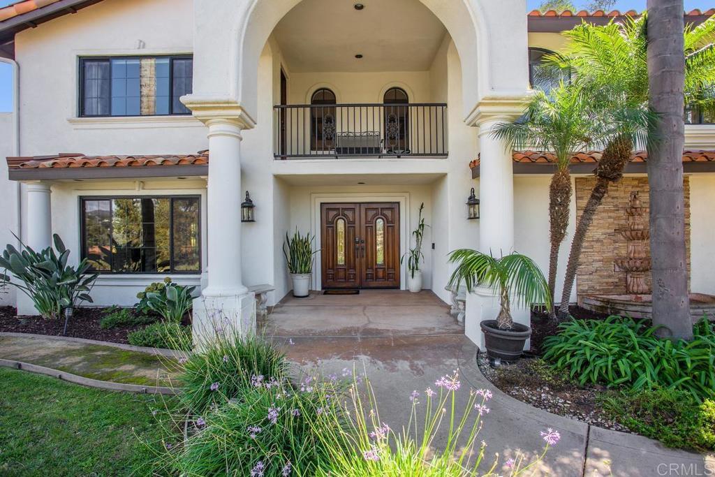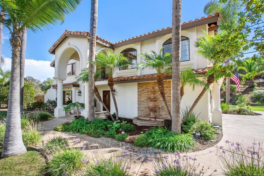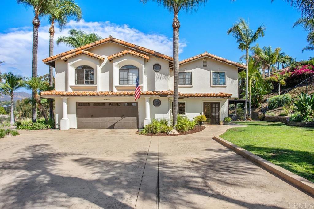 Welcome to this stunning Mediterranean-inspired 3,500 sq. ft. two-story home situated on a private ½-acre lot with beautiful sunset and rolling hill views in Vista. This fully remodeled 5-bedroom, 4-bathroom custom home offers both elegance and comfort. The gourmet kitchen features quartzite countertops, a large center island, and stainless steel appliances, perfect for everyday living and entertaining. A dramatic two-story foyer with double-door entry and a curved staircase leads into the spacious living and family room areas. Upstairs, the primary suite showcases vaulted ceilings and a spa-inspired bathroom with dual vanities, mirrored storage, a custom marble shower, and a freestanding soaking tub. A second primary suite includes its own bathroom, walk-in closet, and private deck access. Three additional bedrooms share a beautifully remodeled guest bathroom. Additional highlights include a second-floor laundry room with LG washer and dryer, abundant storage and workspace, plus a 2-car garage with epoxy flooring and driveway parking for three additional vehicles. Step through French doors to enjoy multiple outdoor entertaining areas and a lush tropical yard featuring two covered patios, natural gas barbecue, and a pergola seating area. Gardener and pest control services are included for easy maintenance. This beautifully renovated home offers space, luxury upgrades, and peaceful outdoor living in a desirable Vista location.