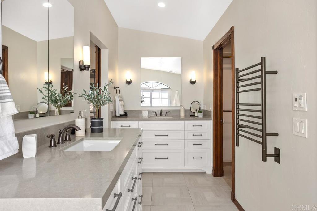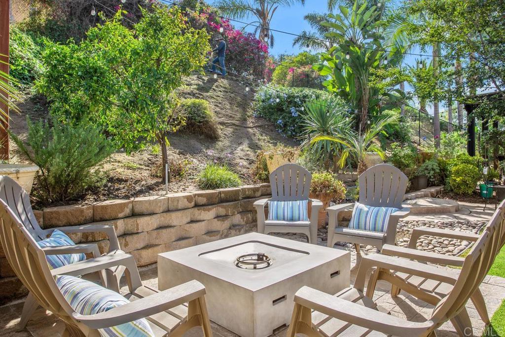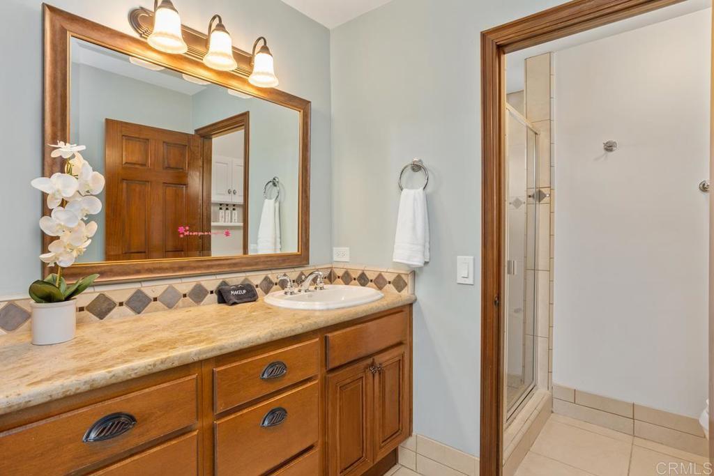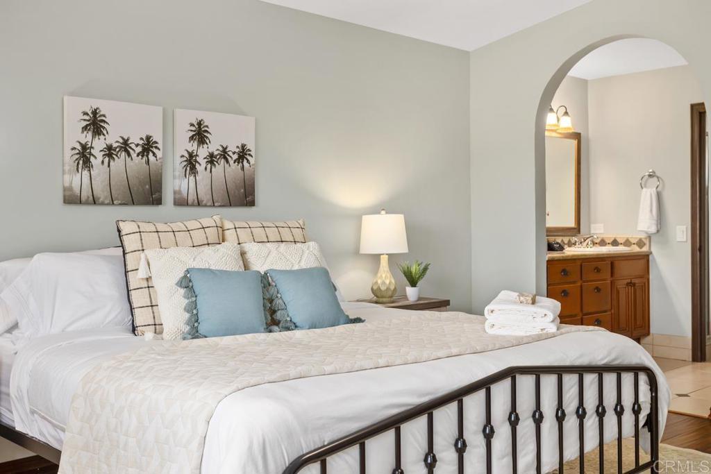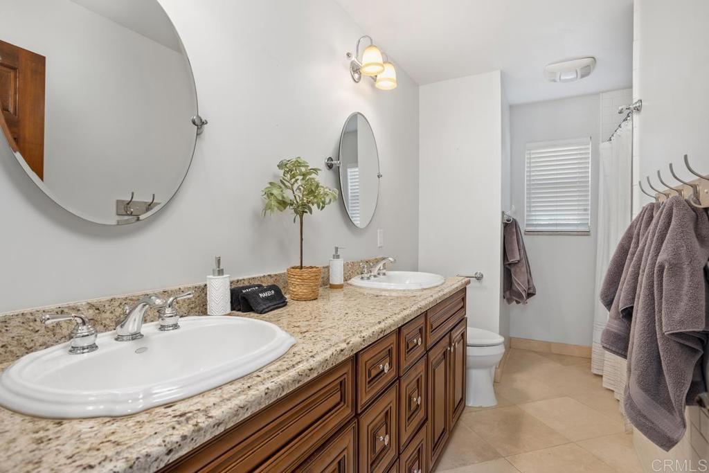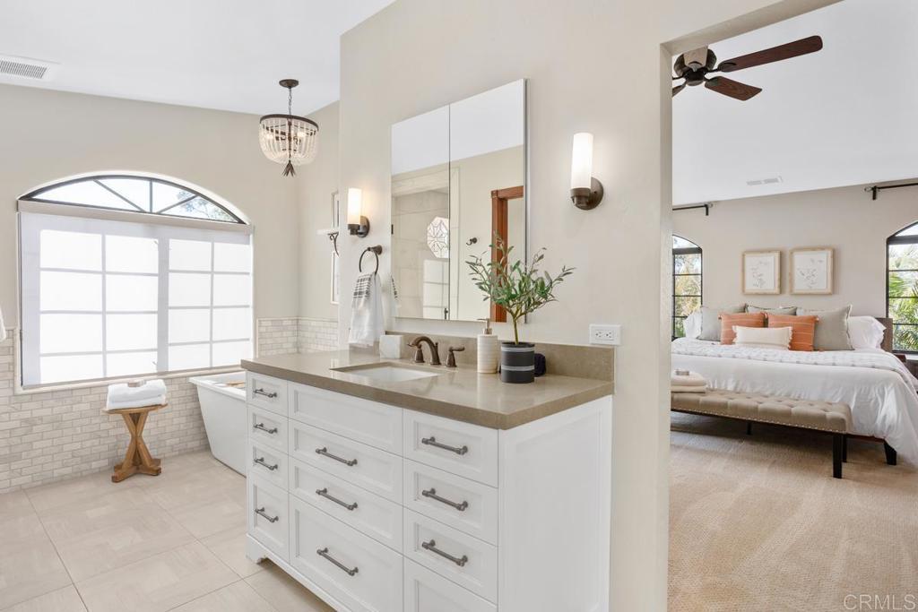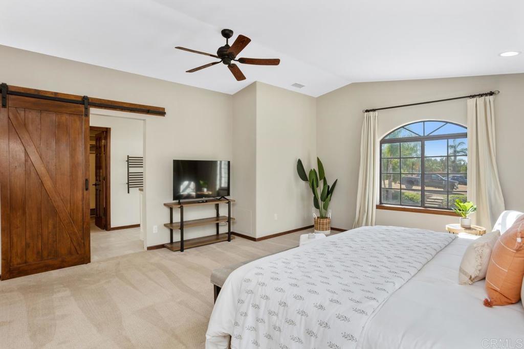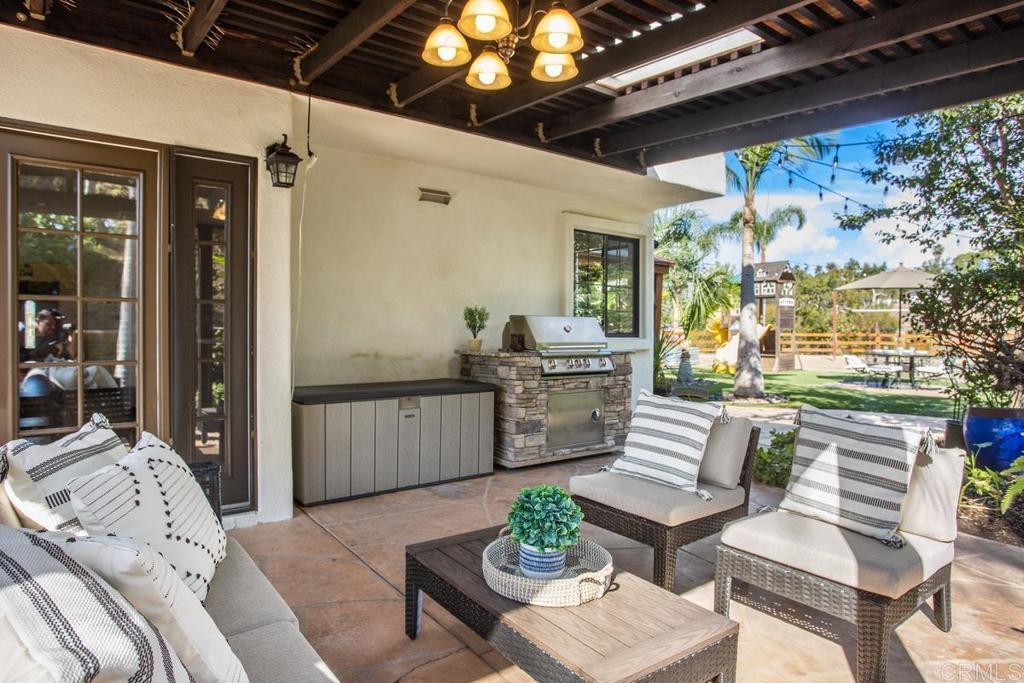 Welcome to this stunning Mediterranean-inspired 3,500 sq. ft. two-story home situated on a private ½-acre lot with beautiful sunset and rolling hill views in Vista. This fully remodeled 5-bedroom, 4-bathroom custom home offers both elegance and comfort. The gourmet kitchen features quartzite countertops, a large center island, and stainless steel appliances, perfect for everyday living and entertaining. A dramatic two-story foyer with double-door entry and a curved staircase leads into the spacious living and family room areas. Upstairs, the primary suite showcases vaulted ceilings and a spa-inspired bathroom with dual vanities, mirrored storage, a custom marble shower, and a freestanding soaking tub. A second primary suite includes its own bathroom, walk-in closet, and private deck access. Three additional bedrooms share a beautifully remodeled guest bathroom. Additional highlights include a second-floor laundry room with LG washer and dryer, abundant storage and workspace, plus a 2-car garage with epoxy flooring and driveway parking for three additional vehicles. Step through French doors to enjoy multiple outdoor entertaining areas and a lush tropical yard featuring two covered patios, natural gas barbecue, and a pergola seating area. Gardener and pest control services are included for easy maintenance. This beautifully renovated home offers space, luxury upgrades, and peaceful outdoor living in a desirable Vista location.