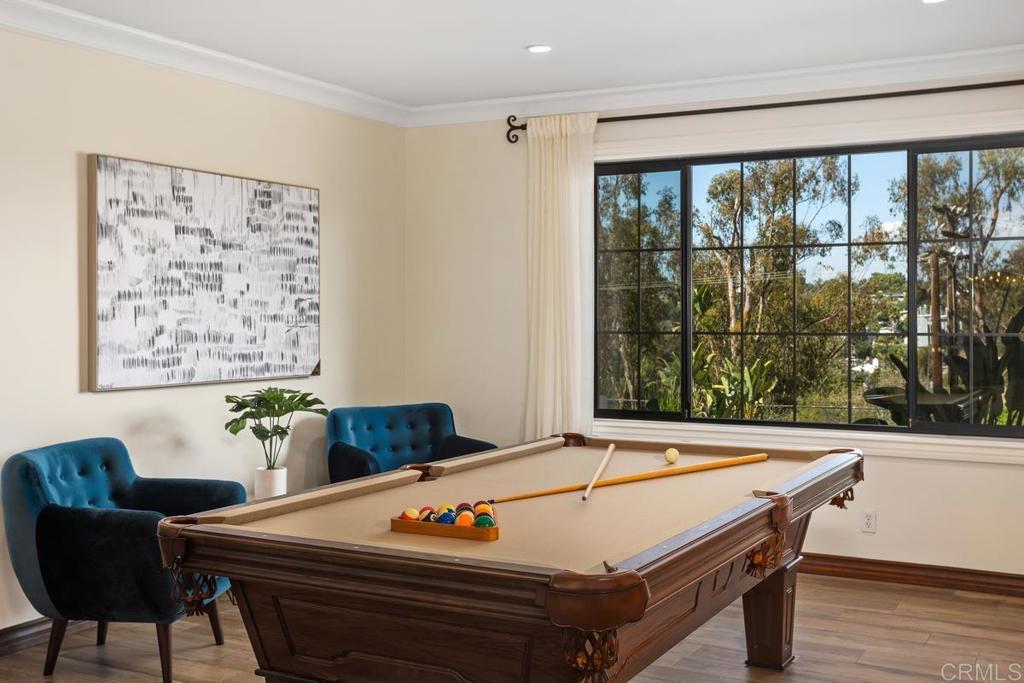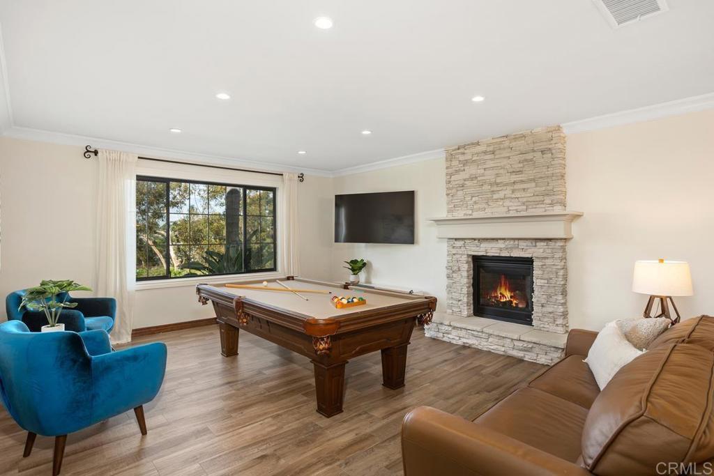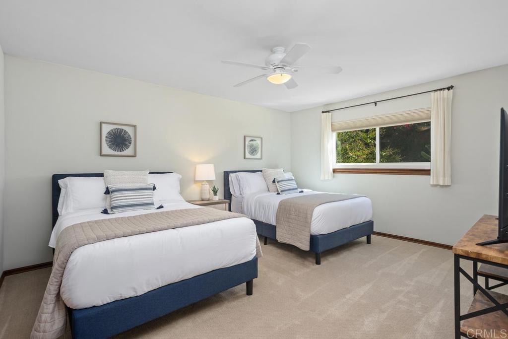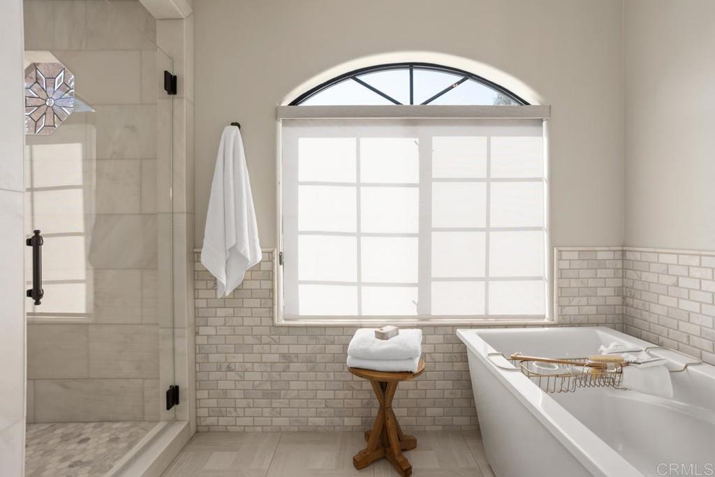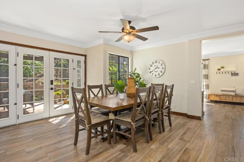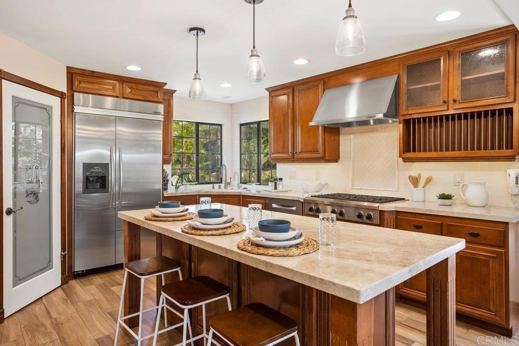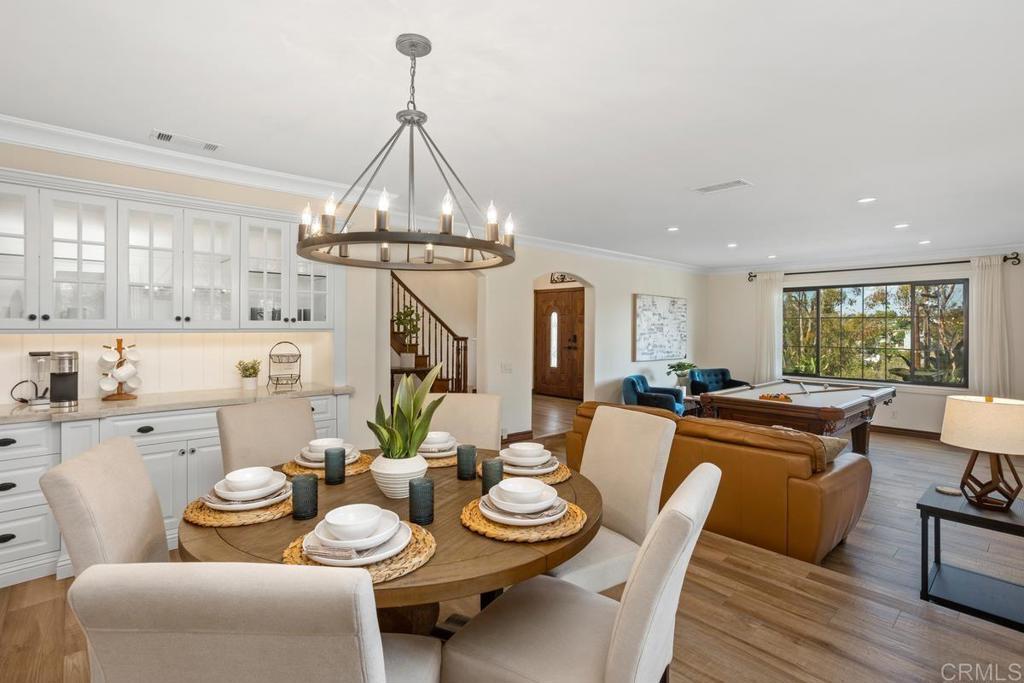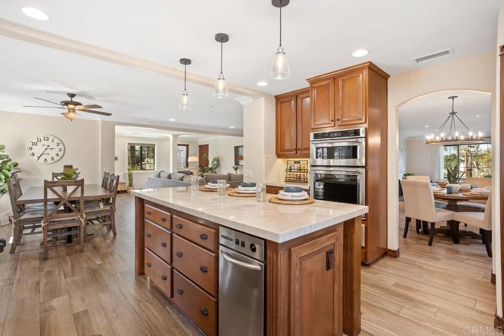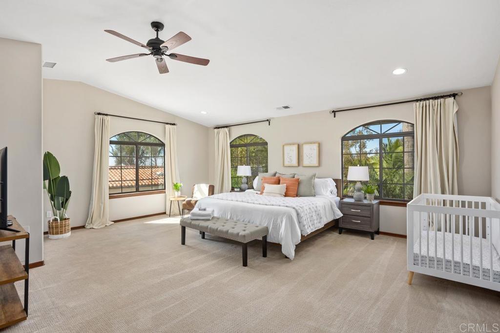 Welcome to this stunning Mediterranean-inspired 3,500 sq. ft. two-story home situated on a private ½-acre lot with beautiful sunset and rolling hill views in Vista. This fully remodeled 5-bedroom, 4-bathroom custom home offers both elegance and comfort. The gourmet kitchen features quartzite countertops, a large center island, and stainless steel appliances, perfect for everyday living and entertaining. A dramatic two-story foyer with double-door entry and a curved staircase leads into the spacious living and family room areas. Upstairs, the primary suite showcases vaulted ceilings and a spa-inspired bathroom with dual vanities, mirrored storage, a custom marble shower, and a freestanding soaking tub. A second primary suite includes its own bathroom, walk-in closet, and private deck access. Three additional bedrooms share a beautifully remodeled guest bathroom. Additional highlights include a second-floor laundry room with LG washer and dryer, abundant storage and workspace, plus a 2-car garage with epoxy flooring and driveway parking for three additional vehicles. Step through French doors to enjoy multiple outdoor entertaining areas and a lush tropical yard featuring two covered patios, natural gas barbecue, and a pergola seating area. Gardener and pest control services are included for easy maintenance. This beautifully renovated home offers space, luxury upgrades, and peaceful outdoor living in a desirable Vista location.