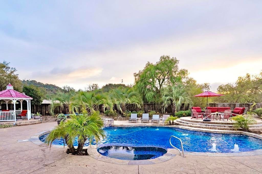 Enchantment in Valley Center! Ideally located in desirable WOODS VALLEY and framed by towering Cyprus trees, the motor court opens to this gorgeous villa and stunning resort like grounds. The fabulous flowing floor plan was built for comfort with large rooms, an island kitchen that is open to the family room and fireplace. Engaging entertainment areas include an elegant formal dining room and social billiards room. The main bedroom is truly a relaxing retreat with distant views of the scenery. Besides the upstairs 3 bedrooms, there is a downstairs bedroom and bath. LIFESTYLE IS KEY HERE! A resort like backyard includes free form pool & spa, raised fireplace deck, lounging areas, barbecue bar, and a charming gazebo, plus winding paths and privacy. Nearby NATIVE OAKS GOLF COURSE is an impeccably maintained public course and offers tournaments, celebrations and unique TRACK-MAN powered driving range. Solar panel system is owned and paid for. Near Native Oaks Golf Club • Pool, spa, gazebo, and outdoor fireplace • Owned solar system and EV charger Located in the Woods Valley community, this two-story home offers approximately 3,777 sq ft with 4 bedrooms and 3 bathrooms on an approximately 0.49-acre lot. Interior features include an island kitchen open to the family room with fireplace, formal dining room, dedicated game room, and flexible office space. A guest bedroom and full bathroom are located on the main level, with additional bedrooms and loft space upstairs. The primary suite includes views of the surrounding hills and valley landscape. Outdoor areas include an in-ground pool and heated spa, raised fireplace deck, covered patio, barbecue area, gazebo, and landscaped yard with walking paths. The yard is fully fenced. Additional features include an owned solar panel system, EV charger in the garage, security system, central air conditioning, and attached 3-car garage. Located approximately 0.7 miles to Native Oaks Golf Club and driving range, with access to Valley Center services, dining, and retail. Includes virtual tour and photo gallery. Nearby Amenity List (for location relevance) Native Oaks Golf Club — approx. 0.7 mi Native Oaks Driving Range — approx. 0.7 mi Valley Center Community Park — approx. 3.8 mi Valley Center Library — approx. 4.0 mi Valley Center town center retail and dining — approx. 4–5 mi Harrah’s Resort Southern California — approx. 6.5 mi Interstate 15 access — approx. 12–14 mi