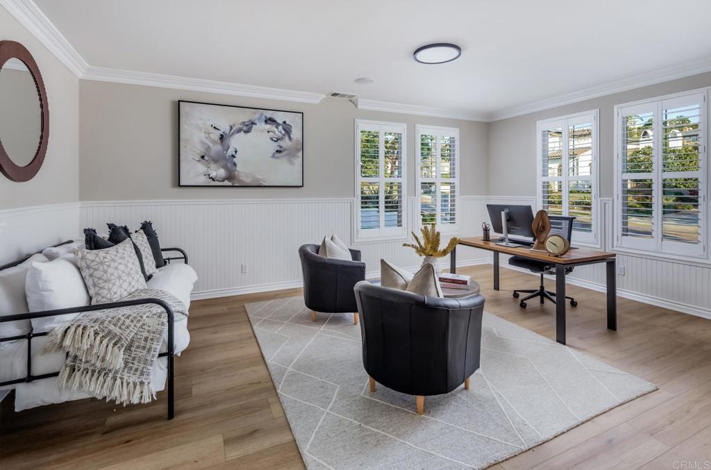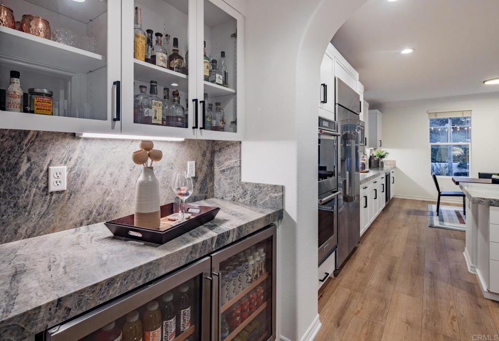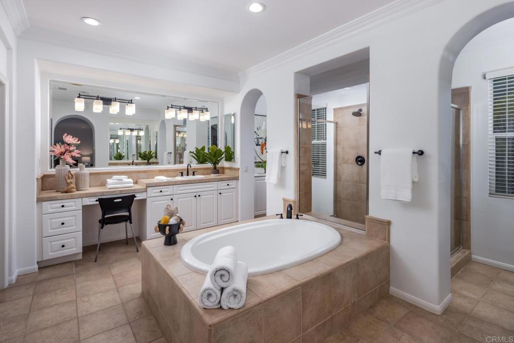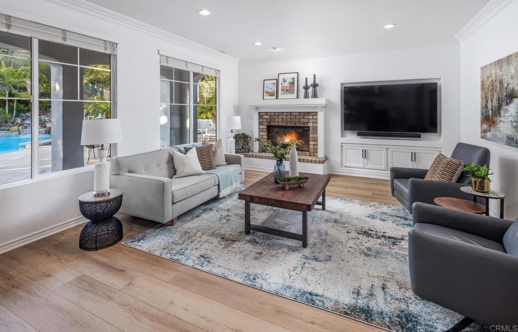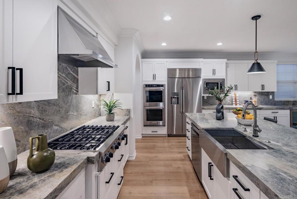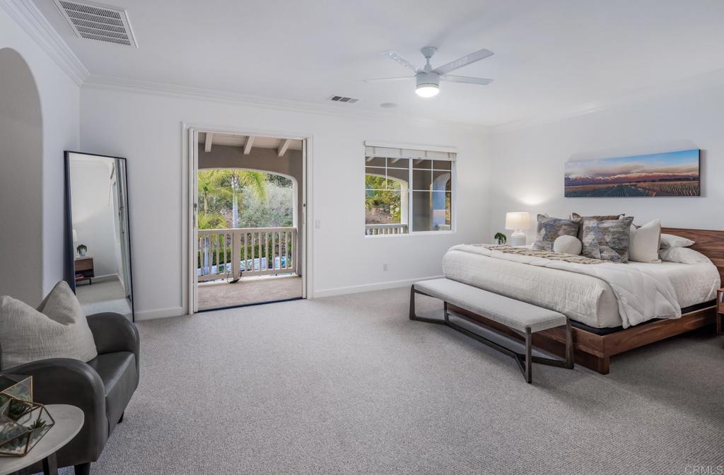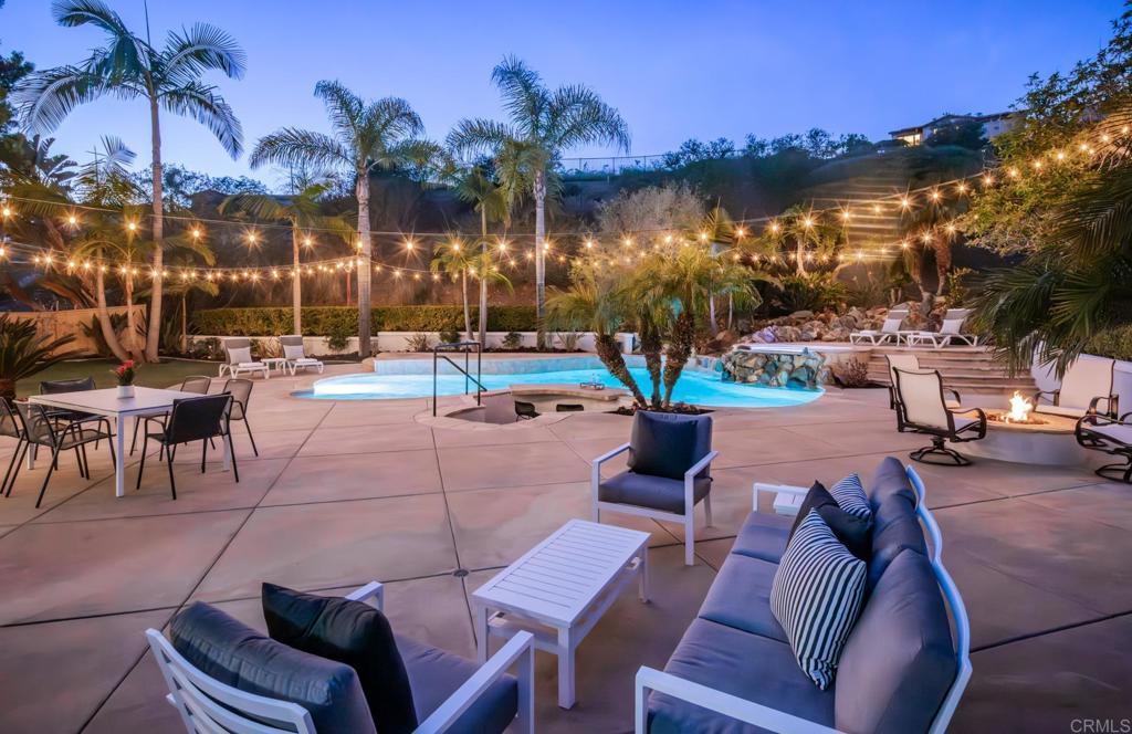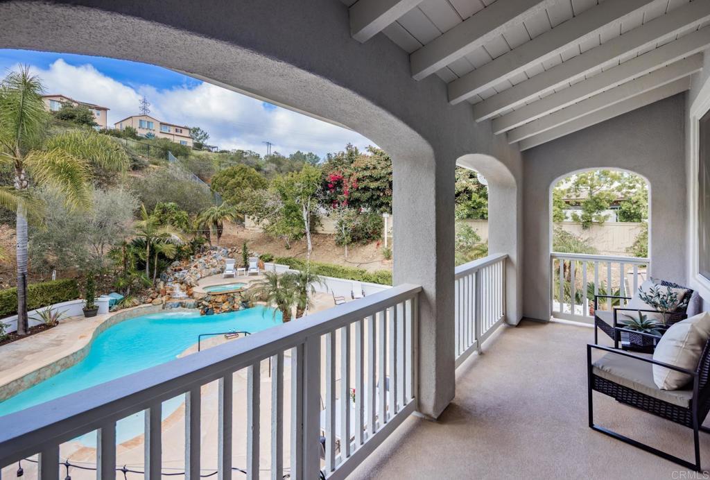 An extraordinary residence set on an expansive half-acre lot, where refined elegance, thoughtful functionality, and resort-style living come together effortlessly. Abundant in curb appeal and thoughtful design, this exceptional La Costa Oaks residence welcomes you with a grand entry that opens to formal living and dining spaces. Just off the entry, a beautifully appointed executive office with custom beadboard paneling offers the perfect work-from-home space or optional guest bedroom. The kitchen and family room form the true heart of the home and open seamlessly to the private backyard. The beautifully updated kitchen features a large center island with new quartzite countertops and matching backsplash, updated cabinetry, and premium appliances including a Dacor refrigerator, six-burner gas cooktop, and a suite of newly installed high-end appliances with beverage and wine refrigeration. A butler’s pantry, walk-in pantry, and wine closet enhance both function and style, while gas fireplaces in the living room and family room create warm gathering spaces. The backyard offers a true resort-style setting with a gorgeous pool featuring a Baja shelf and swim-up bar, elevated spa with custom waterfall feature, new pool plaster, and upgraded pool equipment and controller. A fire pit, turf lawn, lush landscaping and mature fruit trees, including plum, peach, fig, lemon, guava, and avocado, create a beautiful and private outdoor retreat. Upstairs, the expansive primary suite serves as a peaceful sanctuary with a covered deck overlooking the backyard. The large primary bath features a soaking tub, walk-in shower, dual vanities with a seated makeup area, and a large walk-in closet with extensive built-ins. Three additional bedrooms each feature their own designated full bath, while a spacious bonus room provides flexible space for a media room, playroom, or lounge. Extensive upgrades over the past four years include a new roof, owned solar system, whole-house LED lighting, updated interior lighting fixtures, new carpet in bedrooms, new plumbing fixtures, a security system, and more. The finished four-car garage features new epoxy flooring, custom cabinetry, and an electric vehicle charger. Additional exterior improvements include new fencing and exterior lighting upgrades. Located on a quiet tree-lined street in the highly desirable La Costa Oaks community, residents enjoy access to multiple clubhouses, swimming pools, spas, and a fitness center, all just minutes from La Costa Town Square.