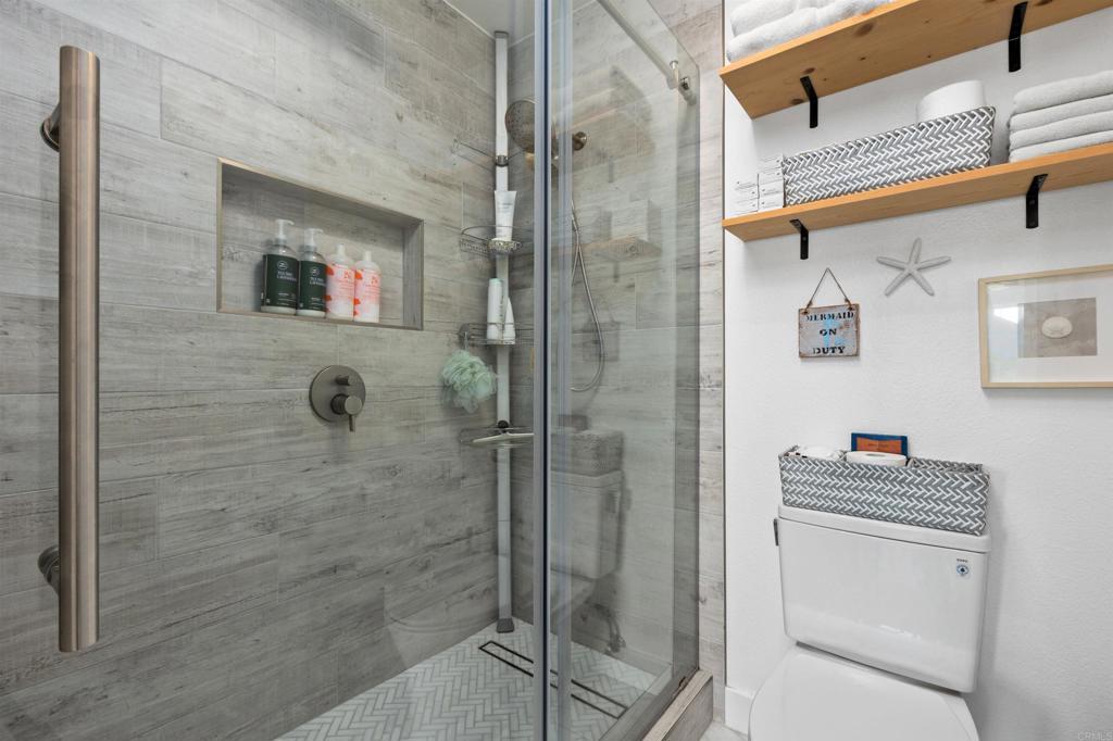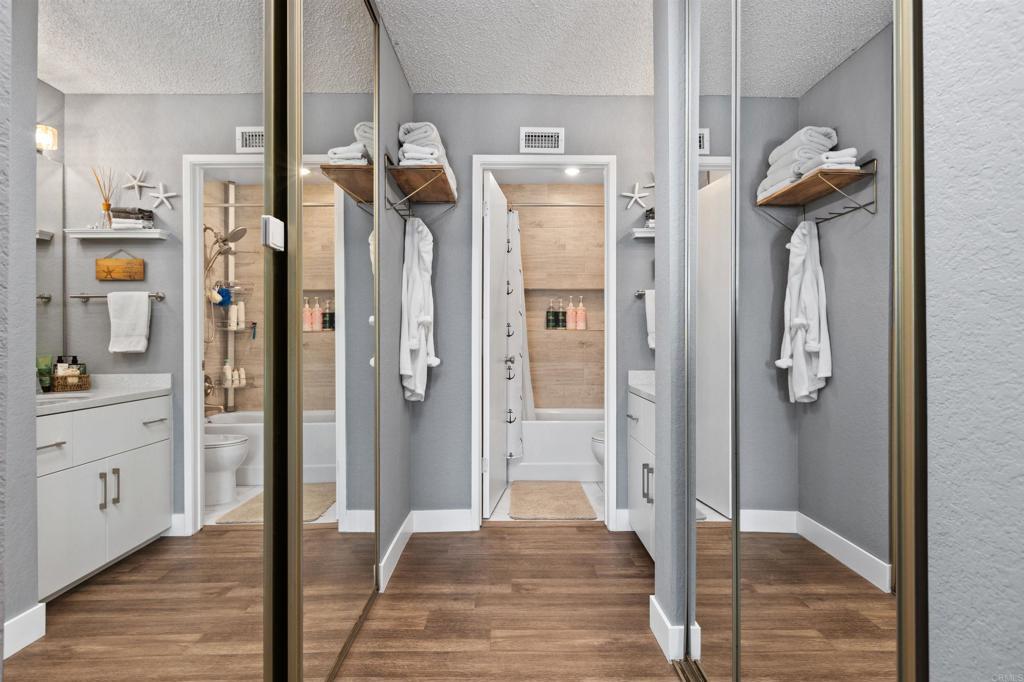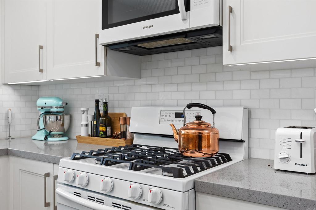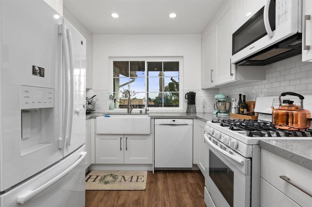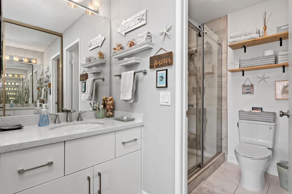 Welcome to 3580 Seahorn Circle, a rare opportunity in the highly sought-after East Bluff community. This light-filled corner residence features 2 bedrooms—each with its own en-suite bath—and 1,097 square feet of open, single-level living, with a floor plan designed for both comfort and functionality. The home showcases numerous upgrades, including continuous luxury vinyl plank flooring, dual-pane windows, and beautifully remodeled kitchen and bathrooms. The kitchen is appointed with solid wood Italian cabinetry, high-end appliances, a fireclay apron-front sink, and a marble backsplash. The bathrooms are equally refined, featuring quartz countertops and a deep soaking tub. An in-unit laundry alcove and thoughtfully reconfigured closets throughout maximize both efficiency and organization. Health-conscious buyers will appreciate the full-home reverse osmosis water filtration system and water softener, delivering clean, high-quality water throughout the home. Additional highlights include a two-car garage with a quiet belt-drive opener and Wi-Fi connectivity, allowing for convenient remote and smartphone access. Bathed in natural light throughout the day, the home enjoys peaceful treetop views that capture the beautiful hues of both sunrise and sunset. Residents of East Bluff enjoy resort-style amenities, including two sparkling pools and spas, beautifully maintained grounds, and scenic walking trails. The location is exceptional—with easy freeway access and just a short walk to watch breathtaking sunsets at Overlook Park. You’re also minutes from the shopping and dining at One Paseo, and less than 10 minutes from Torrey Pines State Beach and the Village. Situated within one of San Diego’s most desirable school districts, this home offers the perfect blend of lifestyle, comfort, and convenience in an unbeatable coastal location.