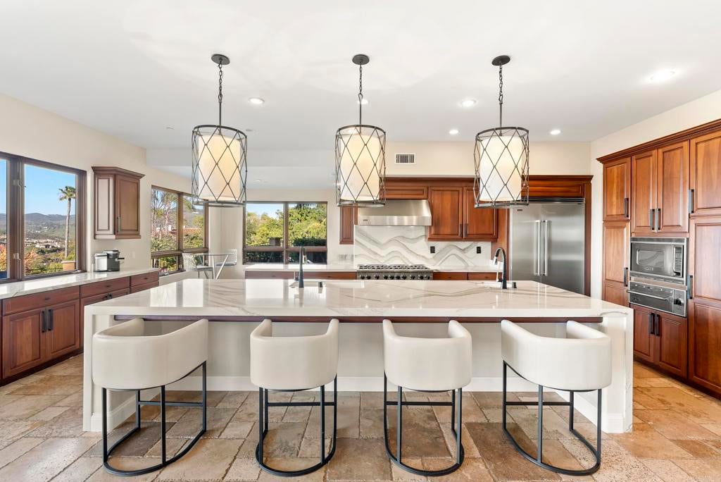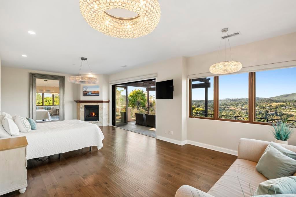 At the end of a quiet cul-de-sac within the gated community of The Groves, 18102 Via Ascenso offers privacy, sweeping views, and resort-style living on 1.23 beautifully landscaped acres. A long tree-lined driveway and manicured grounds lead to a stately residence filled with natural light, where soaring two-story ceilings and expansive windows frame the backyard and surrounding views. The 5 bed, 5.5 bath main residence showcases a thoughtful floor plan designed for both everyday living and entertaining. The chef’s kitchen features an oversized island, quartz countertops, luxury appliances, walk-in pantry, and a casual dining area overlooking the yard. The adjacent family room opens through bi-fold doors to a covered California room with fireplace and built-in BBQ, creating seamless indoor-outdoor living. The layout offers exceptional versatility with two bedrooms, 2.5 baths, and an office, on the main level. Upstairs, the primary suite includes a fireplace, sitting area, view terrace, custom walk-in closet, and spa-style bath with jetted tub and oversized shower. Two additional ensuite bedrooms and a bonus room complete the upper level. A detached single-level 1 bed, 1 bath guest house with its own kitchen and living area provides ideal accommodations for guests, extended family, or long-term stays. Outdoor amenities include an infinity pool and spa, grassy lawn, putting green, sports court, and a fully fenced upper orchard with orange, grapefruit, lemon, and avocado trees. Additional highlights include hardwood floors, travertine tile, built-in sound, zoned HVAC, and an oversized four-car garage with pull-through access. Located within the gates of The Groves and served by the highly regarded Roger Rowe School, just minutes from Rancho Santa Fe Village, golf, dining, and trails.