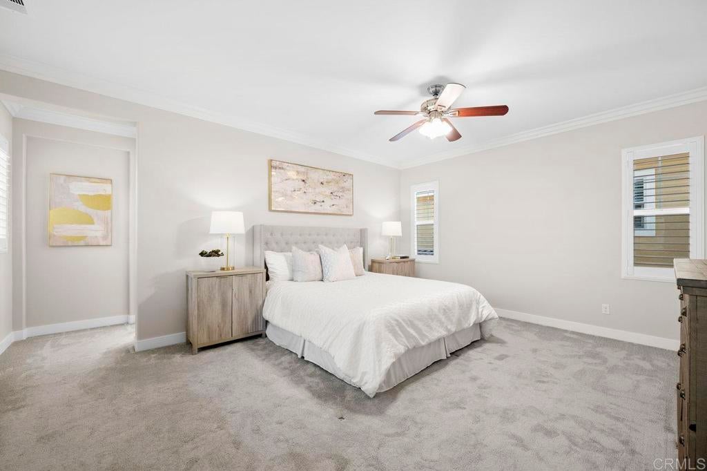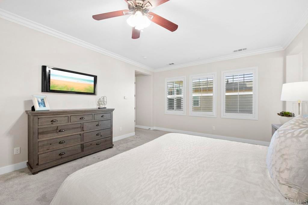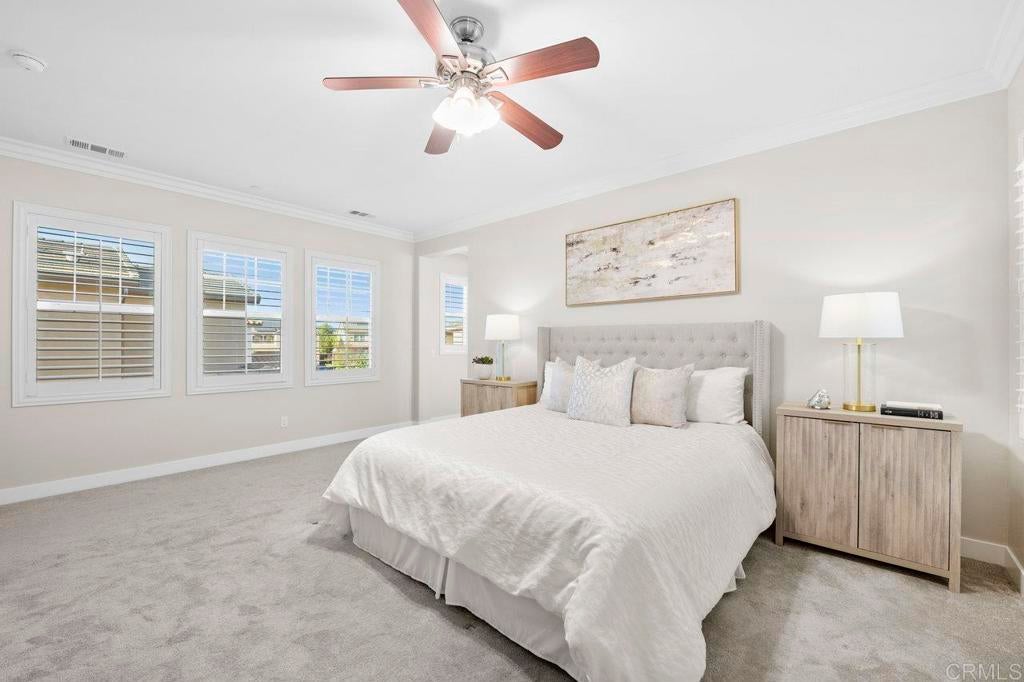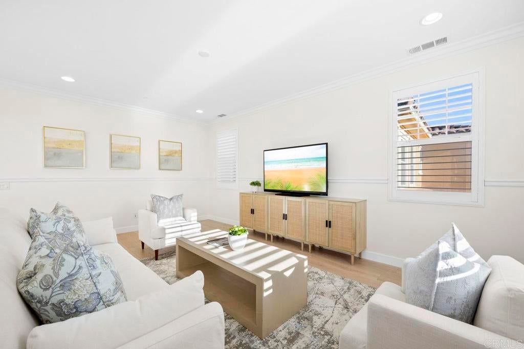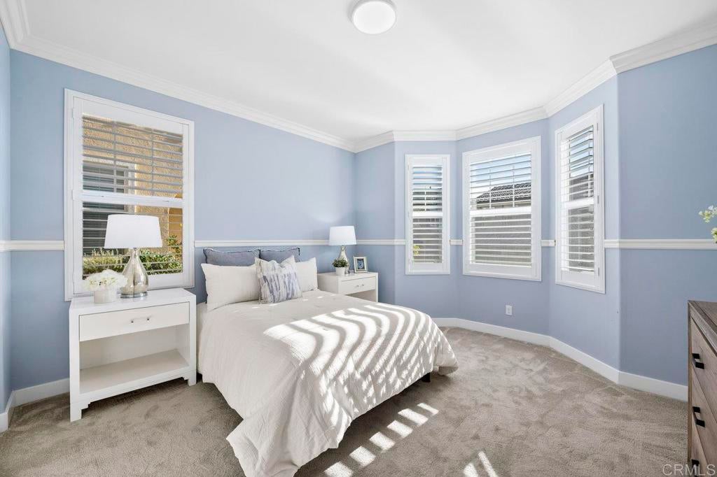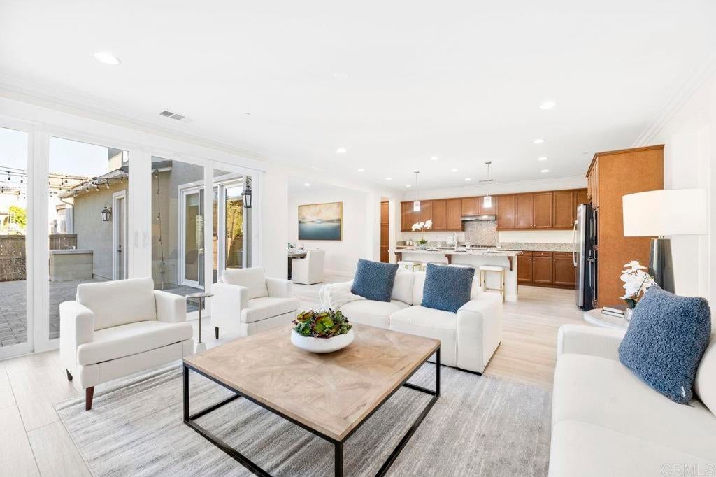 This stunning 4-bedroom, 3-bathroom Carrillo home in the heart of Del Sur offers charming cottage-style architecture paired with modern upgrades, including owned solar. With an open and functional floorplan, the home is designed for comfortable everyday living and easy entertaining. The Great Room welcomes you with a cozy gas fireplace, plantation shutters, and crown molding throughout the home. Sliding glass doors open to the private courtyard, creating a seamless indoor and outdoor living space. The kitchen features granite countertops, stainless steel appliances, a 5-burner gas stovetop, and a large island with barstool seating. A spacious dining area sits just off the kitchen and also opens to the courtyard. A desirable first-floor bedroom includes a charming bay window nook and sits next to a full bathroom with a walk-in glass shower, ideal for guests or a home office. The two-story foyer adds an open and airy feel as you enter the home. Upstairs, a versatile loft provides additional living space perfect for a lounge area, workspace, or playroom. The primary suite is filled with natural light from west-facing windows and offers beautiful sunset views. The en-suite bathroom features dual vanities, an oversized soaking tub, a spacious walk-in closet, and a large glass-and-tile shower with a built-in bench. Two additional bedrooms upstairs are generously sized and share a bathroom with dual sinks and a shower/tub combination. The upstairs laundry room includes a sink, ample cabinetry, and a linen closet for added convenience. Recent upgrades include new wood flooring throughout most of the home. The attached garage includes a 240-volt outlet for EV charging. Located in the highly desirable Del Sur community, residents enjoy access to 14 parks, 11 resident-only pools, a dog park, and miles of walking trails. The home is just a short walk to nearby parks and the Del Sur Town Center, which includes Target, Starbucks, restaurants, shopping, gyms, and grocery options. The home is located within the award-winning Poway Unified School District, with Del Sur Elementary, Oak Valley Middle School, and Del Norte High School all nearby. With easy access to CA-56 and I-15, this home offers convenience, comfort, and an exceptional community lifestyle.
