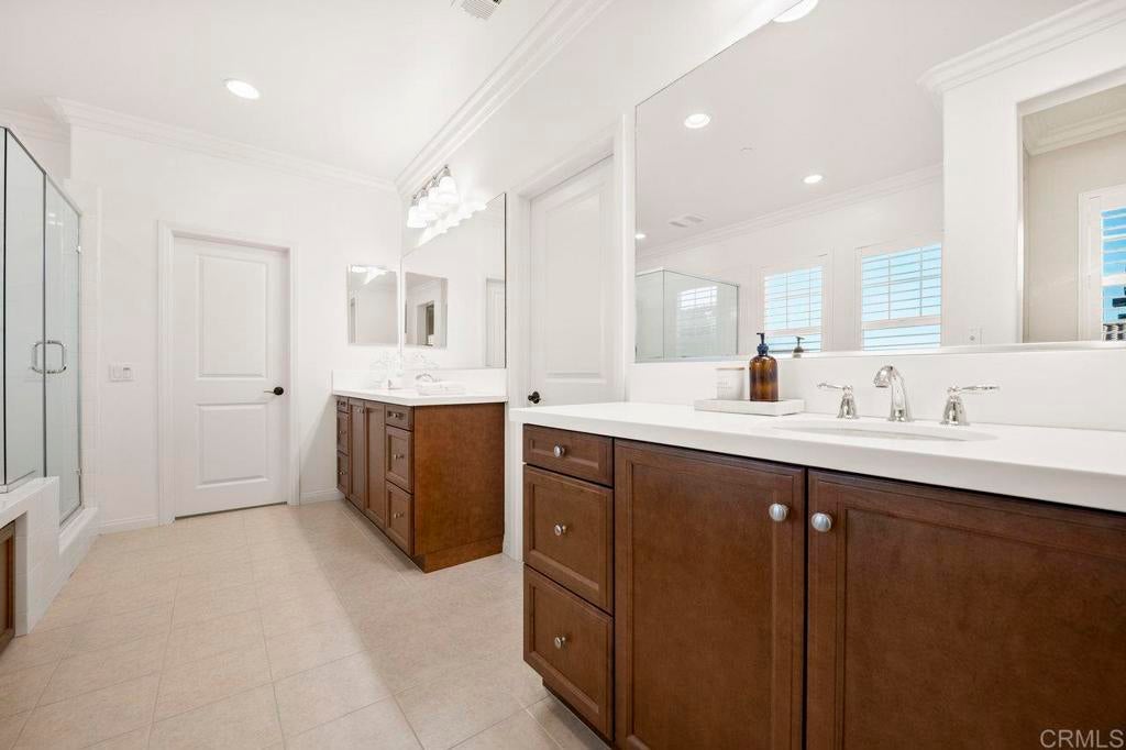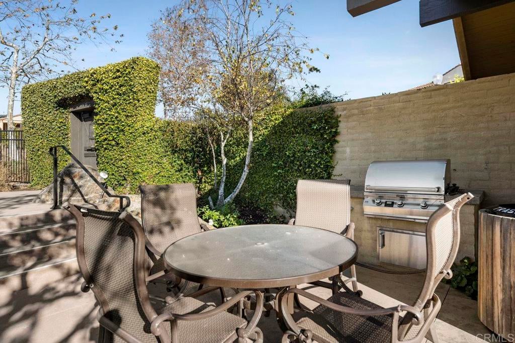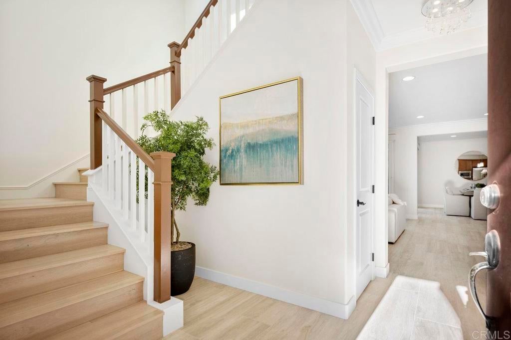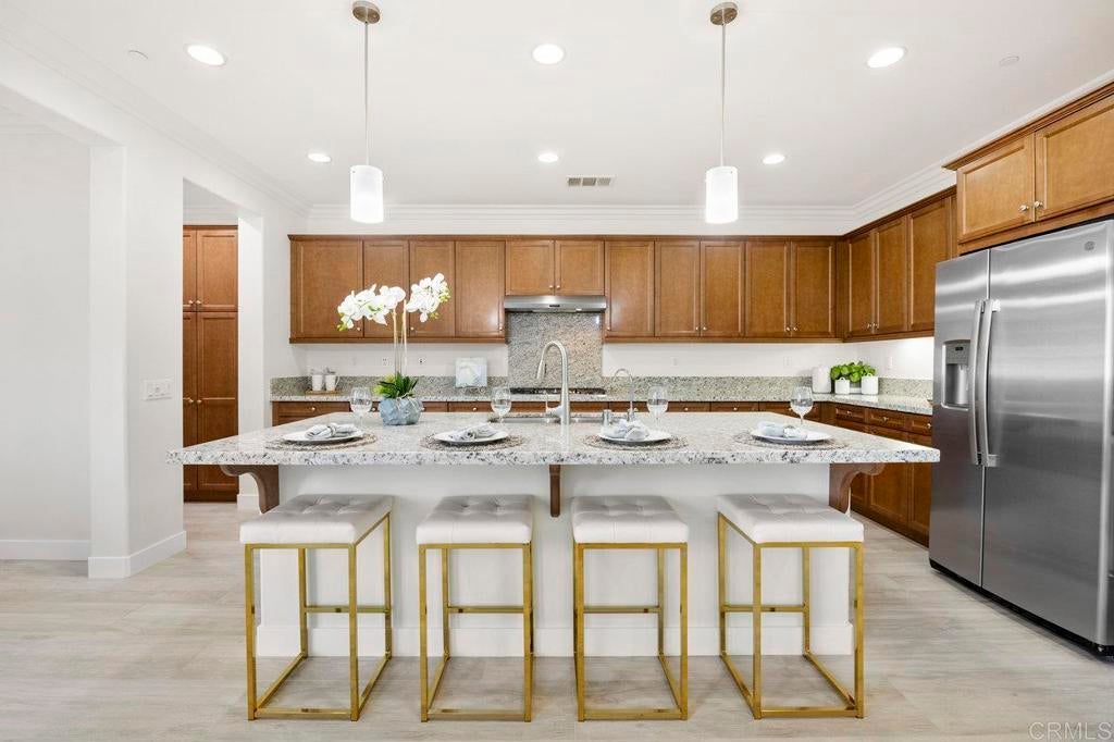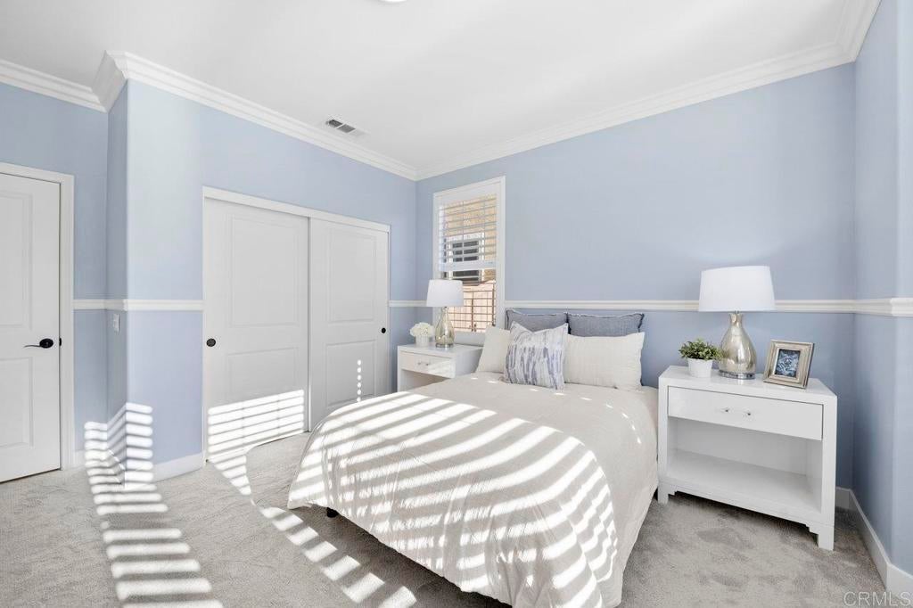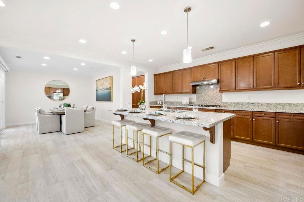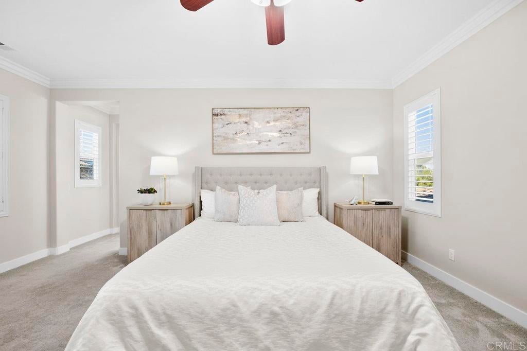 This stunning 4-bedroom, 3-bathroom Carrillo home in the heart of Del Sur offers charming cottage-style architecture paired with modern upgrades, including owned solar. With an open and functional floorplan, the home is designed for comfortable everyday living and easy entertaining. The Great Room welcomes you with a cozy gas fireplace, plantation shutters, and crown molding throughout the home. Sliding glass doors open to the private courtyard, creating a seamless indoor and outdoor living space. The kitchen features granite countertops, stainless steel appliances, a 5-burner gas stovetop, and a large island with barstool seating. A spacious dining area sits just off the kitchen and also opens to the courtyard. A desirable first-floor bedroom includes a charming bay window nook and sits next to a full bathroom with a walk-in glass shower, ideal for guests or a home office. The two-story foyer adds an open and airy feel as you enter the home. Upstairs, a versatile loft provides additional living space perfect for a lounge area, workspace, or playroom. The primary suite is filled with natural light from west-facing windows and offers beautiful sunset views. The en-suite bathroom features dual vanities, an oversized soaking tub, a spacious walk-in closet, and a large glass-and-tile shower with a built-in bench. Two additional bedrooms upstairs are generously sized and share a bathroom with dual sinks and a shower/tub combination. The upstairs laundry room includes a sink, ample cabinetry, and a linen closet for added convenience. Recent upgrades include new wood flooring throughout most of the home. The attached garage includes a 240-volt outlet for EV charging. Located in the highly desirable Del Sur community, residents enjoy access to 14 parks, 11 resident-only pools, a dog park, and miles of walking trails. The home is just a short walk to nearby parks and the Del Sur Town Center, which includes Target, Starbucks, restaurants, shopping, gyms, and grocery options. The home is located within the award-winning Poway Unified School District, with Del Sur Elementary, Oak Valley Middle School, and Del Norte High School all nearby. With easy access to CA-56 and I-15, this home offers convenience, comfort, and an exceptional community lifestyle.
