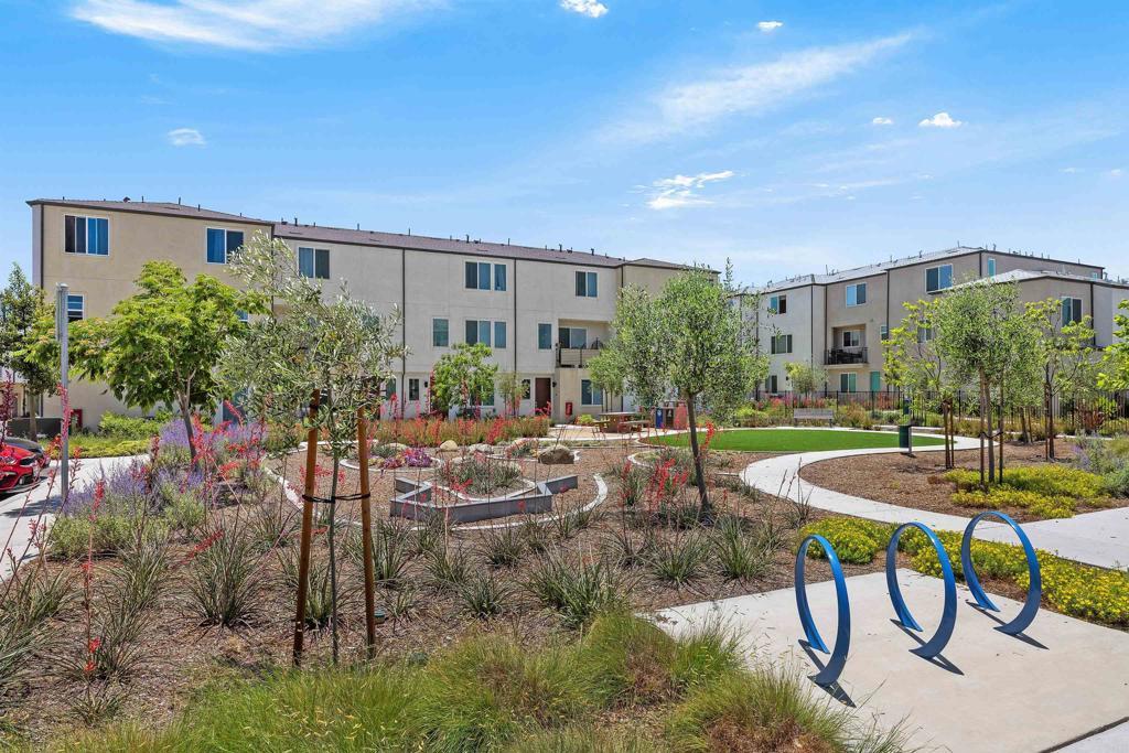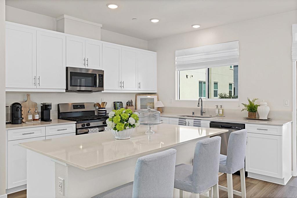 Turnkey in every sense of the word. This very well cared for and tastefully curated 1,945 square foot La Brisa corner unit blends contemporary flare and modern convenience designed for everyday living in style. With four bedrooms, three and half baths and an attached two car garage the possibilities are nearly endless. The first floor features an inviting entryway, direct garage access and a spacious bedroom with en-suite full bath perfect for guests or family. The second floor is an entertainer’s delight with a light, bright open concept floorplan. Gather in the kitchen area around the generous island, watch the big game in the family room area, enjoy morning coffee or sunset sips on the balcony or assemble the ingredients for your next gourmet meal from the oversized pantry. The third floor includes the Primary Bedroom with ensuite full bath and custom designed closet, two more bedrooms, another full bath and a thoughtfully designed laundry room. This home also features stunning LVP flooring, custom window coverings, ample storage throughout, Low-E glass windows, energy efficient appliances, tankless water heater, A/C and forced air heating and owned solar. La Brisa is a VA-approved community with resident sitting areas and conveniently located dog parks. The 14-acre plus Cesar Solis Community Park is close by with a network of trails, large grassy areas for picnics, ball fields, a full-court basketball court and a skate park. Easy freeway access puts you on the road for quick access to downtown San Diego, the beaches of Coronado Island and the International Border. The perfect setting for your next stage awaits you at this stunning home.