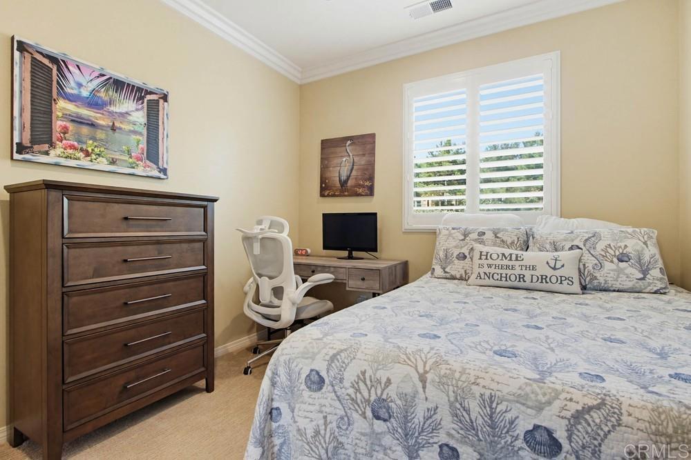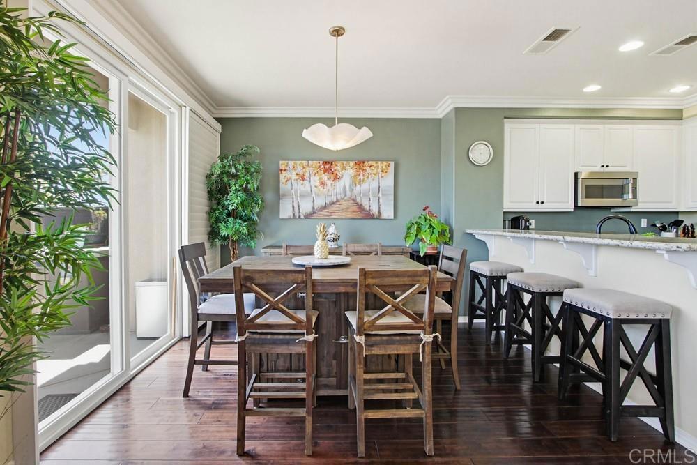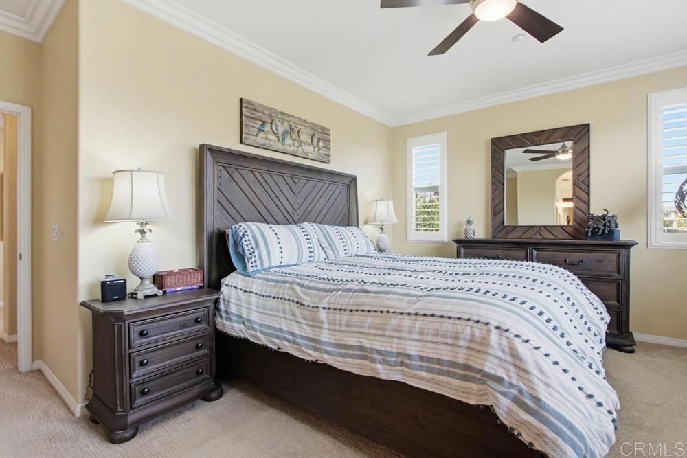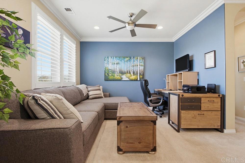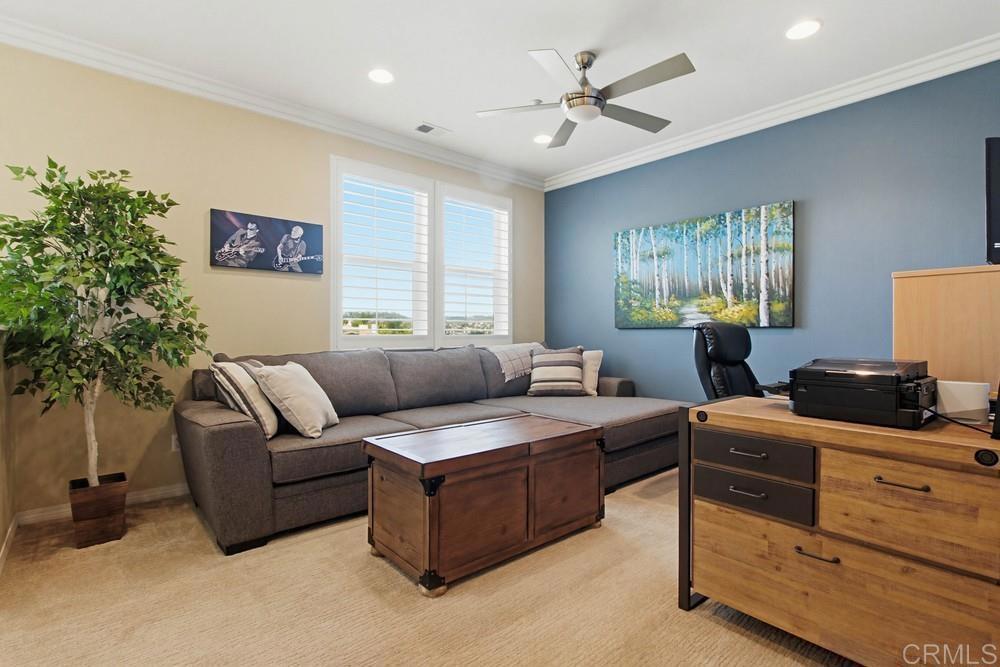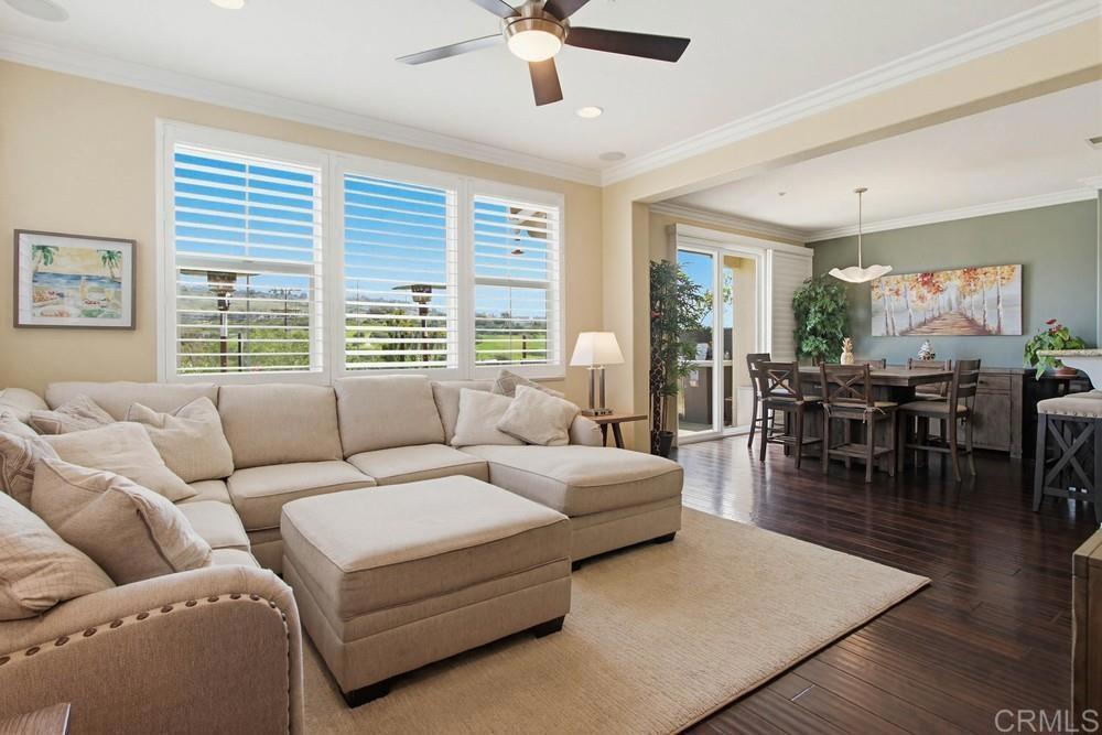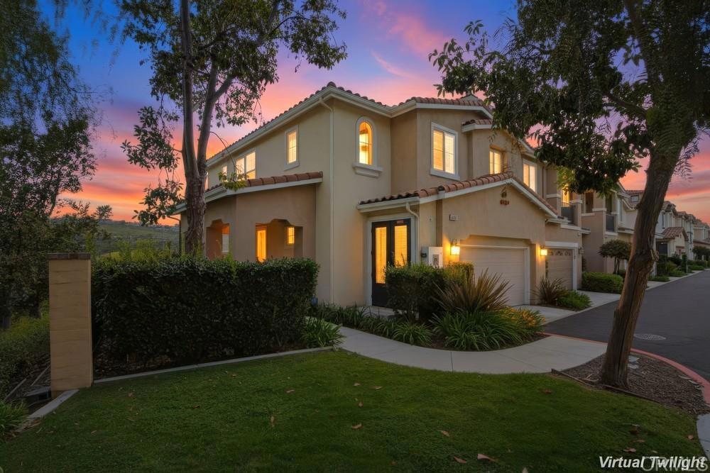 One of a kind 3 bedroom plus loft end unit townhome with panoramic golf course and open space views. The most private location in the Avellino community with wrap around glass wall in back to enhance the views. This highly upgraded 2 story home includes plantation shutters and crown molding throughout, newer stainless Thermador appliances with granite counters in kitchen, ceiling fans with lights in all bedrooms, loft & living room. Added recessed lighting, upgraded bath fixtures and hardwood floors throughout downstairs. Living room with added surround sound. Fabulous backyard with a built in Bull grill, mini fridge and a built in natural gas firepit for those cooler nights. Amazing views overlooking the Omni La Costa Golf Course and natural open space. The two car garage includes an added EV charger. This home is part of the La Costa Greens community which gives you access to the Presidio which includes a beautiful pool, large spa, cabanas, kiddie pool, fitness center, clubhouse with full kitchen, pickleball and tennis courts, parks, tot lots & more. Close to shops, restaurants, walking trails and beach.