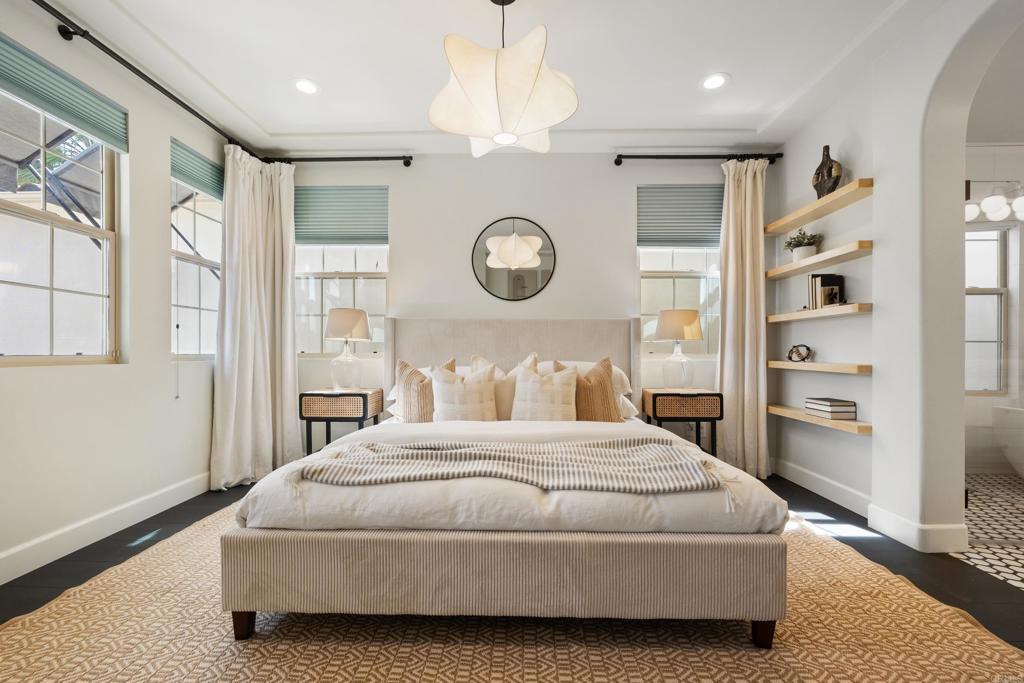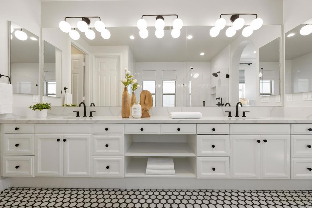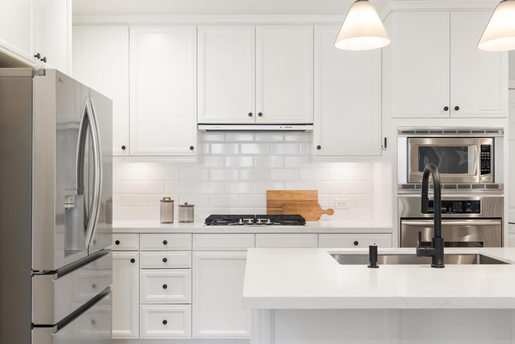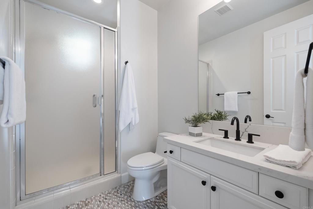 Beautifully remodeled Beacons Point in Liberty Station offers the perfect blend of modern finishes, functional layout, and charming Point Loma living. The open-concept floor plan seamlessly connects the living, dining, and kitchen areas—ideal for entertaining and everyday living. The beautifully renovated kitchen showcases quartz countertops and stainless steel appliances, all complemented by new flooring and designer fixtures, as well as updated bathrooms with contemporary finishes. Upstairs, the primary suite is a true spa-like retreat, complete with a soaking tub, glass-enclosed walk-in shower, dual walk-in closets, and a retreat area with Juliet balcony. A secondary upstairs bedroom and a convenient laundry room add to the home’s thoughtful layout. Downstairs bedroom offers a French door connection to the front patio, creating a unique indoor/outdoor flow for the downstairs living. Outdoor spaces shine with an entertainer’s courtyard featuring Trex decking and a gas fire pit, while the expanded front patio offers additional room to relax and enjoy the charm of Beacons Point. Additional features include a tankless water heater, and a 2-car garage with epoxy flooring and overhead storage racks. Ideally located in the heart of Liberty Station, just moments from parks, waterfront paths, top dining, shopping, Trader Joe’s, and Vons—this home captures the very best of Point Loma living.