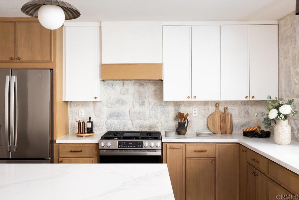 **Dwell West proudly presents** Nestled on a prime corner lot in Olde Carlsbad, this single-story coastal retreat was completely remodeled with warm organic materials and an elevated designer style. Seamless indoor/outdoor living is showcased with cantina doors to the backyard, plus wide plank LVP flooring, curated light fixtures, and wood accent walls throughout. The chef's kitchen sets the tone with custom oak shaker cabinetry, quartz countertops with a dramatic waterfall-edge island, and artisan stone backsplash that flows seamlessly into the dining room. The primary suite is a true spa retreat with a freestanding double vanity and a walk-in shower with floor to ceiling tile and multiple showerheads. The secondary bath mirrors the same refined level of finish with a tiled tub and shower combo. Experience the ultimate backyard escape with a freeform pool, pergola-covered patio, low-maintenance turf, garden beds, dog run, and room for RV parking. The fully insulated, detached 4th room with electricity offers flexible options for a home office, exercise space, or creative retreat. Additional highlights include black-frame double-pane windows, new HVAC, fresh interior and exterior paint, new doors and hardware throughout including a fiberglass front door, interior laundry room with sink, and a new garage door. Zoned for Kelly Elementary, Valley Middle, and Carlsbad or Sage Creek High, with no HOA or Mello Roos, this home is walking distance to the lagoon with easy access to I-5, the beach, and Carlsbad’s vibrant downtown dining scene. Buyer and buyer's agent to verify all in MLS prior to COE.