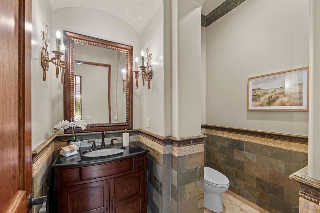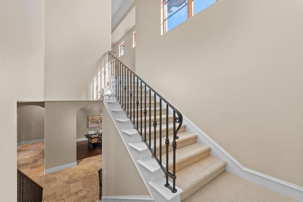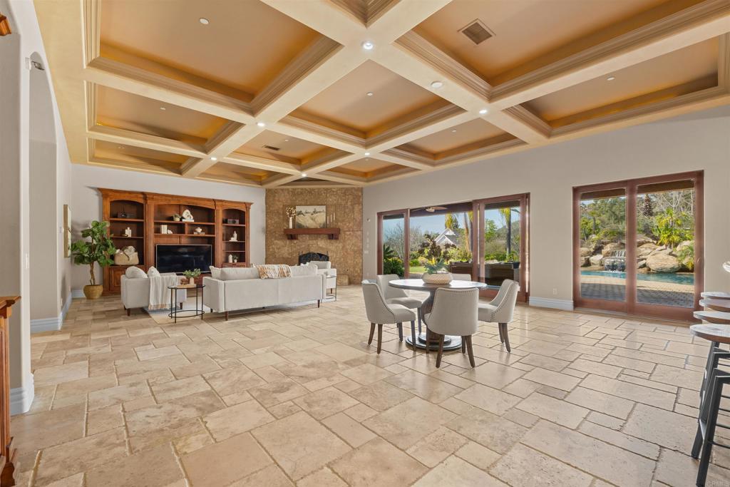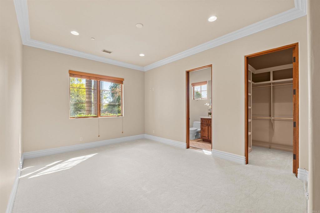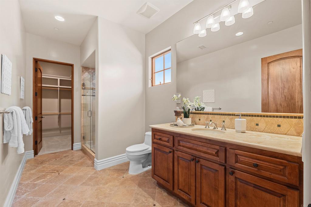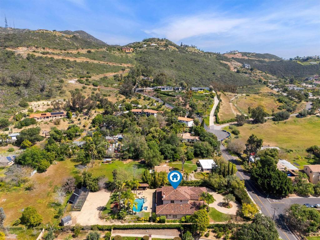 Welcome to an extraordinary private estate nestled in the picturesque foothills of Vista. Featuring a circular driveway set behind a motorized gated entry, the home exudes luxury from the moment you enter. Fully fenced on nearly one acre of lush grounds, this magnificent residence offers 6,247 square feet of refined living space including five bedrooms and six bathrooms. Grand 9-foot mahogany double doors open to a dramatic interior with immediate views of the resort-style backyard. The heart of the home is the gourmet chef’s kitchen, beautifully appointed with custom cabinetry, granite countertops, a 6-burner gas cooktop, brand new dishwasher, breakfast bar, expansive center island, and a large walk-in pantry. The thoughtfully designed floor plan lives like a single story with the primary bedroom on the first floor. Also located on the first floor are two dedicated offices, each with direct access from the exterior or interior, a formal dining room, a guest bedroom with ensuite bath, an oversized laundry room with an abundance of storage and counter space, and a convenient half bath for guests. The downstairs primary suite features its own fireplace, slider out to the backyard, and a sensational ensuite bathroom complete with soaking tub, separate walk-in shower, and oversized walk-in closet with custom shelving and 10-drawer dressing station. Upstairs you will find a loft with a built-in entertainment center and three generously sized guest bedrooms, all with en-suite bathrooms and walk-in closets. Additional highlights include soaring coffered ceilings, a stunning wrought iron staircase, fresh interior paint, new carpet in the bedrooms, and custom built-ins throughout. Step outside to your own private backyard oasis, where resort-style amenities create the ultimate setting for relaxation and entertaining. Enjoy the sparkling pool with beach entry and water slide, unwind in the spa, gather around the fire pit, or prepare unforgettable meals with the custom, covered outdoor BBQ area featuring a grill, roasting pit, and two refrigerators. The expansive approximately one-acre lot provides ample space for future possibilities, including room for an ADU with a separate gravel driveway already in place for convenient access. Car enthusiasts will appreciate the four-car garage which features an entire wall of custom cabinetry. Best of all, this exceptional estate offers no HOA and no Mello-Roos, allowing you to fully enjoy the freedom and privacy of this remarkable property. Don’t miss this rare opportunity to own a luxurious, gated foothills estate where space, privacy, and exceptional amenities come together in one truly spectacular Vista residence.
