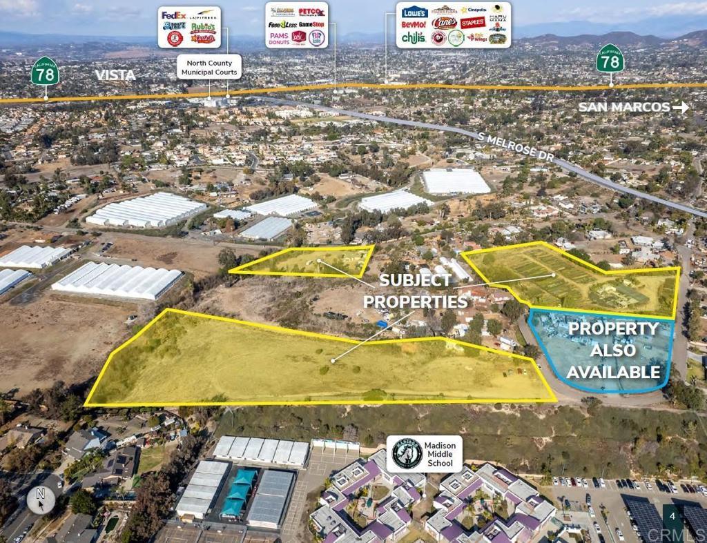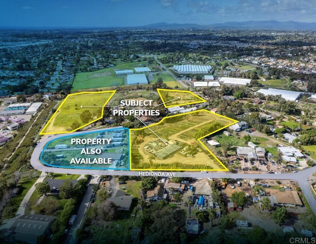 Spanning approximately 12.58 acres, this vacant parcel of land is located in a highly desirable area of Vista, California. Zoned Rural Residential (RR), the site accommodates up to two (2) dwelling units per acre, making it ideal for a single-family home community, with potential for increased density through state law and city annexation. The property’s strategic location across from Lake Elementary & Madison Middle School enhances its marketability to prospective families. Additionally, the site presents potential for annexation into the City of Vista per a sewer agreement with the City of Oceanside, thereby further increasing its development potential. Potential annexation and rezone to increased density in the City of Vista. 169-130-14-00 | 5.58 Acres: $4,250,000 169-130-10-00 | 3.59 Acres: $3,000,000 169-130-17-00 | 1.82 Acres: $1,750,000 169-130-13-00 | 1.59 Acres: Also Available ($1,700,000)