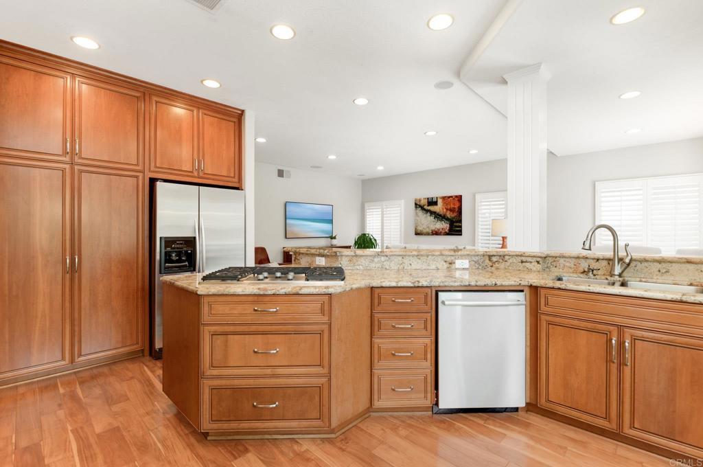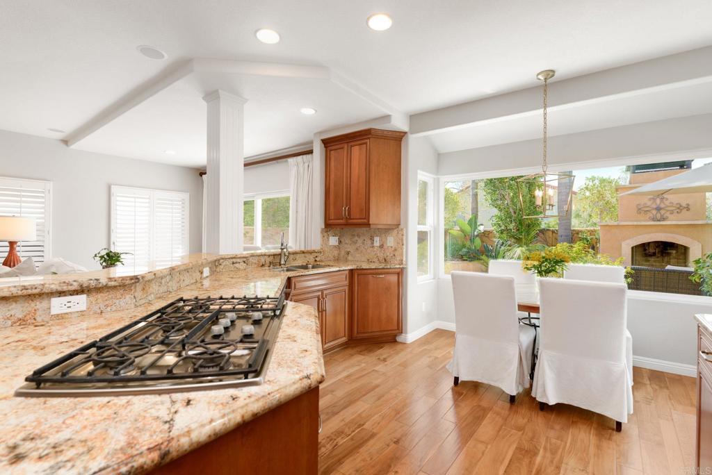 Beautifully updated Carmel Valley home situated on a quiet cul-de-sac where traffic is limited primarily to residents, just two blocks from the Bay Club and zoned for Carmel Del Mar Elementary School within both the highly sought-after Del Mar Union School District and San Dieguito middle and high school districts. Impeccably maintained by its long-term owner, this 4-bedroom, 3 full bathroom home offers a flexible and functional layout designed for everyday living and entertaining. The downstairs features a formal living room, dining room, family room, and an updated kitchen—all with views of the serene backyard. The kitchen connects seamlessly to both the dining room and family room and includes a casual eat-in area and bar seating for multiple dining options. The kitchen was renovated with custom cabinetry with soft-close doors and drawers, pull-outs, built-in organizers, granite countertops, a large picture window, and stainless steel appliances including KitchenAid gas cooktop, refrigerator, oven, and convection microwave, and a Bosch dishwasher. The downstairs also features a fourth bedroom, offering a flexible space for a bedroom, media room, or playroom. The nearby bathroom includes a shower to comfortably serve the downstairs bedroom if desired. Upstairs, the primary suite is privately situated and features a fireplace, a spacious sleeping and sitting area, and windows overlooking the backyard. The en suite bathroom includes dual sinks, granite countertops, custom cabinetry, a Kohler soaking tub, and a dual-head shower with rain feature, while a walk-in closet with custom built-ins completes the space. Two additional bedrooms and a remodeled bathroom with dual sinks, custom cabinetry and quartz countertops are located on the opposite side of the second level, offering both privacy and functionality. Interior upgrades include wood flooring throughout the downstairs living areas, ample recessed lighting, ceiling fans in all bedrooms, and built-in surround sound in the family room. Outdoor living is equally well-appointed, with a beautifully landscaped backyard featuring an in-ground spa, built-in BBQ with refrigerator, and a wood-burning fireplace with gas starter—designed for both relaxation and entertaining. Additional highlights include air conditioning, a whole house fan, upgraded closets throughout, a finished garage with an EV charger, built-in cabinetry, overhead storage, pegboard organization, and the rare benefit of no HOA.
