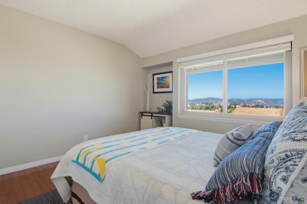 Perched in a prime hilltop location, this immaculate move-in ready home offers breathtaking panoramic views from every room—mountains, evening lights, gorgeous sunsets and the golf course—plus a peek-a-boo glimpse of Lake Hodges. Inside, the open-concept floor plan is filled with natural light and enhanced by vaulted ceilings and hardwood flooring throughout the main living areas. The spacious living room features a cozy fireplace and sliding glass doors that open to a private balcony—perfect for taking in the surrounding scenery. The updated kitchen showcases rich dark brown cabinetry inviting an elegant space both cozy and luxurious, with glass-front accents, brushed nickel hardware, white countertops, recessed lighting, and a charming dining nook with ceiling fan. A full appliance suite includes a refrigerator, dishwasher, and flat ceramic cooktop/oven. Thoughtfully designed, the kitchen offers a sense of separation while remaining open to the dining and living areas—ideal for both everyday living and entertaining. Both bedrooms feature hardwood floors, privacy shades, and scenic views, with the primary bedroom offering mirrored wardrobe doors. The primary bathroom includes generous counter space and a separate enclosed area for the toilet and a beautifully tiled tub/shower combination with matching tile flooring. The secondary bathroom features a walk-in shower with glass doors and stylish blue tile flooring. Additional highlights include dual-pane windows, central heating and air conditioning, a side-by-side washer/dryer closet with shelving, a dedicated carport space with storage, and convenient guest parking nearby. Located within the highly desirable 55+ Oaks North community, residents enjoy access to the Oaks North Community Center featuring a pool and spa, fitness center, tennis and pickleball courts, lawn bowling, creative studios (woodshop, ceramics, art), game and card rooms, a library, and a large auditorium for events and gatherings. Nearby, Bernardo Winery offers a charming destination for wine tastings, boutique shopping, and local events, while the Oaks North Golf Course presents a scenic 27-hole layout suitable for a variety of skill levels. Experience a tranquil yet vibrant setting with exceptional views and amenities!