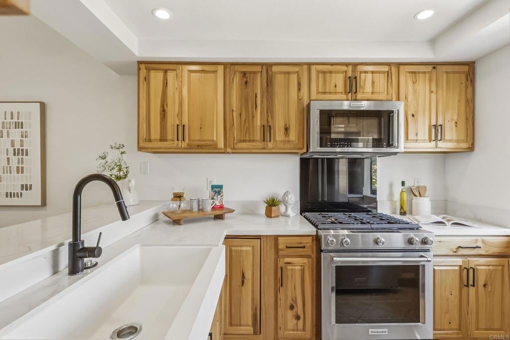 Experience the best of Encinitas living in this highly sought after Country View community where lifestyle, convenience, and thoughtful upgrades come together effortlessly. This beautifully renovated home welcomes you with a light-filled, south facing open-concept design, enhanced by newer Milgard energy efficient windows that invite in coastal breezes and abundant natural light. The fully remodeled kitchen showcases modern cabinetry, sleek countertops, apron sink, and newer stainless steel appliances, seamlessly connecting to the main living space for easy everyday living and effortless entertaining. A tastefully recent fully renovated bath completes the home's clean, contemporary aesthetic. Step outside to your private patio which is perfect for slow mornings or relaxed evenings at home, while enjoying the peaceful surroundings of this well-maintained community with no age restrictions. Country View offers an exceptional array of resort-style amenities rarely found at this price point, including two sparkling pools and spas, a pickleball court, bocce ball court, and a welcoming clubhouse. Outdoor enthusiasts will love the scenic hiking and walking trails, as well as the unique 9-hole executive golf course woven into the community creating an active, social, and connected lifestyle just steps from your door. Ideally located just minutes from Encinitas beaches, vibrant dining, shopping, and easy freeway access, this home offers the perfect blend of coastal charm and everyday convenience. A true opportunity to live the North County lifestyle you’ve been waiting for!