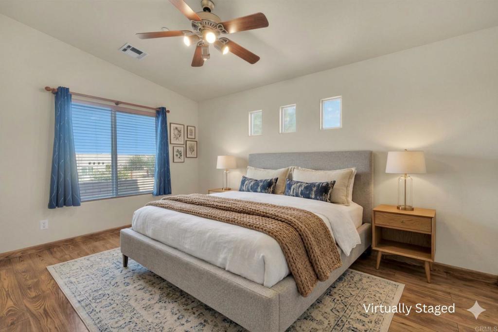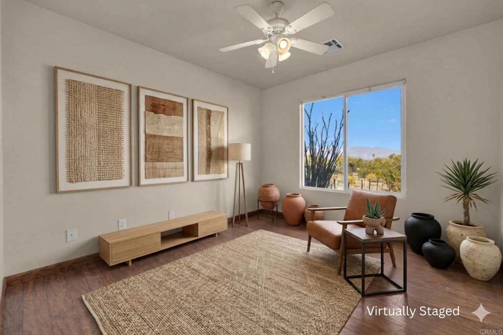 PRICED TO SELL at $349,000!!! Hurry, won't last! Wake up to breathtaking mountain views and the quiet beauty of desert living in this inviting Borrego Springs retreat. Step inside to a warm, inviting living space with a cozy fireplace and abundant natural light. A seamless blend of wood, laminate, and tile flooring runs throughout, offering both style and durability. The bright kitchen features granite countertops, maple-toned cabinetry with classic recessed-panel detailing, and two skylights that flood the space with natural light while framing the desert landscape. Vaulted ceilings enhance the open feel, and the thoughtful layout includes an eat-in kitchen, indoor laundry, and a two-car garage with storage. Leased solar at just $125/month adds energy efficiency and value. The expansive property offers room for RV parking, off-road vehicles, or desert toys—perfect for embracing the outdoor lifestyle. Custom block walls add charm and definition to the outdoor space. The septic system has just been pumped, inspected, and certified, offering added peace of mind. Located in a Certified International Dark Sky Community near Christmas Circle, shops, dining, hiking, and Anza-Borrego Desert State Park. No HOA offers flexibility and opportunity in this unique desert setting.