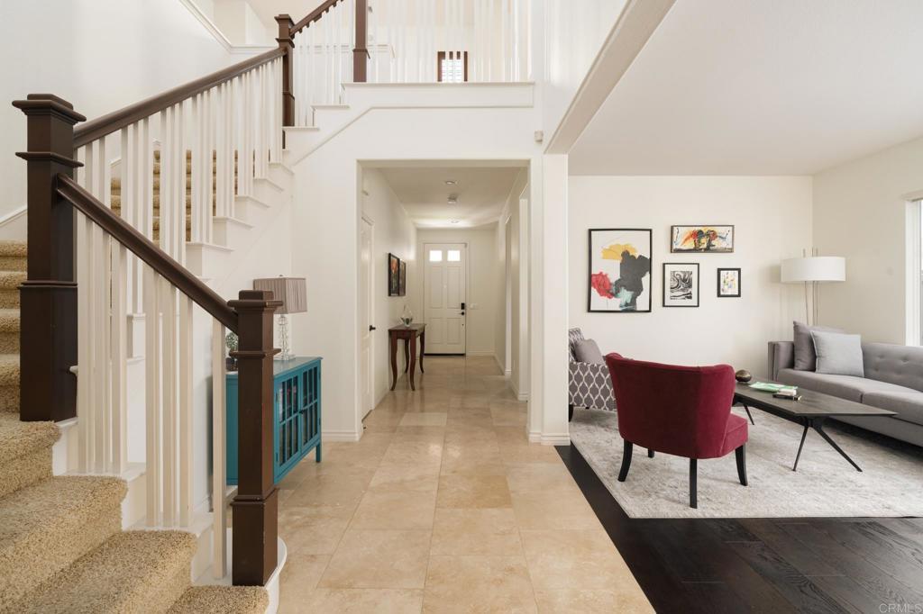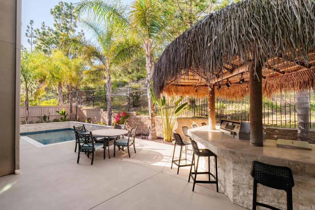 Entertainer’s pool home on a quiet cul-de-sac with no neighbors behind! This spacious Venzano residence offers the ideal blend of indoor comfort and outdoor entertaining just minutes from the lifestyle and amenities of nearby San Elijo Hills. One of the community’s most desirable floor plans, this beautiful home features 5 bedrooms plus a generous loft and four bathrooms, offering flexibility for a media room, office, or playroom. A bedroom and full bathroom on the main level are ideal for multi-generational living or hosting guests, adjacent to the living and dining room. The light-filled kitchen and family room create the heart of the home, featuring a large granite center island, a Viking cooktop and a built-in refrigerator, a walk-in pantry, and butler’s pantry. The adjoining family room with stone fireplace offers a warm and inviting gathering space. Sliding glass doors off the breakfast nook open to an entertainer’s dream backyard. A gorgeous contemporary pool with waterfall features and spa anchors the space, complemented by a built-in fire pit and large built-in BBQ with fridge under a tropical palapa—perfect for hosting friends, summer pool days, and relaxed evenings outdoors. Upstairs are four additional bedrooms, three bathrooms, and the spacious loft, including the sizable primary suite featuring an office nook with custom built-ins and dual closets with built-in organization and bathroom with dual vanities, stone countertops, large soaking bathtub and shower. Additional highlights include OWNED solar for house and pool, 3-car tandem garage with storage, dual A/C, tankless water heater, custom window treatments, plantation shutters, closet built-ins throughout, and a downstairs laundry room with sink. Located in the desirable Venzano community of San Marcos, just minutes from San Elijo Hills Town Center, 18 miles of scenic hiking trails, parks, top-rated schools, shopping, and dining. Move-in ready with new paint and all set for summer with the pool!