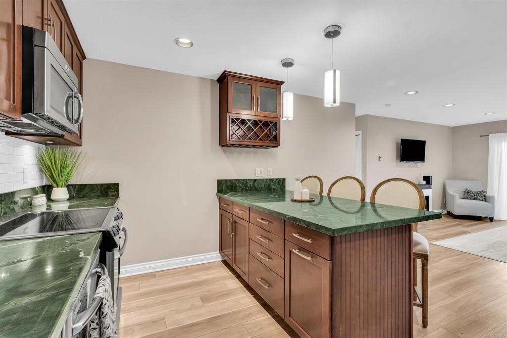 This isn’t your typical Grove condo. This is the upgraded version buyers hope to find. Bright, open, and thoughtfully redesigned, it offers a clean, modern feel from the moment you step inside. The home has been carefully customized to enhance both functionality and style. You are greeted by an airy, light filled space featuring upgraded windows and doors, recessed lighting, and beautiful luxury vinyl plank flooring that carries throughout. The reimagined kitchen is a true standout, redesigned for better flow and everyday living. It features high end stone countertops, quality cabinetry, stainless steel appliances, and a functional island that opens seamlessly to the main living area. Updated dual-pane windows and sliding glass door enhance natural light and energy efficiency throughout the home. The living space opens to a private patio, creating an easy indoor outdoor connection and a comfortable place to relax. Both bedrooms are generously sized and enjoy peaceful greenbelt views, including a spacious primary with mirrored wardrobe doors that enhance light and space. The bathroom has been tastefully updated with a clean, spa like design. Additional features include two covered assigned parking spaces, which are not guaranteed for all units in the community, along with in unit laundry and ample storage. Located within a gated and highly walkable community, residents enjoy access to a pool, spa, tennis courts, clubhouse, and scenic walking trails. The HOA covers water and trash. Just minutes from Carlsbad Village, shopping, dining, and only two miles to the beach, this home offers the perfect blend of coastal lifestyle and thoughtful upgrades. One of the most upgraded 2 bedroom 1 bath homes in The Grove, this is a rare opportunity you will not want to miss.