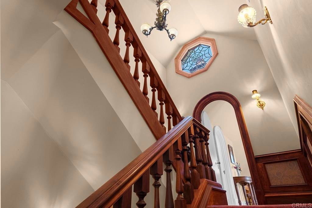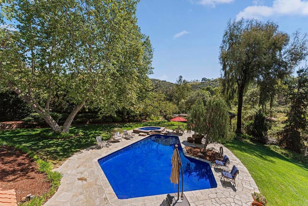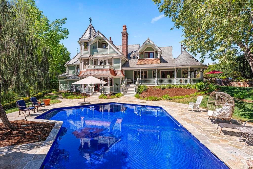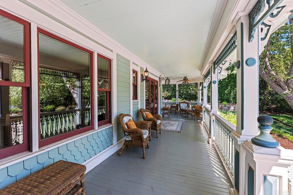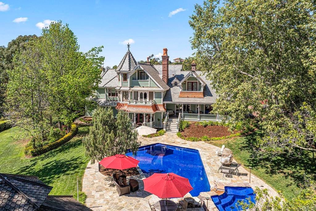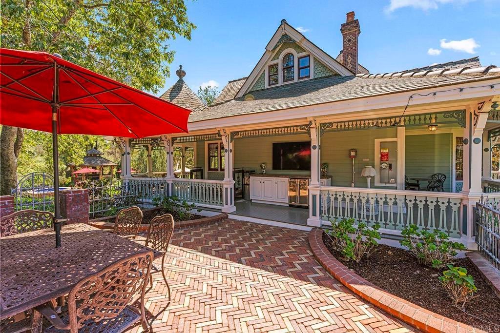 Looking for a quiet respite? This one-of-a-kind Queen Anne Victorian estate blends timeless architecture with modern comfort on over an acre of private, usable land in Vista’s desirable Warmlands. Custom-built by a Rancho Santa Fe master builder, the home showcases exceptional craftsmanship and attention to detail throughout. It features four ensuite bedrooms, each on its own level, with sitting areas, walk-in closets, and private baths. Three bedrooms offer private balconies overlooking the grounds, while the expansive primary suite includes a study, dressing room, spa-like bath, and distinctive architectural elements such as a turret, leaded glass windows, and a classic Victorian sleeping porch. From the 160-year-old iron entry gates to the hand-cut slate roof and hand-laid brick driveway, the property is rich with character. Antique lighting and hardware sourced from an 1850s Chicago hotel further enhance its authenticity. The main living spaces are both inviting and functional, offering a formal parlor, a billiards room with wet bar and fireplace, and kitchen featuring vintage-style appliances, a Sub-Zero built-in refrigerator, and French doors that open to the veranda. Designed for seamless indoor-outdoor living, the wrap-around covered veranda provides multiple seating areas, built-in speakers, and peaceful views of the surrounding landscape. The grounds include a mosaic-tiled saltwater pool and spa finished with beautiful sparkling Colorado Silverstone, a gazebo with fire pit, built-in BBQ, lush gardens, and a variety of mature fruit trees. A seasonal creek bed along the rear of the property enhances privacy, with open space and agricultural land beyond. Additional features include fully owned solar with battery backup and a Tesla charger. The lower portion of the property offers space for a future guest house or ADU, workshop, or sport court. Ideally located with convenient access to the 76 Freeway, this exceptional estate offers a rare combination of privacy, craftsmanship, and storybook charm.