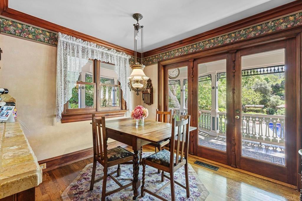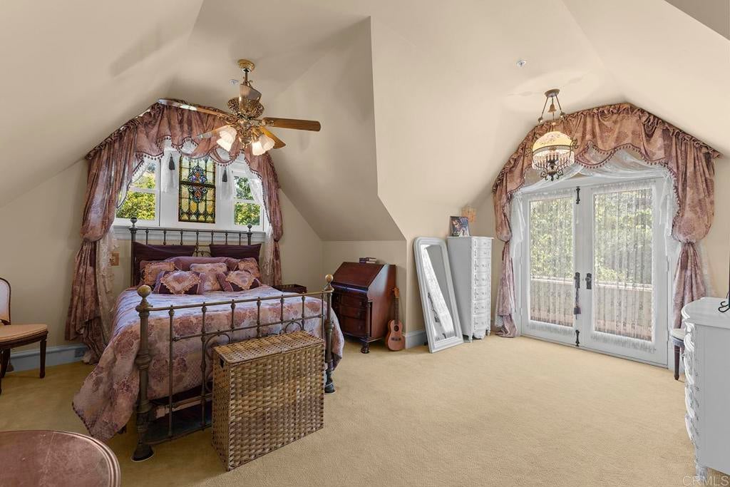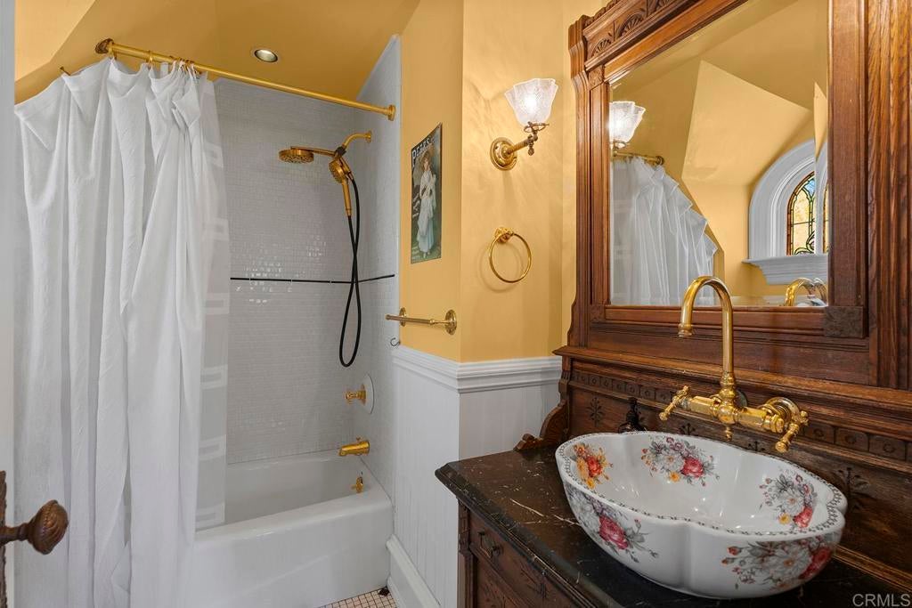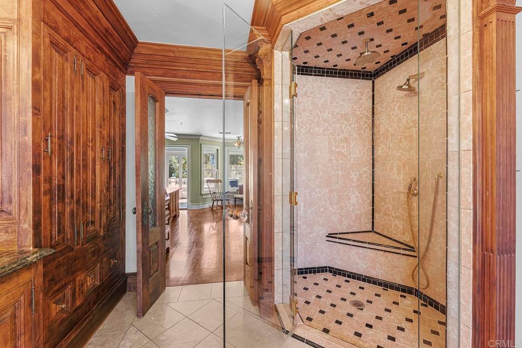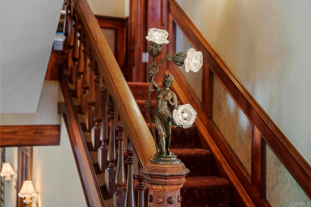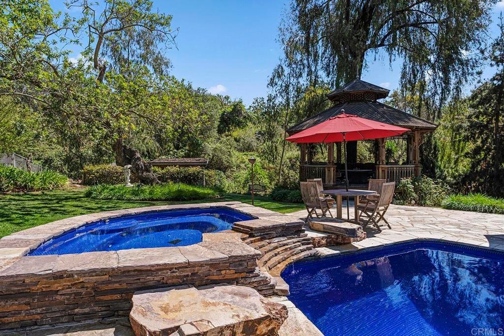 Looking for a quiet respite? This one-of-a-kind Queen Anne Victorian estate blends timeless architecture with modern comfort on over an acre of private, usable land in Vista’s desirable Warmlands. Custom-built by a Rancho Santa Fe master builder, the home showcases exceptional craftsmanship and attention to detail throughout. It features four ensuite bedrooms, each on its own level, with sitting areas, walk-in closets, and private baths. Three bedrooms offer private balconies overlooking the grounds, while the expansive primary suite includes a study, dressing room, spa-like bath, and distinctive architectural elements such as a turret, leaded glass windows, and a classic Victorian sleeping porch. From the 160-year-old iron entry gates to the hand-cut slate roof and hand-laid brick driveway, the property is rich with character. Antique lighting and hardware sourced from an 1850s Chicago hotel further enhance its authenticity. The main living spaces are both inviting and functional, offering a formal parlor, a billiards room with wet bar and fireplace, and kitchen featuring vintage-style appliances, a Sub-Zero built-in refrigerator, and French doors that open to the veranda. Designed for seamless indoor-outdoor living, the wrap-around covered veranda provides multiple seating areas, built-in speakers, and peaceful views of the surrounding landscape. The grounds include a mosaic-tiled saltwater pool and spa finished with beautiful sparkling Colorado Silverstone, a gazebo with fire pit, built-in BBQ, lush gardens, and a variety of mature fruit trees. A seasonal creek bed along the rear of the property enhances privacy, with open space and agricultural land beyond. Additional features include fully owned solar with battery backup and a Tesla charger. The lower portion of the property offers space for a future guest house or ADU, workshop, or sport court. Ideally located with convenient access to the 76 Freeway, this exceptional estate offers a rare combination of privacy, craftsmanship, and storybook charm.
