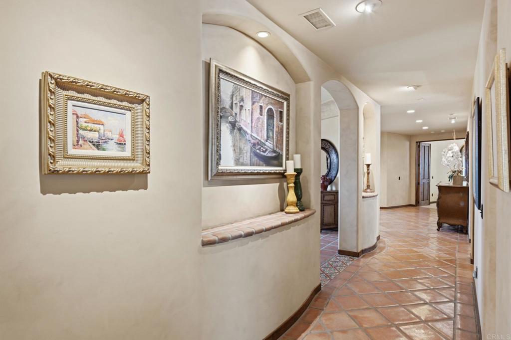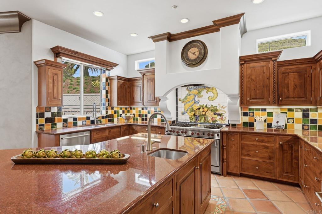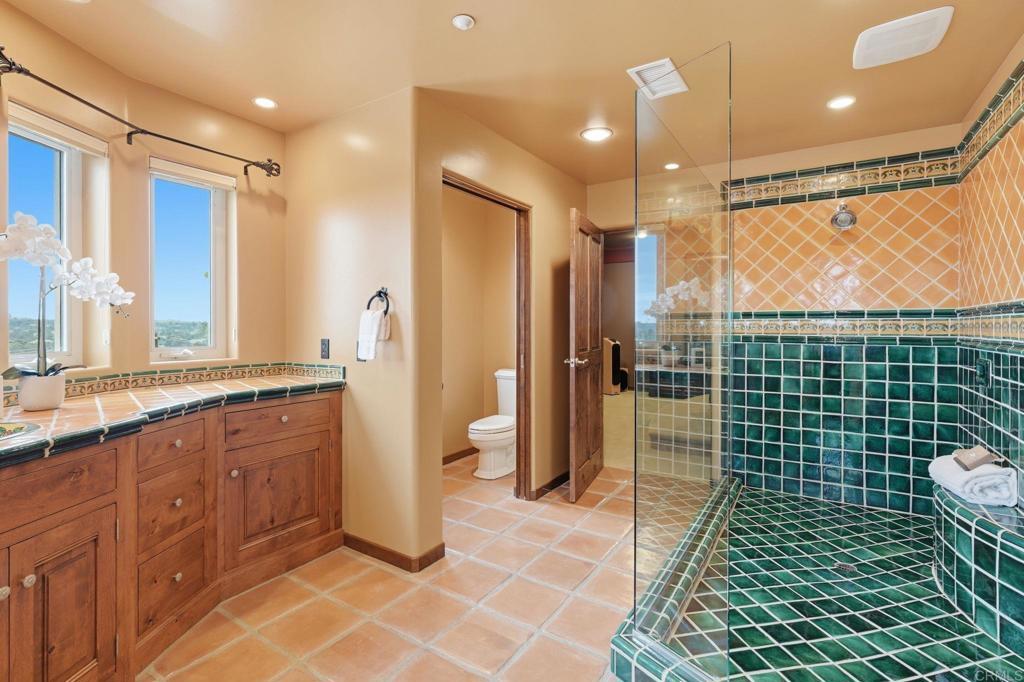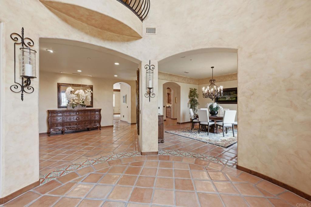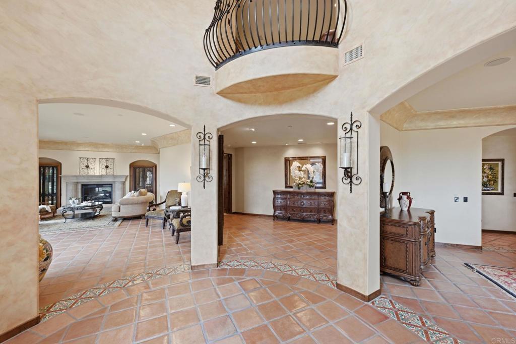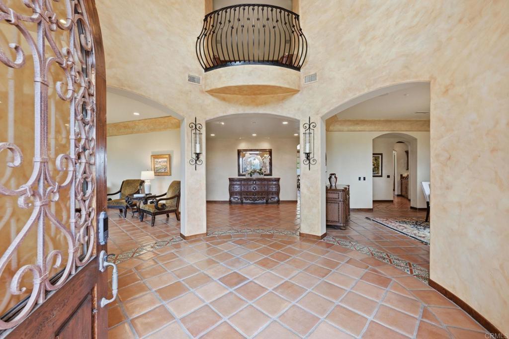 Enjoy panoramic views from this custom Spanish/Mediterranean-style Olivenhain hilltop estate. The home features high-end finishes, a grand two-story foyer, elegant living and dining rooms with arched windows with lovely views to the west, Tecate tile flooring, imported Talavera kitchen and bath tiles with matching custom bath sinks and expertly detailed custom doors & woodwork throughout. The main floor offers a spacious primary suite with two patios, luxurious bath, walk-in closet, a separate office with private entrance, guest ensuite, large kitchen with premium appliances, and family room with Alderwood built-ins and fireplace. Upstairs includes a second primary with ensuite and walk-in closet, additional bedroom with ensuite and walk-in closet, custom home theater room (convertible to a bedroom), and library with Juliet balcony overlooking the foyer. 4 HV-AC units with 6 zones and owned solar. The fully fenced backyard has a pool and spa with both gas and solar heat, and solar electric system. The acreage allows space for amenities like a sport court, stable or orchard. There is also an approximately 1,300 sq ft 4-car extra deep garage with storage in this private hilltop estate.