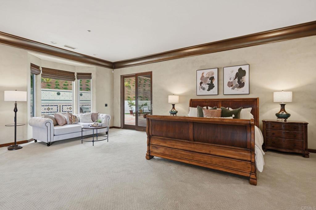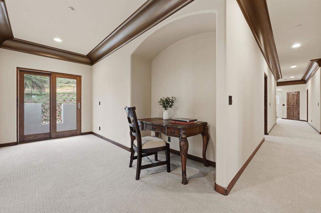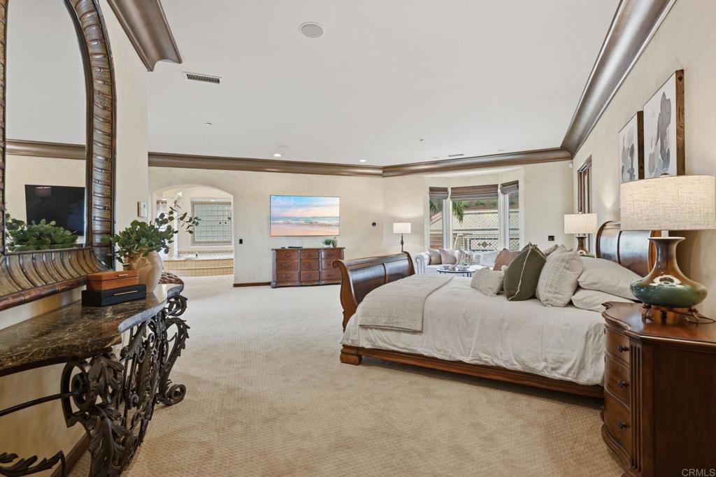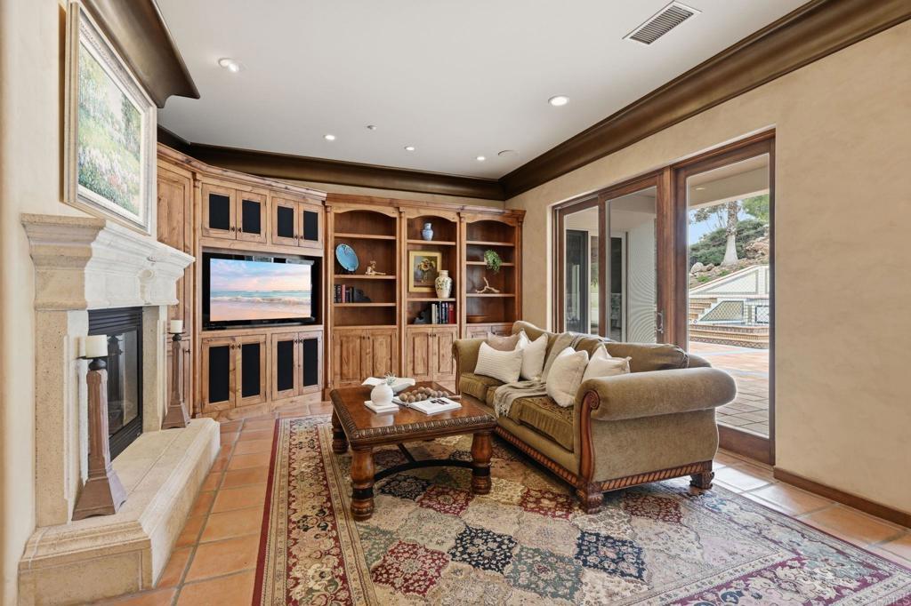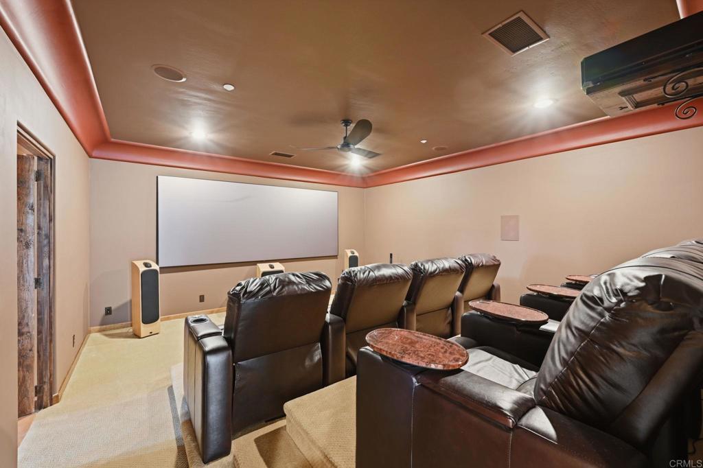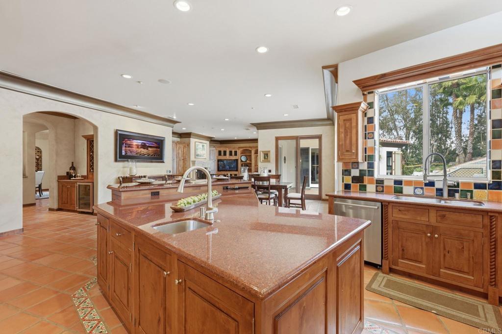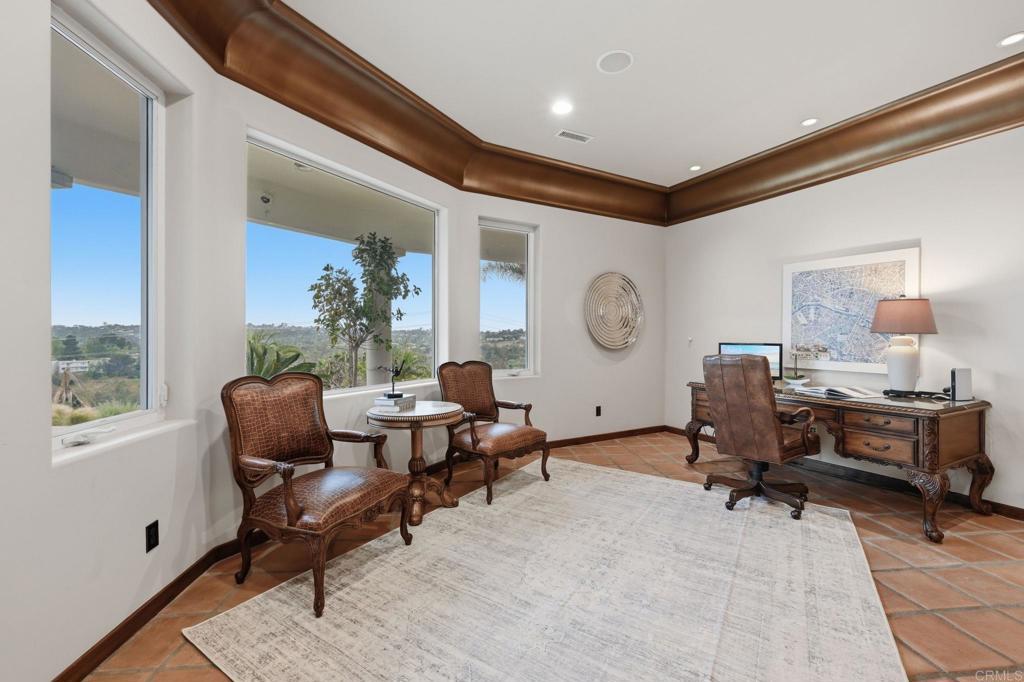 Enjoy panoramic views from this custom Spanish/Mediterranean-style Olivenhain hilltop estate. The home features high-end finishes, a grand two-story foyer, elegant living and dining rooms with arched windows with lovely views to the west, Tecate tile flooring, imported Talavera kitchen and bath tiles with matching custom bath sinks and expertly detailed custom doors & woodwork throughout. The main floor offers a spacious primary suite with two patios, luxurious bath, walk-in closet, a separate office with private entrance, guest ensuite, large kitchen with premium appliances, and family room with Alderwood built-ins and fireplace. Upstairs includes a second primary with ensuite and walk-in closet, additional bedroom with ensuite and walk-in closet, custom home theater room (convertible to a bedroom), and library with Juliet balcony overlooking the foyer. 4 HV-AC units with 6 zones and owned solar. The fully fenced backyard has a pool and spa with both gas and solar heat, and solar electric system. The acreage allows space for amenities like a sport court, stable or orchard. There is also an approximately 1,300 sq ft 4-car extra deep garage with storage in this private hilltop estate.