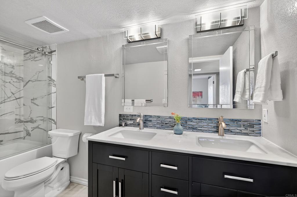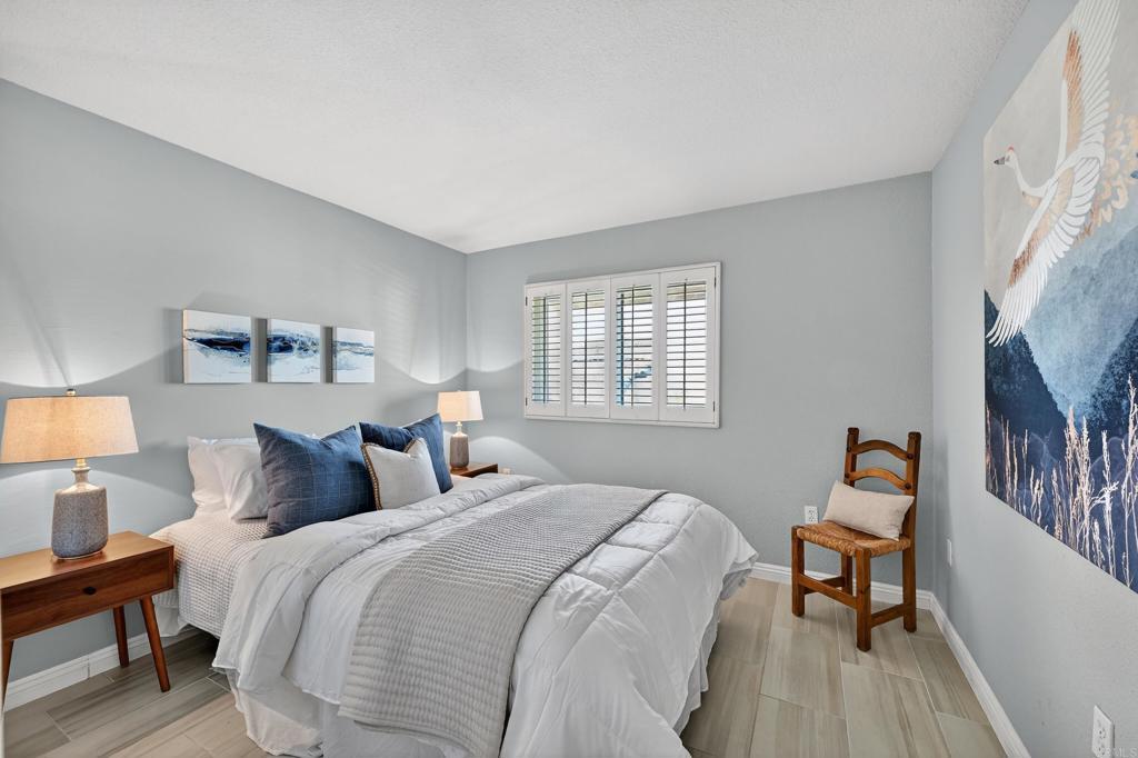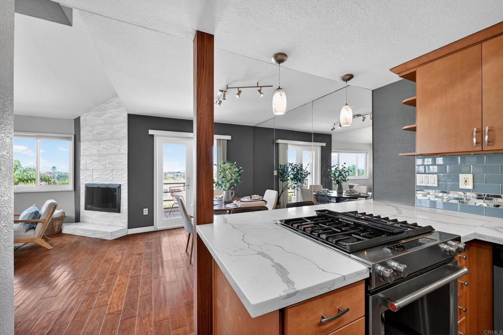 Rarely available in the gated community of Sea Crest, this beautifully updated townhome is steps from Beacons Beach and downtown Leucadia. This 3-bedroom, 2.5-bath home offers panoramic ocean views, 1,554 square feet of thoughtfully designed living space, rich wood flooring, and volume ceilings throughout. The kitchen features quartz countertops, a custom tile backsplash, and stainless steel appliances, opening naturally to the dining area and a private balcony with sunset and ocean views. The primary suite includes dual sinks, stone counters, and a custom tile shower. Two additional bedrooms downstairs share a fully remodeled bathroom with dual sinks, as well as a private patio, offering a quiet outdoor retreat. An attached two-car garage, indoor laundry, and ample storage add to the everyday convenience of this home. The private gated community includes a sparkling pool and lush landscaping with a neighborhood feel. Downtown Leucadia's restaurants, coffee shops, and beach culture are steps away, with easy freeway access nearby. Award-winning Encinitas Union School District.