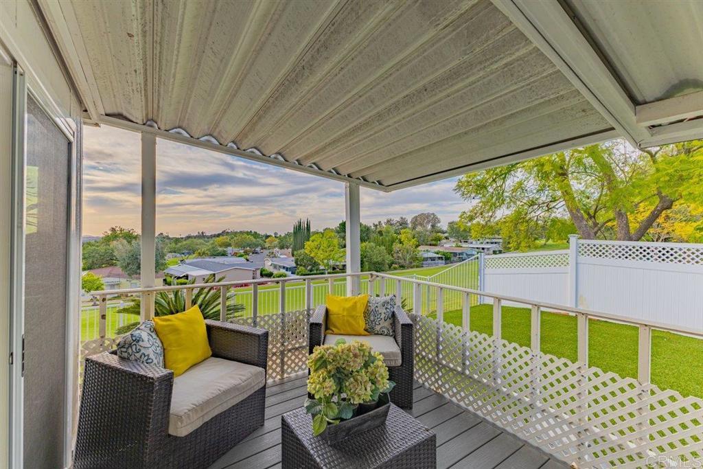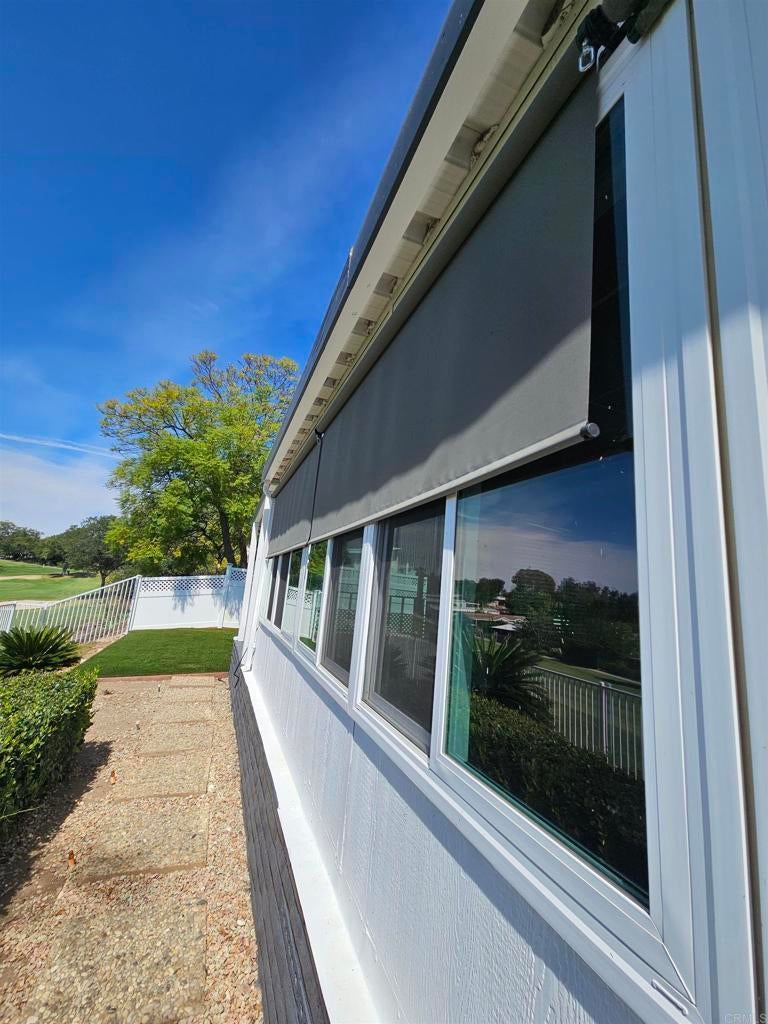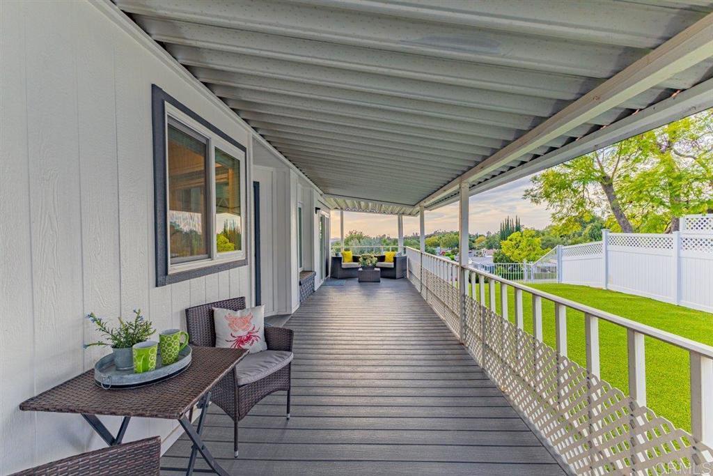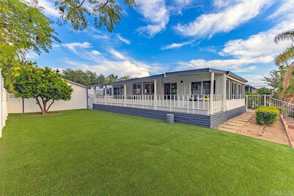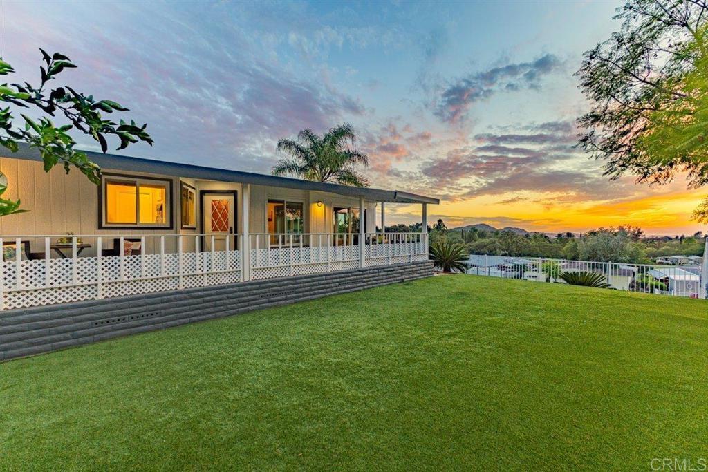 Amazing Sunset Views Overlooking Golf Course!! You’ll enjoy spectacular views from this spacious 2 br 2 bath mobile home in a very desired location above the golf course in Skyline Ranch Country Club. This 55+ gated community is a hidden gem in Valley Center, offering incredible amenities that include unlimited no fee golfing, a beautifully remodeled clubhouse with 2 pools, a huge jacuzzi and a separate gym. The park has a large fenced dog park, lovely nature trails, and optional affordable RV parking. This freshly painted home has many upgrades including a spacious trex deck and private fenced yard with lush turf that you and your pets will love, and an orange tree that produces delicious navel oranges year-round. Relax in your open living and dining area with vaulted beamed ceilings, and new sliding door that opens onto the outside deck. Your separate family room adjoining the kitchen also has a new sliding door that opens onto the outside deck. This home has a total of 1660 feet of living space. Your vehicles will be especially happy and protected in the 2-car detached garage, or beneath the roof of the extended carport that will accommodate 3 full size vehicles - plus you have a workshop that can double as a golf cart garage! Interior improvements include new Milgard dual pane tinted windows and sliders with custom cordless 2 ½” blinds throughout. Featuring stainless steel appliances, LVP flooring, plus a whole house Generac generator that will keep the entire house running in the event of a power outage! The HVAC, water heater, and roof are newer and in great condition. Skyline Ranch is Senior Living at it's best. You can be active with any of the many clubs or Clubhouse activities. They have swimming, BBQ/picnic area, dog park, walking trails, gazebo's for reading or enjoying nature, library, pool and ping pong tables, new gym, and there is always FREE golf on their SCGA approved golf course. Skyline Ranch is just minutes away from Valley View Casino and Bates Nut Farm. About an hour to beaches, downtown, mountains, and desert. Please come and visit.