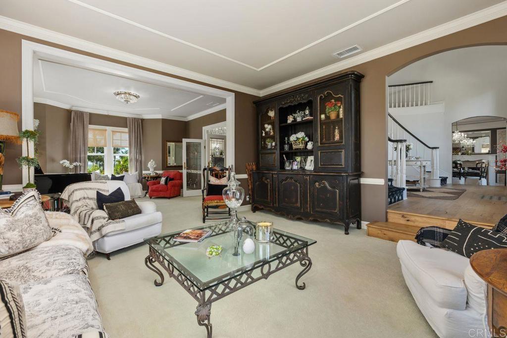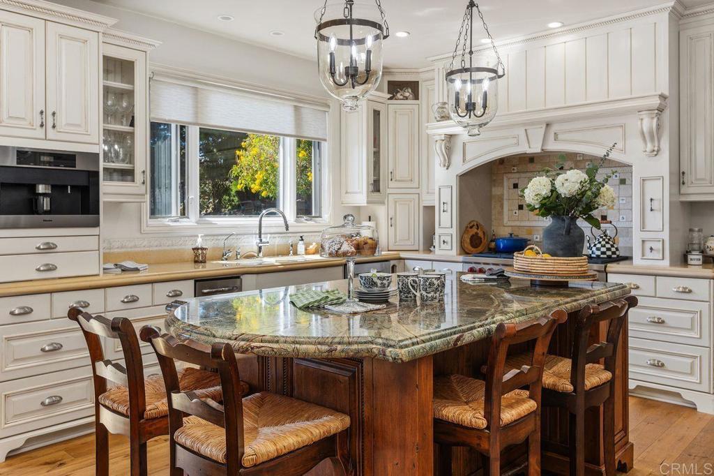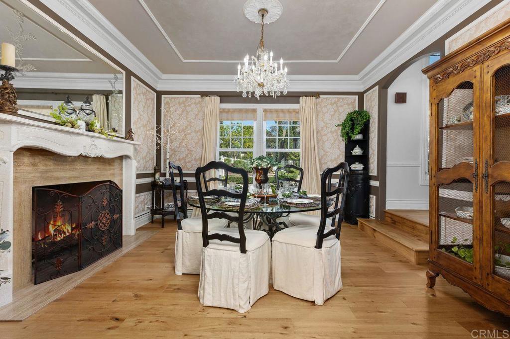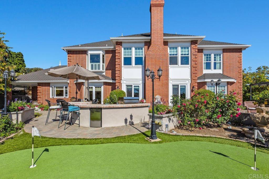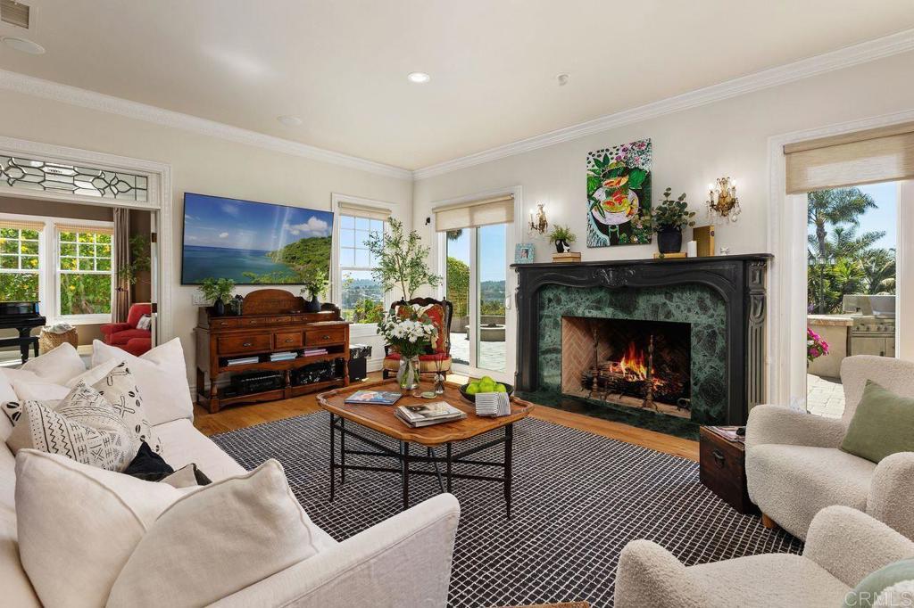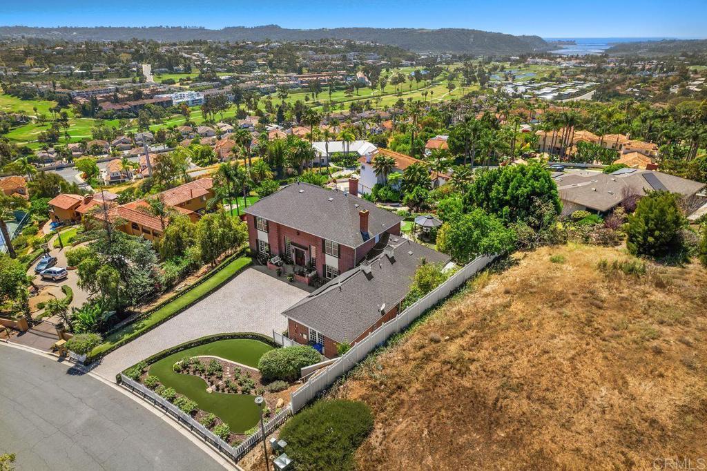 Commandingly positioned within prestigious La Costa Estates, this exceptional custom residence captures sweeping westerly views of the ocean, lagoon, and the Omni La Costa Golf Course—an extraordinary backdrop for refined coastal living. Thoughtfully crafted with impeccable attention to detail, the home features soaring ceilings and a well-conceived floor plan that flows effortlessly, creating a refined balance of openness, functionality, and comfort—ideal for both everyday living and sophisticated entertaining. A dramatic entry foyer showcases a grand, symmetrical double staircase, complemented by a crystal chandelier and custom hand-crafted tin ceiling. Designed for both function and style, the kitchen showcases a Wolf range, Miele coffee system, imported French limestone surfaces, and a custom Villeroy & Boch sink. The adjoining dining room presents a refined atmosphere with Venetian plaster ceilings, tailored wall treatments, and a statement stone fireplace. The primary suite offers a timeless and tranquil retreat, with ocean and golf course views extending from the bedroom into the spa-inspired bath, complete with a luxurious soaking tub and a large, walk-in shower. An expansive walk-in closet includes a versatile adjoining space ideal for a dressing room, office, or nursery. Set on approximately half an acre, the grounds evoke a private estate setting with beautifully manicured gardens, mature fruit trees, and multiple outdoor living spaces. A fully equipped outdoor kitchen and two outdoor firepits create inviting spaces for gathering, all framed by natural beauty and coastal sunsets. Throughout the home, multiple interior fireplaces, finely crafted custom built-ins, and high-end finishes reflect exceptional quality and craftsmanship, while a spacious multi-car garage adds both convenience and functionality. A rare offering where exceptional views, premier location, and timeless design come together.