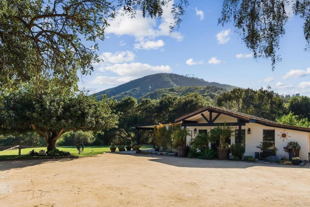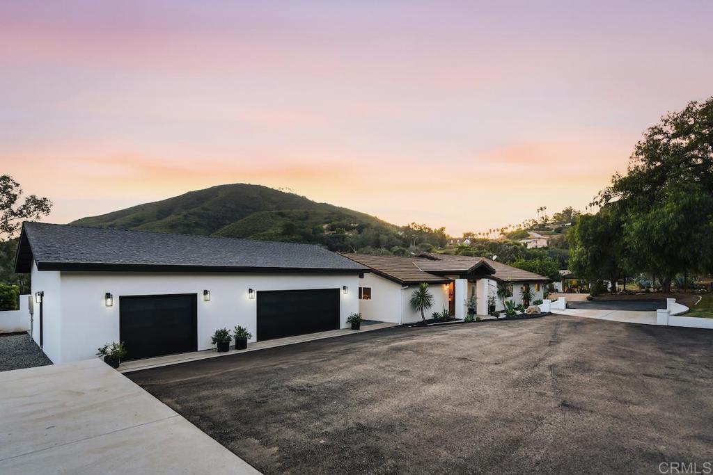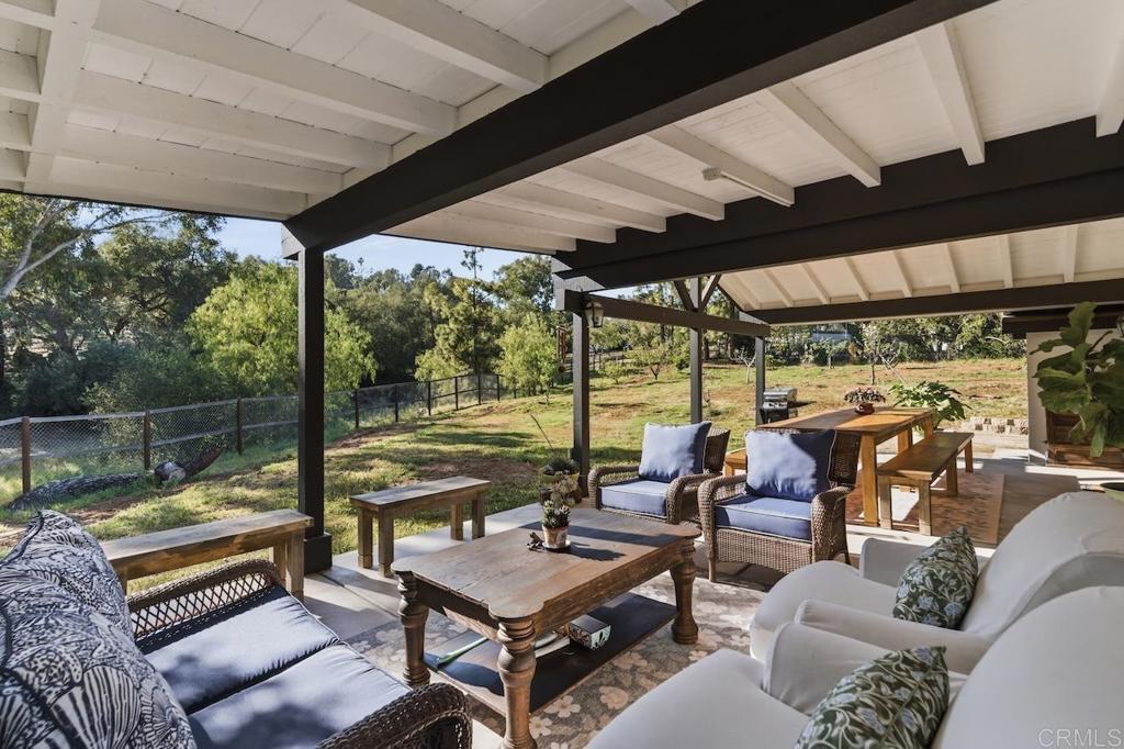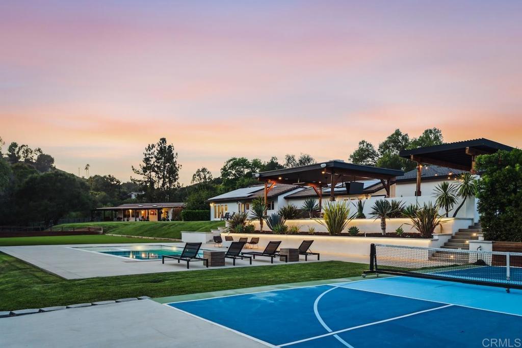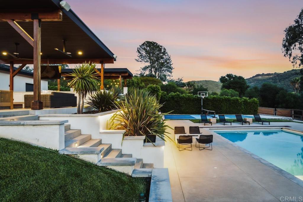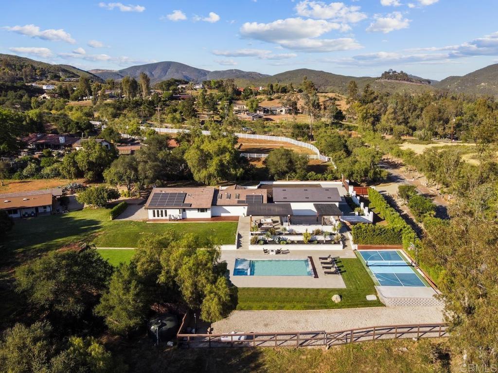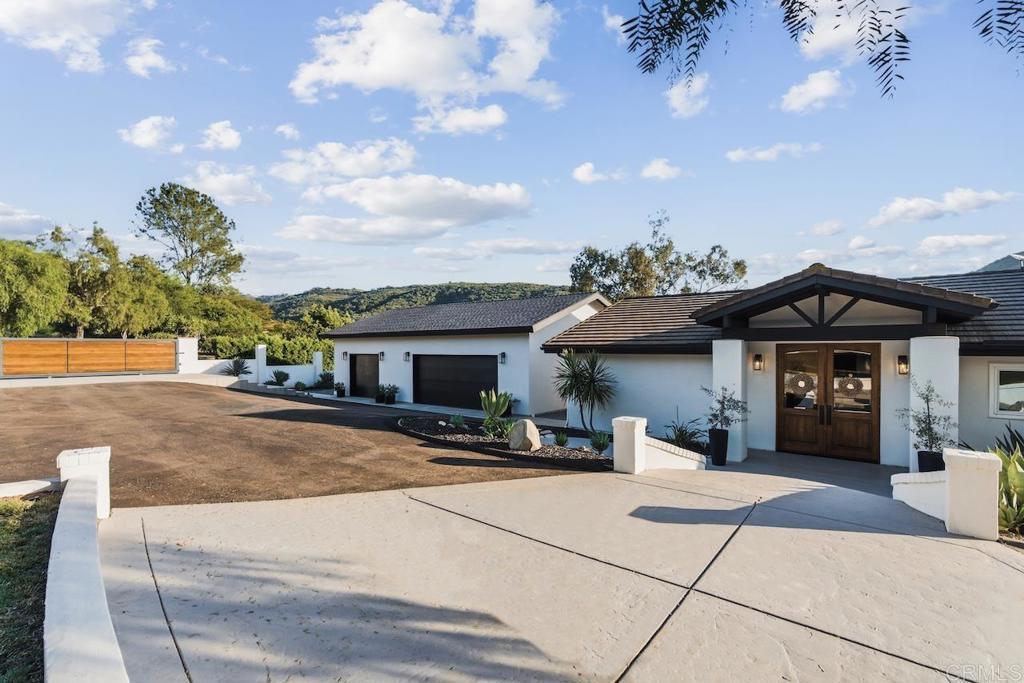 Privately gated and set on 2.5 acres in the coveted enclave of Elfin Forest, this stunning estate offers a rare blend of elevated style, usable land, and seamless indoor-outdoor living complete with a large guest house. The single-level residence is thoughtfully curated with wide plank white oak flooring, skylights, and designer finishes throughout. The kitchen is a true focal point, featuring custom cabinetry, quartzite countertops, a statement AGA range, and handcrafted Zellige tile. The primary suite opens directly to the backyard and is complemented by a beautifully appointed bath with custom tile work and a well-designed walk-in closet. The vast outdoor space offers a covered lounge with dual TVs, Bromic heaters, and Sonos system that all flows into an expansive dining area built for entertaining. The outdoor kitchen is equipped with a Lynx BBQ, Wolf warming drawer, and refrigerator. A heated pool with Baja step, spa, and firepit create a true resort-style setting, with a sport court (basketball and pickleball) and turf field adding to the recreation options. A detached 2 bed/2 bath guest home of 1,200 est.sq.ft. includes a kitchen, office nook, laundry, mini-split A/C and wrap-around covered patio space. Additional highlights include a 3-car garage with potential for a lift for car enthusiasts, Tesla leased solar, mature orchard and a well. Set against the Escondido Creek Preserve that offers miles of scenic trails, the property delivers a unique sense of space and privacy just minutes from coastal living, a combination that rarely becomes available. Zoned for Bernardo Elementary, Del Dios Middle, and San Pasqual High. Buyer and buyer's agent to verify all in MLS prior to COE.