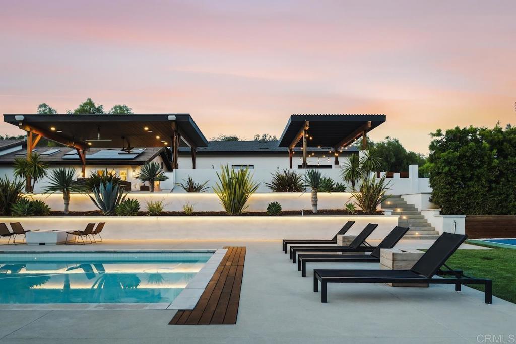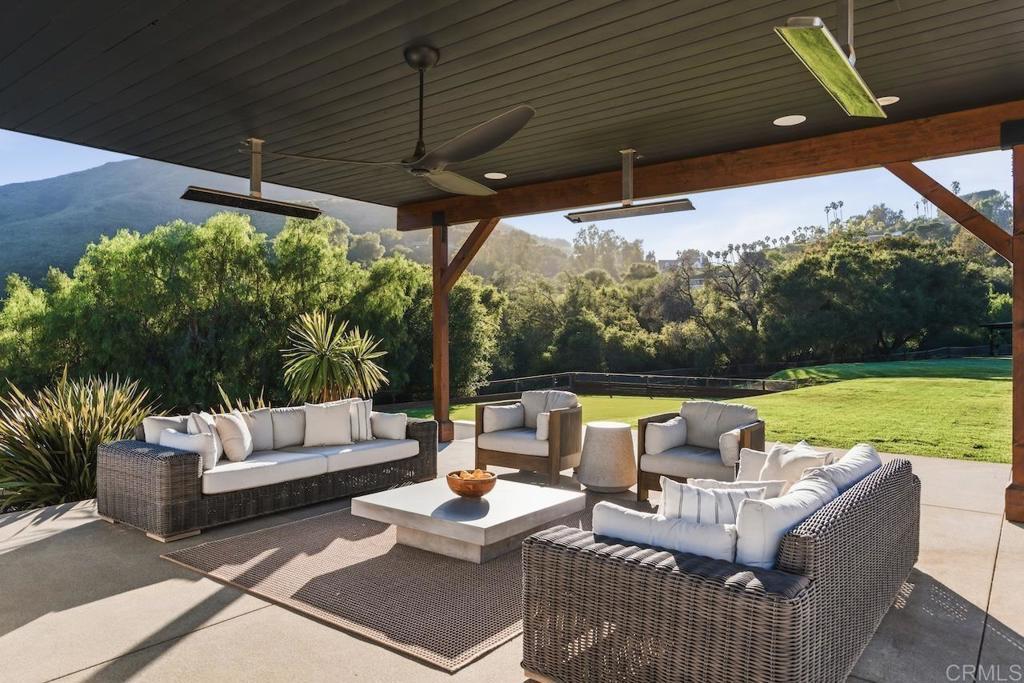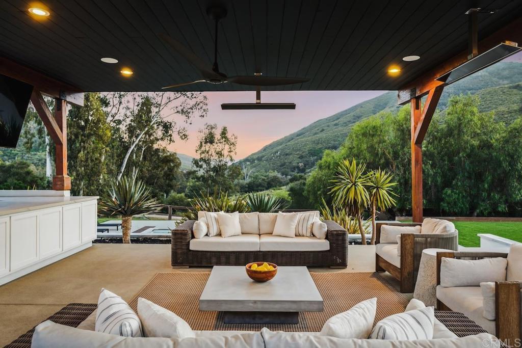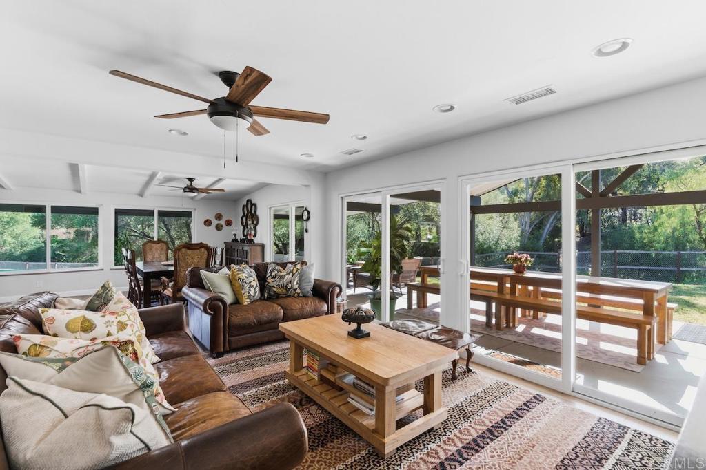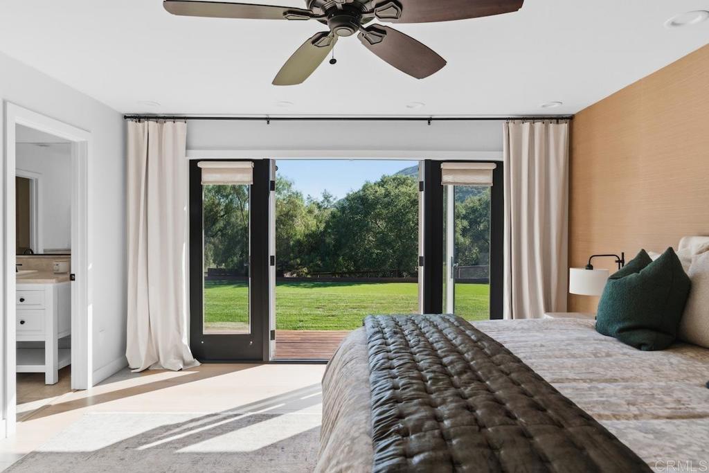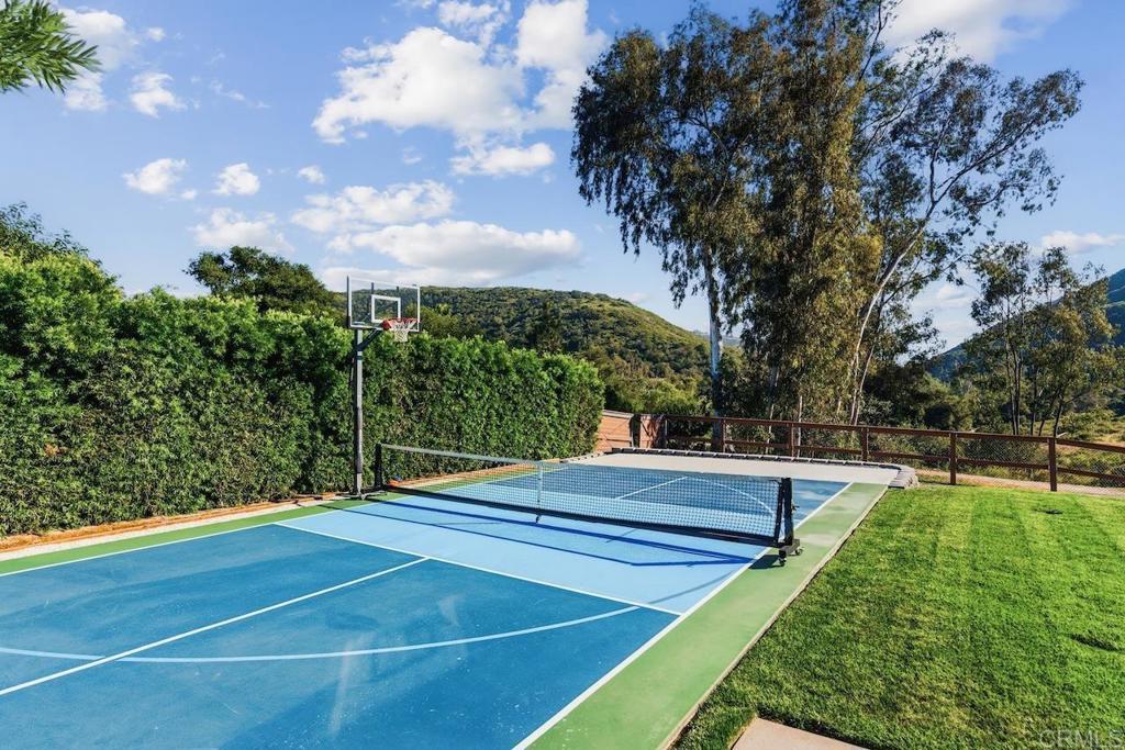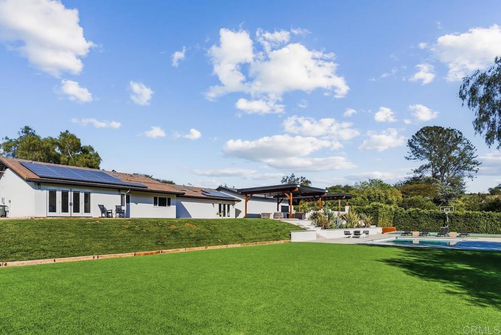 Privately gated and set on 2.5 acres in the coveted enclave of Elfin Forest, this stunning estate offers a rare blend of elevated style, usable land, and seamless indoor-outdoor living complete with a large guest house. The single-level residence is thoughtfully curated with wide plank white oak flooring, skylights, and designer finishes throughout. The kitchen is a true focal point, featuring custom cabinetry, quartzite countertops, a statement AGA range, and handcrafted Zellige tile. The primary suite opens directly to the backyard and is complemented by a beautifully appointed bath with custom tile work and a well-designed walk-in closet. The vast outdoor space offers a covered lounge with dual TVs, Bromic heaters, and Sonos system that all flows into an expansive dining area built for entertaining. The outdoor kitchen is equipped with a Lynx BBQ, Wolf warming drawer, and refrigerator. A heated pool with Baja step, spa, and firepit create a true resort-style setting, with a sport court (basketball and pickleball) and turf field adding to the recreation options. A detached 2 bed/2 bath guest home of 1,200 est.sq.ft. includes a kitchen, office nook, laundry, mini-split A/C and wrap-around covered patio space. Additional highlights include a 3-car garage with potential for a lift for car enthusiasts, Tesla leased solar, mature orchard and a well. Set against the Escondido Creek Preserve that offers miles of scenic trails, the property delivers a unique sense of space and privacy just minutes from coastal living, a combination that rarely becomes available. Zoned for Bernardo Elementary, Del Dios Middle, and San Pasqual High. Buyer and buyer's agent to verify all in MLS prior to COE.