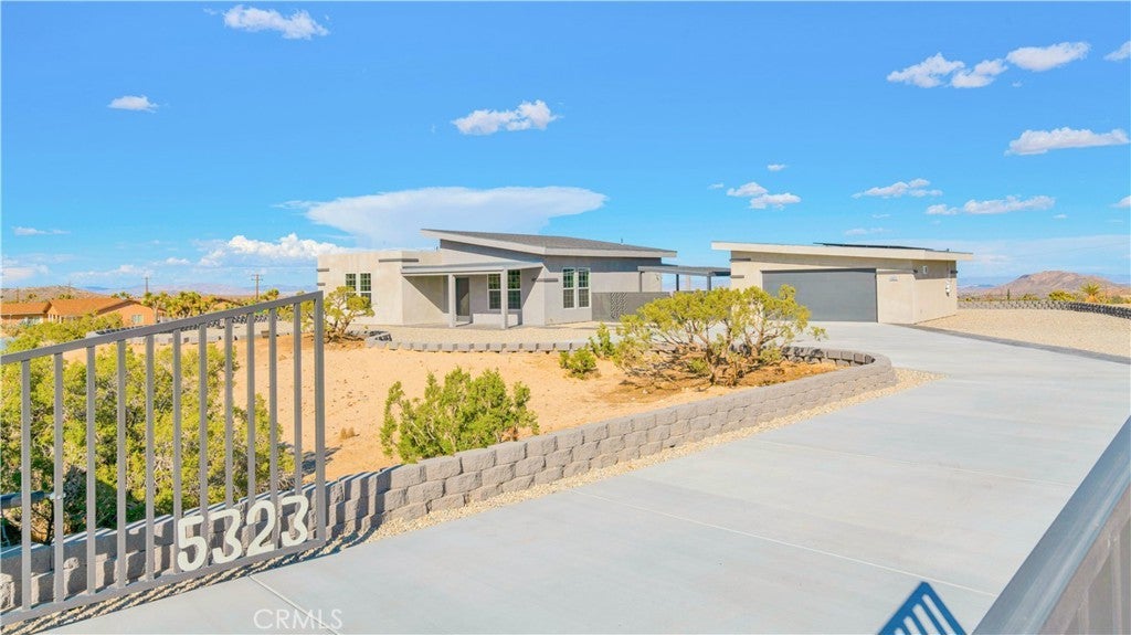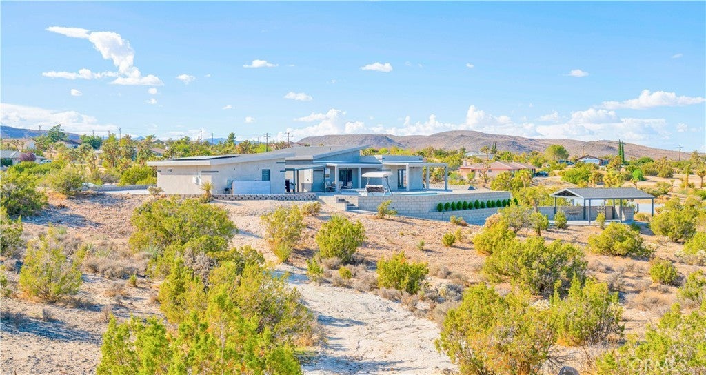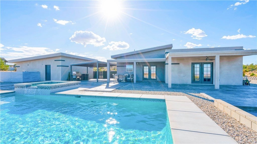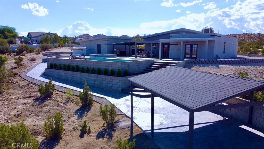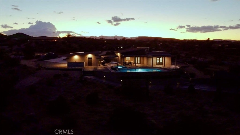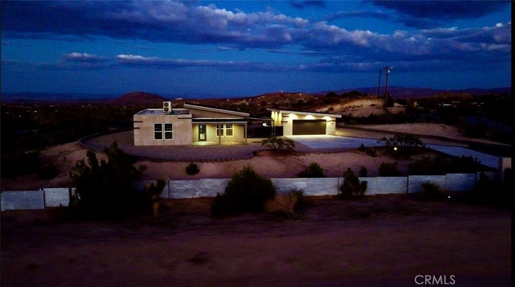 Crowning a 2.38-acre promontory in the serene heart of Yucca Valley, this 2022-crafted, single-story masterpiece is a symphony of elegance and innovation. Designed for visionaries with a taste for the extraordinary, this 3-bedroom, 2-bathroom sanctuary, unveils breathtaking vistas and an enclave of unparalleled privacy. Soaring 10-13 ft ceilings and expansive triple-pane argon windows bathe the interiors in desert light, with lustrous wood laminate floors weaving a thread of timeless chic. A 3500 kW solar system banishes electric bills, harmonized by 6-inch insulated walls and intelligent LED lighting that dances at your command. Graceful 4-ft hallways invite effortless movement, catering to every lifestyle. The gourmet kitchen, a culinary atelier, dazzles with Frigidaire stainless steel appliances, gleaming granite countertops, and a sculptural island bar, seamlessly merging with luminous living spaces for enchanted gatherings. Three palatial bedrooms, adorned with bespoke closet systems, offer serene retreats, while two bathrooms, with granite vanities, a decadent walk-in shower, a sumptuous soaking tub, and artisanal tilework, elevate daily rituals to spa-like indulgence. The private backyard is a dreamscape, where stepping stones lead to a crystalline pool, a rejuvenating spa, and an outdoor shower, framed by a courtyard with a gourmet barbecue and granite-clad prep table. Five covered patios beckon for starlit soirées or tranquil repose, while curated grounds, studded with iconic Joshua trees and lava rock accents, exude effortless splendor. A 48,000 BTU AC unit and Wi-Fi-enabled mini-split systems orchestrate perfect climate control, complemented by a cutting-edge security system. An in-home laundry suite and a 24x22 ft garage, with a Wi-Fi door, polished drywall, and climate control, marry function with finesse. Poised near Highway 247, yet a world away from urban clamor, this estate offers seamless access to Yucca Valley’s vibrant amenities. This is not merely a home—it’s a legacy of glamour, awaiting its next connoisseur. Embark on a virtual journey here and contact us to claim this celestial retreat.