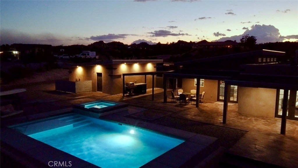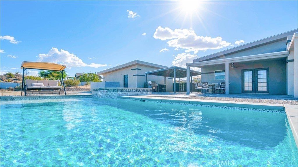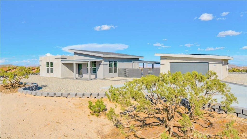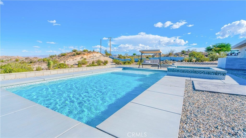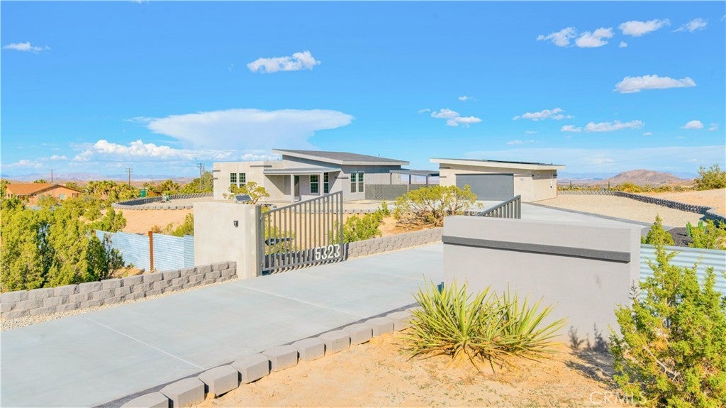 Crowning a 2.38-acre promontory in the serene heart of Yucca Valley, this 2022-crafted, single-story masterpiece is a symphony of elegance and innovation. Designed for visionaries with a taste for the extraordinary, this 3-bedroom, 2-bathroom sanctuary, unveils breathtaking vistas and an enclave of unparalleled privacy. Soaring 10-13 ft ceilings and expansive triple-pane argon windows bathe the interiors in desert light, with lustrous wood laminate floors weaving a thread of timeless chic. A 3500 kW solar system banishes electric bills, harmonized by 6-inch insulated walls and intelligent LED lighting that dances at your command. Graceful 4-ft hallways invite effortless movement, catering to every lifestyle. The gourmet kitchen, a culinary atelier, dazzles with Frigidaire stainless steel appliances, gleaming granite countertops, and a sculptural island bar, seamlessly merging with luminous living spaces for enchanted gatherings. Three palatial bedrooms, adorned with bespoke closet systems, offer serene retreats, while two bathrooms, with granite vanities, a decadent walk-in shower, a sumptuous soaking tub, and artisanal tilework, elevate daily rituals to spa-like indulgence. The private backyard is a dreamscape, where stepping stones lead to a crystalline pool, a rejuvenating spa, and an outdoor shower, framed by a courtyard with a gourmet barbecue and granite-clad prep table. Five covered patios beckon for starlit soirées or tranquil repose, while curated grounds, studded with iconic Joshua trees and lava rock accents, exude effortless splendor. A 48,000 BTU AC unit and Wi-Fi-enabled mini-split systems orchestrate perfect climate control, complemented by a cutting-edge security system. An in-home laundry suite and a 24x22 ft garage, with a Wi-Fi door, polished drywall, and climate control, marry function with finesse. Poised near Highway 247, yet a world away from urban clamor, this estate offers seamless access to Yucca Valley’s vibrant amenities. This is not merely a home—it’s a legacy of glamour, awaiting its next connoisseur. Embark on a virtual journey here and contact us to claim this celestial retreat.