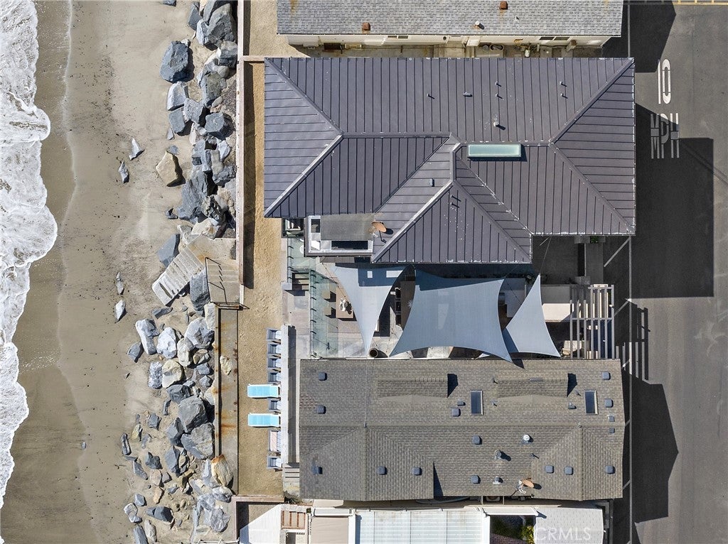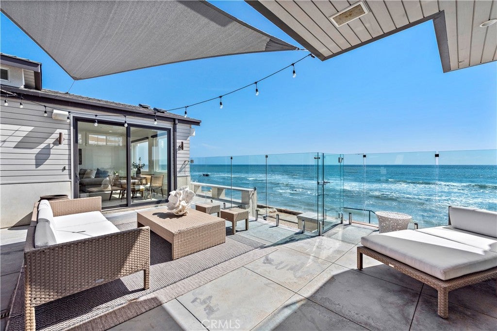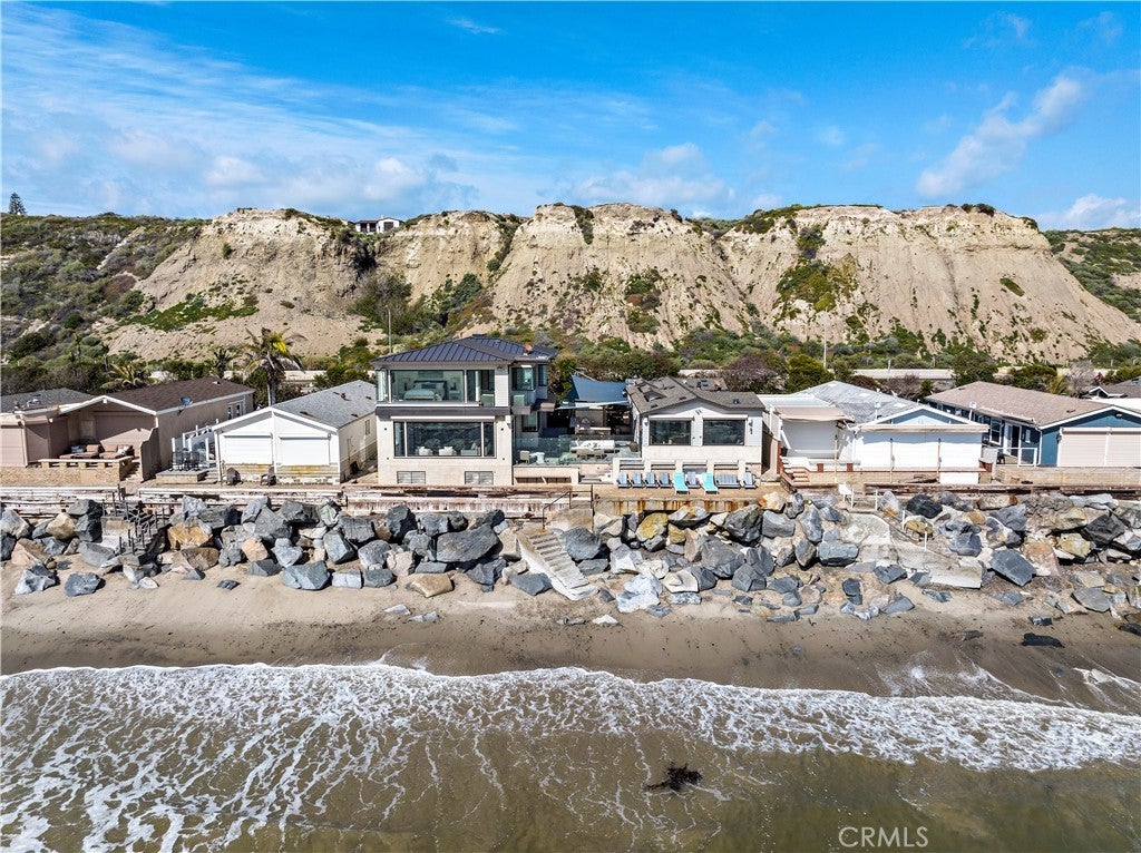 Set on the sand in the exclusive Capistrano Shores community, this rare double homesite offers ultimate California beachfront living, with panoramic whitewater, sunset, coastline, and beach views that stretch from the San Clemente Pier through the Headlands of Dana Point. Contemporary and highly upgraded, the main home provides four bedroom, four bathrooms, and the second home provides three bedrooms, 2 bathrooms. Lush outdoor space is equipped with security doors, tons of seating, a built-in BBQ and bar area, a storage area for all your beach accessories, and a partial glass enclosure for protection from the natural elements. The chic kitchen includes an oversized island, a large breakfast nook, a wet bar, and a full-size wine cooler with ample pantry storage space open to the well-appointed living room with a fireplace and security shutters to form a spectacular great room. Ocean views beyond comparison are throughout the open concept floor plan created by high ceilings, massive seamless windows, and stackable glass doors that lead to a spacious private courtyard. A laundry room, a bonus room, a three-quarter bath, a bedroom, and a powder room, both offering outdoor access, complete the bright and airy main level. The second level offers a large skylight, revealing a primary suite with panoramic ocean views, a windowed spa-like bathroom, a walk-in closet, and a deck with coastline views. Two additional bedrooms, a bathroom, a playroom equipped with a media stage, and built-in toy bins complete the second level. Additional highlights include porcelain tile flooring and wainscotting throughout, designer lighting and plumbing fixtures, electric window shades, security shutters, plantation shutters, multiple ceiling fans, A/C, built-in audio, golf cart parking, and four parking spots with an EV charging. Capistrano Shores is well located, with easy access to downtown San Clemente and its robust dining scene. Moments from scenic beach trails and community parks and located within an hour of most Southern California attractions. Experience the bliss of coastal living with this remarkable beachfront trophy property.