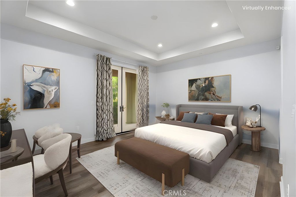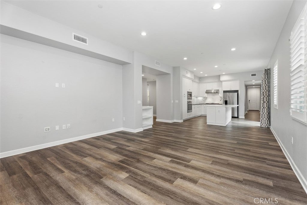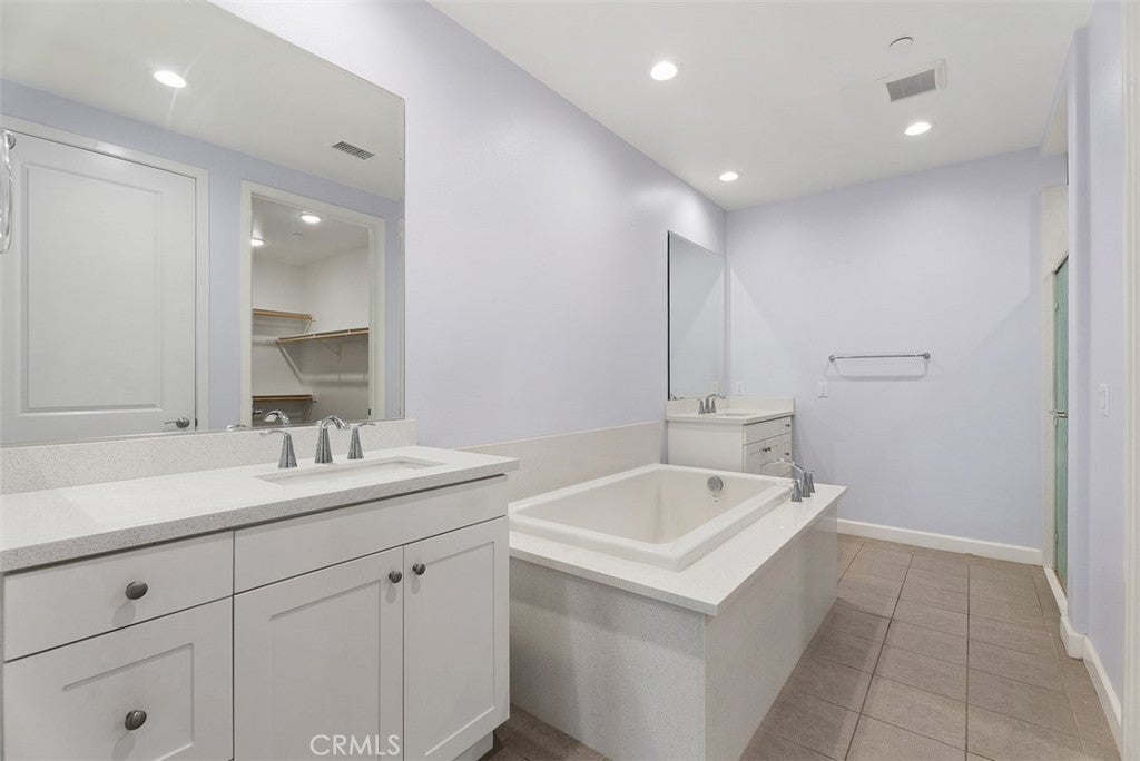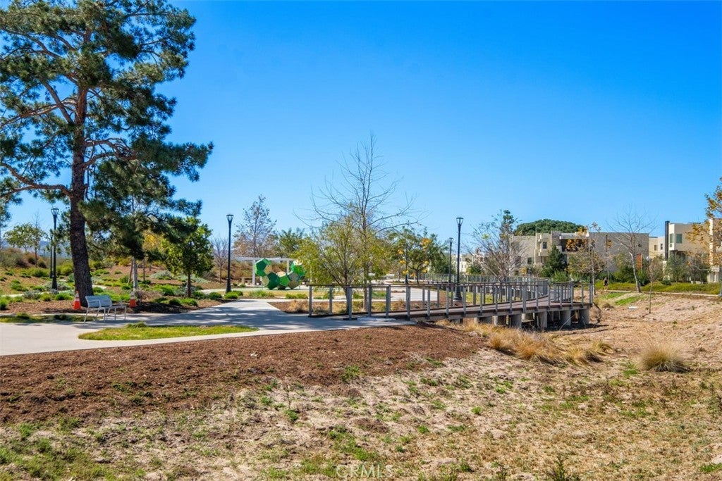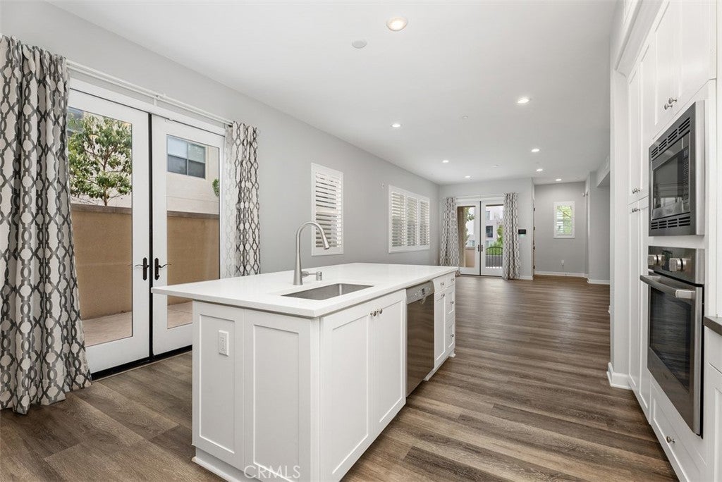 Upgraded 3-bedroom, 2-bath ground-floor condo located in Irvine’s Great Park neighborhood, featuring an open-concept layout with wide-plank laminate flooring, plantation shutters, and recessed lighting. The kitchen offers Bosch appliances, quartz countertops, a modern backsplash, and a large island. French doors lead to two private patios. One off the kitchen, and another from the primary suite with a soaking tub, roll-in shower, and dual vanities. Additional highlights include a full laundry room, custom entryway cabinetry, and an attached 2-car garage with epoxy flooring, EV charger, and tankless water heater. Community amenities include parks, trails, and access to public schools, with convenient proximity to major transportation routes.