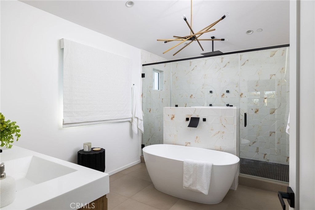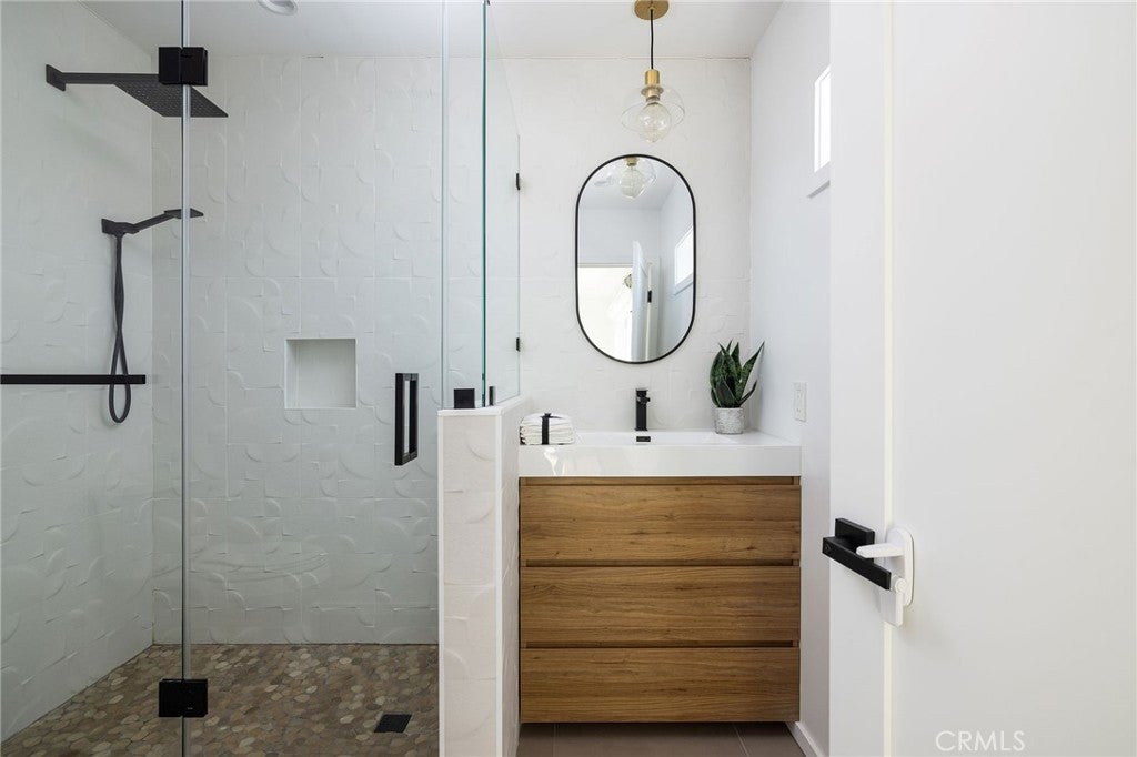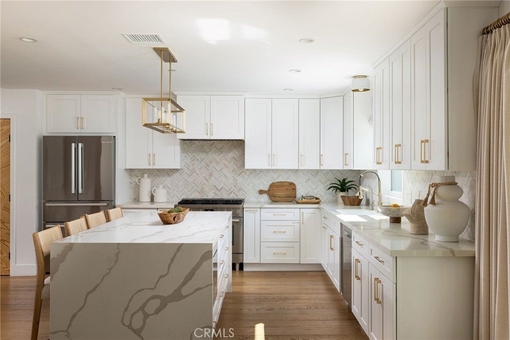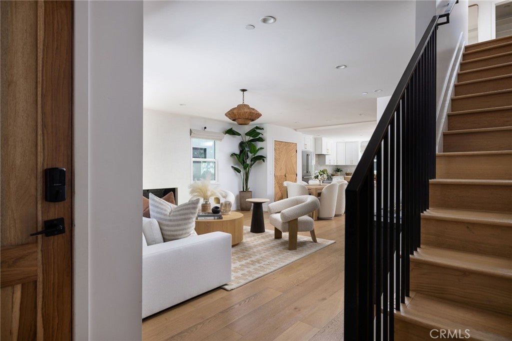 Set within Seal Beach’s coveted “Hill” neighborhood, this reimagined coastal retreat pairs effortless sophistication with thoughtful modern design. Every space reflects harmony and light—crafted for connection, comfort, and California living at its best. Spanning approximately 2,874 square feet, the home showcases wide-plank oak floors that flow through open living and dining areas framed by soft textures and natural tones. Warmth emanates from a sculptural fireplace in the living room, complemented by custom millwork and designer lighting that create an atmosphere of understated luxury. Centered around a dramatic waterfall island wrapped in veined quartz, the kitchen blends beauty and function with minimalist cabinetry, chevron-patterned backsplash, brass accents, and integrated high-end appliances. Upstairs, the primary suite evokes boutique-hotel serenity with a sleek fireplace, custom built-ins, and a spa-inspired bath featuring a freestanding soaking tub, dual vanities, and a dual-entry shower with multiple sprays. Two main-level bedrooms offer flexibility for guests or a home office. Lush landscaping frames a private backyard designed for alfresco dining and relaxation in the coastal air. Additional highlights include a dedicated laundry room, and an attached two-car garage. Modern elegance, effortless livability, and a premier Seal Beach location combine to define the art of refined coastal living.