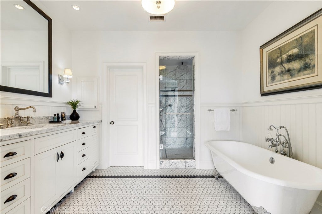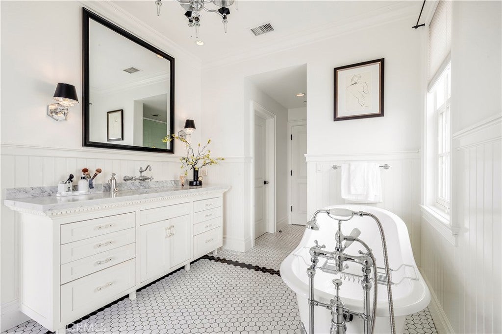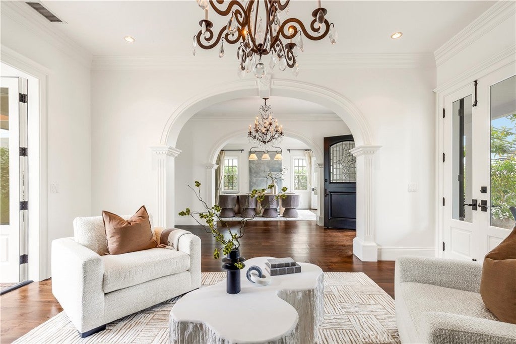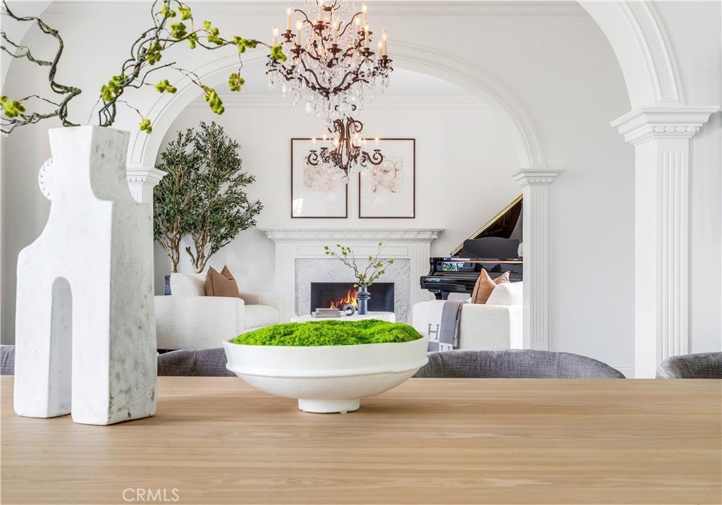 Plantation Estate blends exemplary designer finishes with timeless architectural elements in a sprawling and refined 4-bedroom residence. An impressive front yard sets the tone for the grandeur found within, while an opulent entry introduces the generous scale and thoughtful design throughout. The expansive living room is highlighted by a fireplace and framed by multiple sets of French doors that lead to the front porch and a spacious central courtyard - ideal for indoor-outdoor entertaining with a built-in speaker system that carries throughout the interior and exterior spaces. Arched transitions lead to an elegant formal dining room, where walls of French doors offer views and access to the private grounds. The family room features a dramatic stacked masonry fireplace with a substantial mantle and flows into a kitchen outfitted with exquisite marble countertops, abundant custom cabinetry, an oversized island, dual breakfast bars, a six-burner range with griddle, double ovens, wine tower, walk-in pantry and inclusive office nook. A unique butcher block countertop - repurposed from an 1800s New Orleans restaurant -adds character and history. The grand primary wing hosts a stately fireplace, private balcony, and two completely separate, spa-inspired bathrooms, each appointed with Carrara marble, and each feature a soaking tub, walk-in shower, elegant vanities, detailed wainscoting, and their own custom walk-in closets. Three additional bedrooms complete the guest wing, including one thoughtfully converted into a state-of-the-art media room with direct access to a spacious terrace. Additional amenities include a three-zone HVAC system and an integrated indoor/outdoor speaker system for effortless entertaining. Experience the best of the Newport Beach lifestyle in this desirable Newport Heights location - moments from top-rated schools, Cliff Drive Park, and premier shopping and dining.