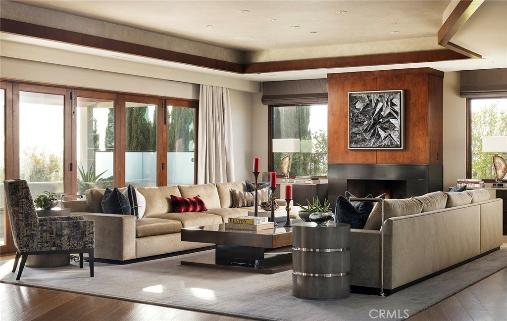 Located in the prestigious beachside community of Cameo Shores in Corona del Mar, this impressive residence presents nearly 6,000 sf of single level living, plus 900 sf of lower level entertaining space on an elevated parcel of over 12,000 square feet. Behind the gated entry, reveals a warm and welcoming floor plan complemented by a private outdoor oasis with a sparkling pool, relaxing spa, firepit and several seating and dining vignettes. The abundance of space is felt throughout the residence, with voluminous ceilings and natural light permeating through walls of glass. Ocean views are experienced and enjoyed by the south-facing patio and adjacent living and dining rooms. The culinary kitchen with a fifteen-foot island is a central gathering space for the home, harmonizing living, dining and outdoor spaces. A secondary kitchen & bar provide convenient service to the central pool space, while an ideally placed media room with bi-fold doors extends the indoors to outdoors. Interior finishes are elegant while providing a subtle palette of textures. Solid wood flooring anchors the natural stone countertops, custom wall coverings accent the cabinetry, sophisticated lighting, and automated window shades & curtains functionally finish ease of living. The home is equipped with full home automation by Control4 which manages lighting, audio/visual, heating & air, shades and security. The main level primary suite encompasses an entire wing of the home, starting with an executive office. Just beyond is the spacious primary bedroom with fireplace, additional seating and private access to the pool and spa is discovered. Dual vanities, custom cabinetry, a stone & glass shower, and tub thoughtfully detail this tranquil space. A perfect finale to the primary suite is a closet featuring a center island with dual-sided drawers and enclosed wardrobes. The functionality of this home is further exemplified with four-bedroom suites and two powder bathrooms. Additionally, enjoy a subterranean level with a 4-car garage, wine cellar, full bathroom, and a state-of-the-art movie theater with entertaining bar. A rarely found rooftop deck is a rare perk in Cameo Shores, offering breathtaking panoramic ocean views. Cameo Shores affords gated beach access to three neighborhood beaches and Crystal Cove State Beach, along with a short stroll to countless amenities, shops and restaurants along PCH.