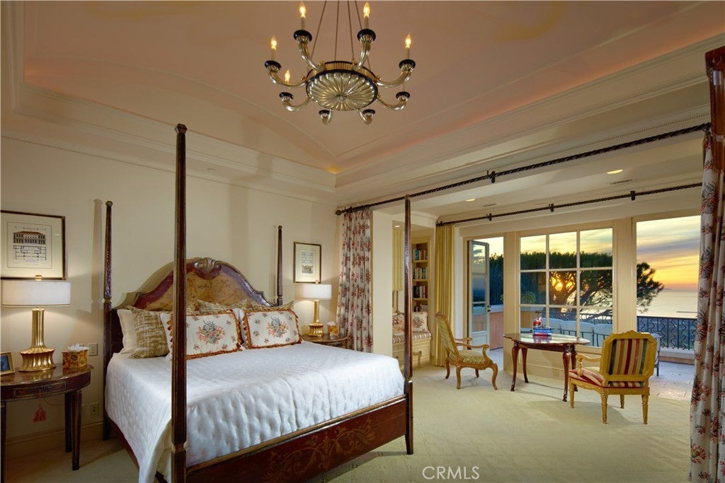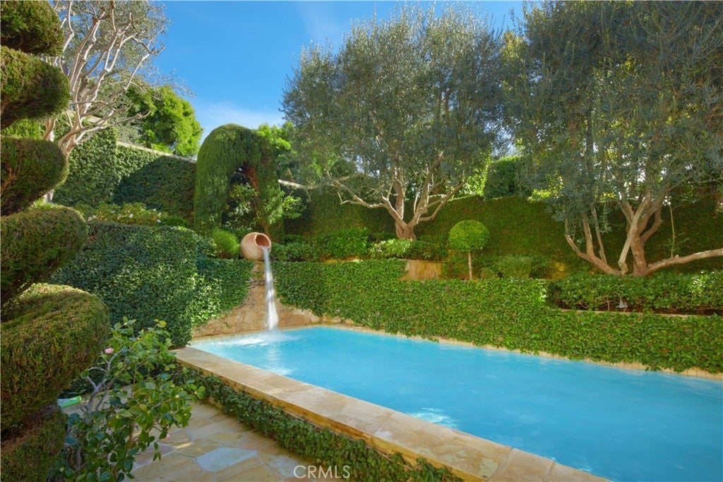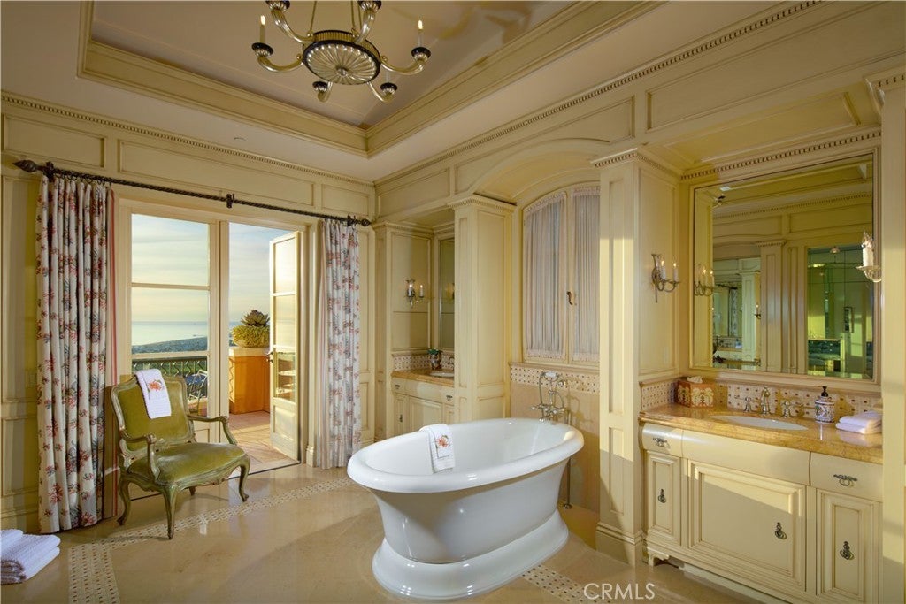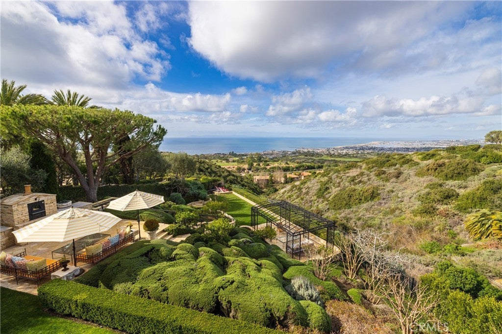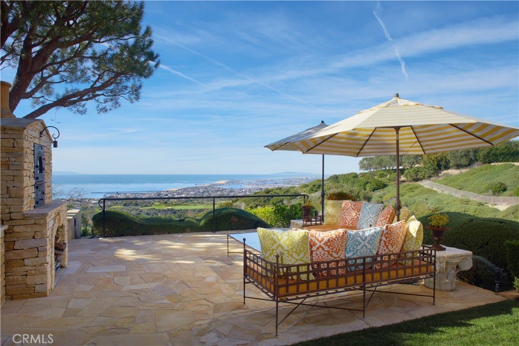 Ever-changing by day and night, the phenomenal panoramic views of 'Villa Saffron' are in a league of their own. They are experienced from both levels of the St. Tropez-inspired villa at guard-gated Pelican Crest in Newport Coast. The immersive vistas stretch across lush fairways, a canyon, the azure waters of the Pacific Ocean, Newport Harbor, San Clemente and Santa Catalina Island. Enchanting city lights reach as far as Palos Verdes. The terraced grounds tower 604 feet above sea level. They command front-row views that complement a backyard with upper and lower terraces, four lawn areas, loggias, custom fireplace/wood-burning pizza oven. The outdoor kitchen features a built-in 48" Lynx BBQ. Located close to the end of a private cul-de-sac, the villa showcases exquisite landscaping, a walled and gated front yard with a limestone colonnade pool, and a large, fireplace-warmed atrium. Spanning nearly 26,092 SF, the estate’s sumptuous homesite by EBTA architects, built by PrideMark, compliments an opulent interior that extends approximately 8,176 SF. It features four en suite bedrooms (one at entry-- currently used as an office), four full baths, and two half baths. An inviting foyer and grand staircase provides an elegant introduction to living areas including a media room, sunny office with enchanting views, a circular formal dining room surrounded by columns, and a spacious great room with an ornate hand-carved limestone fireplace. The chef’s kitchen boasts an oversized island, ocean-view breakfast room, butler’s pantry, two sinks, stone countertops, custom cabinetry, built-in side by side Sub-Zero refrigerator/freezer, steam oven, six-burner Wolf range, and double ovens. Note worthy materials include stone imported from France and Italy, antique French pavers, French white oak flooring, along with custom-made steel windows and French doors. All rooms except the media room offer access to an outdoor patio, terrace, loggia, or Juliet balcony, with the ocean-view primary suite boasting two decks, pocket doors at its entrance, a sitting room, two walk-in closets with custom built-ins, retractable sun shade, and luxe bath featuring a soaking tub and separate shower. Additional highlights include a 350+ bottle temperature-controlled wine cellar, wet bar, EV charging, full house water filtration and soft water by Water Techniques, Sonos sound system, Lutron lighting, as well as the option to build an ADU on the terraced lot with a spectacular view.
