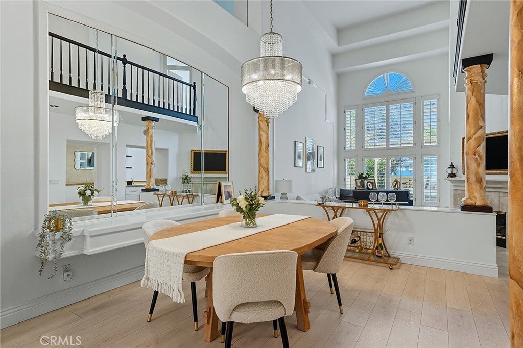 Nestled within the exclusive gated community of Bella Vista, this beautifully appointed residence offers the perfect blend of comfort and elegance. Spanning approximately 2,549 square feet, the home features three bedrooms, two-and-a-half bathrooms, a loft, and a rare three-car garage enhanced with epoxy flooring and custom cabinetry. Inside, you’re greeted by dramatic 18-foot ceilings, a grand curved staircase, and expansive windows that fill the home with natural light and create an open, airy ambiance. The formal living room is highlighted by a fireplace and soaring two-story windows, while the adjacent dining room showcases elegant architectural columns and mirrored accents. The gourmet kitchen features custom soft-close cabinetry, a gas cooktop, double ovens, and a spacious casual dining area that opens to the inviting family room with a fireplace and direct access to the backyard. Upstairs, the primary suite serves as a private retreat with its own fireplace, spa-inspired bathroom with dual vanities, a soaking tub, separate shower, and a generous walk-in closet. A versatile loft—currently used as a gym—along with two secondary bedrooms and a full bath complete the upper level. The private backyard oasis is ideal for entertaining and relaxation alike, offering a pergola and built-in BBQ. Additional highlights include an indoor laundry room. Residents of Bella Vista enjoy a gated entry, community pool and spa, ample guest parking, and beautifully maintained grounds. Conveniently located near parks, hiking trails, shopping, dining, theaters, and top-rated schools, this home perfectly combines resort-style living with everyday ease.